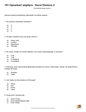 191 Opowieść wigilijna - Karol Dickens 2 Test jednokrotnego wyboru Zaznacz jedną prawidłową odpowiedź na każde pytanie. 1. Ile duchów odwiedziło bohatera? a) b) c) d) 2 3 4 5 2. W jakim mieśćie toczy się akcja utworu? a) b) c) d) Nowy Jork Londyn Warszawa Chicago 3. Ile czasu minęło od śmierci Marley`a do czasu teraźniejszego w utworze? a) b) c) d) 5 lat 7 lat 2 miesiące 4 miesiące 4. Pierwszy duch zaprowadził głównego bohatera do domu rodzinnego, szkoły, lat dziecinstwa i małego Scrooge. a) b) Prawda Fałsz 5. Jak miała na imię siostra od Scrooge? a) b) c) d) Olivia Fan Fiona Faria 6. Drugi duch nazywał się: a) b) c) Duch Freda Duch terazniejszej wigili Duch Świąt Test pochodzi z zasobów edukacyjnych serwisu Szkolnictwo.pl d) Duch Tima 7. Fred dla Scrooge`a był: a) b) c) d) Siostrzeńcem Bratem Synem Kuzynem 8. Jak nazywał się duch pierwszy po wizycie Marley`a? a) b) c) d) Duch Wigilijnej Przeszłości Duch Wigili Duch Tegorocznego Bożego Narodzenia Duch Dnia niepodległości 9. Scrooge świąteczny obiad zjadł: a) b) c) d) Sam u siebie w domu u Boba Z rodziną u Freda 10. Od czego zaczął świętowanie Ebenezer Scrooge?? a) b) c) d) Od ciepłej kolacji Od wyprowadzienia się z miasta Od spaceru po mieście i uśmiechania się do ludzi Śpiewał kolędy 11. Najważniejsze dla Scrooge`a było: a) b) c) d) rodzina praca pieniądze miłość 12. Czego nie zobaczył Scrooge z duchem przeszłości? a) b) c) d) kolacji u Freda chłopca czytającego książkę chłopca z siostrą rozstania z dziewczyną 13. Jaki prezent Scrooge podarował rodzinie Boba? Test pochodzi z zasobów edukacyjnych serwisu Szkolnictwo.pl a) b) c) d) dał mu pieniądze wyrzucił go z pracy podarował indyka przesłał im ubrania Test pochodzi z zasobów edukacyjnych serwisu Szkolnictwo.pl