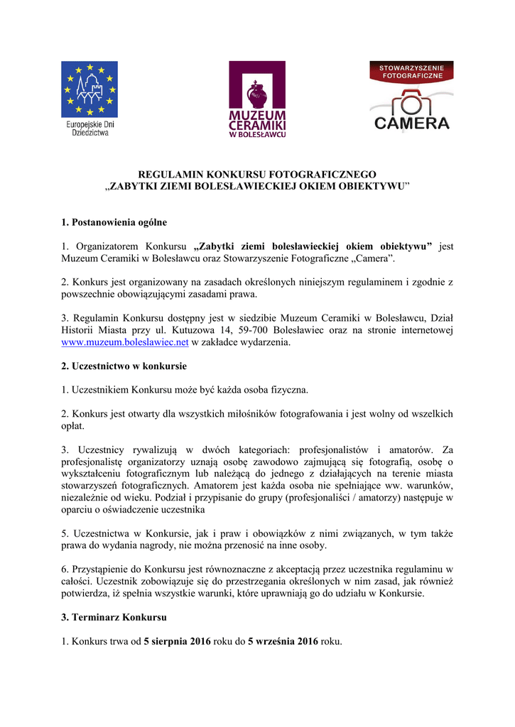 REGULAMIN KONKURSU FOTOGRAFICZNEGO „ZABYTKI ZIEMI BOLESŁAWIECKIEJ OKIEM OBIEKTYWU” 1. Postanowienia ogólne 1. Organizatorem Konkursu „Zabytki ziemi bolesławieckiej okiem obiektywu” jest Muzeum Ceramiki w Bolesławcu oraz Stowarzyszenie Fotograficzne „Camera”. 2. Konkurs jest organizowany na zasadach określonych niniejszym regulaminem i zgodnie z powszechnie obowiązującymi zasadami prawa. 3. Regulamin Konkursu dostępny jest w siedzibie Muzeum Ceramiki w Bolesławcu, Dział Historii Miasta przy ul. Kutuzowa 14, 59-700 Bolesławiec oraz na stronie internetowej www.muzeum.boleslawiec.net w zakładce wydarzenia. 2. Uczestnictwo w konkursie 1. Uczestnikiem Konkursu może być każda osoba fizyczna. 2. Konkurs jest otwarty dla wszystkich miłośników fotografowania i jest wolny od wszelkich opłat. 3. Uczestnicy rywalizują w dwóch kategoriach: profesjonalistów i amatorów. Za profesjonalistę organizatorzy uznają osobę zawodowo zajmującą się fotografią, osobę o wykształceniu fotograficznym lub należącą do jednego z działających na terenie miasta stowarzyszeń fotograficznych. Amatorem jest każda osoba nie spełniające ww. warunków, niezależnie od wieku. Podział i przypisanie do grupy (profesjonaliści / amatorzy) następuje w oparciu o oświadczenie uczestnika 5. Uczestnictwa w Konkursie, jak i praw i obowiązków z nimi związanych, w tym także prawa do wydania nagrody, nie można przenosić na inne osoby. 6. Przystąpienie do Konkursu jest równoznaczne z akceptacją przez uczestnika regulaminu w całości. Uczestnik zobowiązuje się do przestrzegania określonych w nim zasad, jak również potwierdza, iż spełnia wszystkie warunki, które uprawniają go do udziału w Konkursie. 3. Terminarz Konkursu 1. Konkurs trwa od 5 sierpnia 2016 roku do 5 września 2016 roku. 2. Losowanie kopert z zadaniami odbędzie się 5 i 6 sierpnia 2016 roku w godzinach od 10.00 do 16.00 w budynku Muzeum Ceramiki w Bolesławcu, Dział Historii Miasta przy ul. Kutuzowa 14. 3. Zdjęcia konkursowe w wersji elektronicznej na nośniku pamięci (pendrive, dysk zewnętrzny, płyta CD/DVD) należy dostarczać do budynku Muzeum Ceramiki w Bolesławcu, Dział Historii Miasta przy ul. Kutuzowa 14. Zdjęcia można również przesyłać pocztą elektroniczną na adres: [email protected]. W tym przypadku zgłoszenie uznane będzie za ważne jedynie, gdy uczestnik otrzyma potwierdzenie odbioru wiadomości. Ostateczny termin dostarczenia zdjęć upływa 5 września 2016 roku o godz. 16.00. 4. Rozstrzygnięcie Konkursu i ogłoszenie nazwisk zwycięzców nastąpi 17 września roku o godzinie 12.00 w Muzeum Ceramiki, Dział Historii Miasta przy ul. Kutuzowa 14 podczas finału konkursu, organizowanego w ramach Europejskich Dni Dziedzictwa. 4. Zasady zgłaszania zdjęć do konkursu. 1. Zadaniem uczestników Konkursu jest wykonanie współczesnych fotografii w oparciu o reprodukcję dawnej widokówki lub zdjęcia. 2. Każdy z uczestników drogą losowania otrzyma pakiet dwóch reprodukcji – jednej z widokiem zabytku położonego na terenie miasta Bolesławiec, drugiej z widokiem zabytku położonego na terenie jednej z miejscowości w obrębie powiatu bolesławieckiego. 3. Uczestnik ma prawo wyboru jednego z obiektów, może również wykonać dwie fotografie, wykorzystując obie reprodukcje umieszczone w pakiecie. 3. Po odnalezieniu przedstawionego na reprodukcji/reprodukcjach obiektu lub miejsca/obiektów lub miejsc (albo miejsca, w którym kiedyś był zlokalizowany), uczestnik powinien wykonać jedną jego fotografię. 4. Oceniane będzie: prawidłowe zlokalizowanie obiektu przedstawionego na reprodukcji fotografii oraz wartość artystyczna wykonanego zdjęcia. 5. Zdjęcia zapisane w formacie JPG, umieszczone na płycie CD lub innym nośniku elektronicznym lub przesłane pocztą elektroniczną powinny posiadać rozdzielczość nie mniejszą niż 300 dpi, 1600×1200 pikseli. 6. Prace nie spełniające wymogów regulaminu Konkursu zostaną odrzucone. 7. Ingerencja komputerowa dopuszczalna jest jedynie w zakresie działań odpowiadających zabiegom stosowanym w ciemni fotograficznej, polegających na rozjaśnianiu, kontrastowaniu, redukcji koloru, wypalaniu, poszerzeniu tonalności, wyostrzeniu, redukcji szumu. Wszelkie inne zmiany, opracowania, fotomontaż są niedopuszczalne. 5. Przebieg konkursu oraz zasady prowadzenia konkursu 1. Do jury Konkursu wybrano przedstawicieli organizatorów, a także osoby zajmujące się fotografią, a niebiorące udziału w Konkursie. 2. W skład jury nie mogą wchodzić osoby spokrewnione z uczestnikami Konkursu. 3. Organizatorzy nie zwracają zdjęć nadesłanych na Konkurs i zastrzegają sobie prawo do dysponowania nagrodzonymi fotografiami, które będą wykorzystywane na zasadzie bezpłatnej licencji w działalności Organizatorów. Organizatorzy gwarantują autorom nagrodzonych zdjęć ochronę osobistych praw autorskich. 4. Zwycięskie zdjęcia będą prezentowane podczas rozstrzygnięcia konkursu w dniu 17 września 2016 roku oraz na stronie internetowej: www.muzeum.boleslawiec.net, a także na profilu facebook.pl tejże instytucji i na lokalnych portalach internetowych. 5. Przysłanie zdjęć jest równoznaczne ze zgodą autora na ich wykorzystanie w wyżej wymienionych celach na zasadzie licencji (bezpłatnej), na następujących polach eksploatacji: - w zakresie utrwalania i zwielokrotniania zdjęcia – wytwarzanie określoną techniką egzemplarzy zdjęcia, w tym techniką drukarską, reprograficzną, zapisu magnetycznego oraz techniką cyfrową; - w zakresie obrotu oryginałem albo egzemplarzami, na których zdjęcie utrwalono – wprowadzanie do obrotu, użyczenie lub najem oryginału albo egzemplarzy. 6. Nagrody 1. W Konkursie przyznane zostaną nagrody rzeczowe – akcesoria elektroniczne oraz książki. 2. Przewiduje się nagrodzenie trzech najlepszych zdjęć oraz przyznanie wyróżnień. 3. Wręczenie nagród odbędzie się w dniu rozst