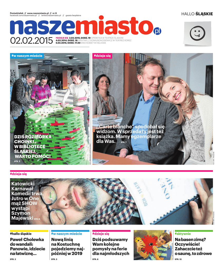 HALLO ŚLĄSKIE Poniedziałek // www.naszemiasto.pl // nr 8 facebook.com/naszemiasto.pl // twitter/naszemiasto.pl // gazeta bezpłatna 02.02.2015 #DZIEJE SIĘ 2.02.2015, GODZ. 19 OPERETKA W TEATRZE ŚLĄSKIM 4.02.2014, GODZ. 18 SPEKTAKL Z SONIĄ BOHOSIEWICZ W TEATREZ KOREZ 5.02.2015, GODZ. 17.30 KINO KOBIET W HELIOSIE #w naszym mieście #dzieje się FOT. MAT. PRASOWE STR. 3 STR. 7 FOT. ARKADIUSZ ŁAWRYWIANIEC DZIŚ ROZBIÓRKA CHOINKI W BIBLIOTECE ŚLĄSKIEJ. WARTO POMÓC! ,,Carte blanche” spodobał się widzom. W sprzedaży jest też książka. Mamy egzemplarze dla Was. #dzieje się FOT. MAT. PRASOWE Katowicki Karnawał Komedii trwa. Jutro w One mąż SHOW wystąpi Szymon Majewski STR. 6 #w naszym mieście #dzieje się #aktywnie Paweł Cholewka dowandali: Panowie,idziecie nałatwiznę... Nową linią na Kostuchnę pojedziemy najpóźniej w 2019 Dziś podsuwamy Wam kolejne pomysły na ferie dla najmłodszych Nabasenzimą? Oczywiście! Zahaczcieteż osaunę,tozdrowe STR. 2 STR. 3 STR. 6 FOT. MATERIAŁY PRASOWE #hallo śląskie STR. 12 2 #hallo śląskie 02 PONIEDZIAŁEK, 2 LUTEGO 2015 NASZEMIASTO www.naszemiasto.pl JESTTOTRUDNA,ŻMUDNAPRACA.DUŻOTRUDNIEJJESTZAROBIĆ PIENIĄDZEJAKOPRAWNIKNIŻJAKOAKTOR JOANNA JABŁCZYŃSKA DLA AGENCJI NEWSERIA #hallo śląskie #ale to fajne! #foto TELEWIZJA- W Norwegii powsta- ło show „Sweatshop - Deadly Fashion”, w którym trzech popularnych norweskich blogerów modowych wysłano do fabryk ubrań w Kambodży. W programie szafiarze odwiedzają i poznają historię młodych robotników fabryk. Telewizyjne show jest pełne emocji i łez, a blogerzy zapowiadają, że uważniej będą dokonywać zakupów ubrań i apelują do wielkich marek by te - nie wykorzystywały taniej siły roboczej. #szkoła Prosto z pałacu Buckingham CIEKAWOSTKA - Z wielką radoś- cią przyjęli uczniowie i nauczyciele szkoły z Wieniawy (koło Radomia) życzenia z pałacu w Londynie, wysłane do nich przez księcia Williama i księżną Kate. Do wyjątkowych pozdrowień dołączono zdjęcie królewskiej pary. List książąt z Anglii to odpowiedź na życzenia od samych uczniów Zespołu Szkół. W grudniu zorganizowali oni konkurs na najpiękniejszą anglojęzyczną kartkę świąteczną i wysłali życzenia do wielu znanych osób i instytucji. Przedsiębiorczy uczniowie ULDUS BAKHTIOZINA STWORZYŁA WŁASNE WERSJE ROSYJSKICH BAŚNI, KTÓRE POKAZAŁA NA ZDJĘCIACH. SZCZEGÓLNĄ UWAGĘ ZWRÓCIŁA NA SYMBOLE Szkół Ponadgimnazjalnych imienia Pierwszego Pułku Lotnictwa Myśliwskiego założyli swoją firmę. Ich pomysł to szkolna pizzeria. Jak twierdzą, dziennie są w stanie sprzedać prawie 400 porcji pizzy. Uczniowska inicjatywa była tak dobra, że zdobyli czwartą nagrodę w ogólnopolskim konkursie Akademii Młodego Przedsiębiorcy. Licealiści otrzymali 2,5 tysiąca złotych na rozwinięcie swojej działalności biznesowej w szkole. VERSACE I NOWA KOLEKCJA PRZEZROCZYST TAŚMY NA CAŁYM CIELE- TO BĘDZIE KRÓLOWAŁO W SEZONIE WIOSNA/LATO #film TESS MUNSTER UZNAJĄC JĄ ZA WPŁYWOWĄ POSTAĆ FOTT. JACQUES BRINON, ULDUS BAKHTIOZINA Wspomnienie złych chwil WŁOSKI VOGUE DOCENIŁ #o cholewka! # Conan Niszczyciel, wersja polska PAWEŁ CHOLEWKA BIZNES - Uczniowie z Zespołu #zobacz MODELKA SIZE PLUS WIDEO - Steven Spielberg z oka- zji 70. rocznicy wyzwolenia nazistowskiego obozu AuschwitzBirkenau przygotował specjalny film. Swojego głosu do produkcji użyczyła Meryl Streep, a muzykę skomponował Hans Zimmer. W produkcji Spielberg przedstawił historię tworzenia niemieckich obozów zagłady. Opublikowany film jest hołdem dla zamordowanych osób. prawnik, trener biznesu, coach Z dewastowaneprzystanki,skwerkiiławki,zdemolowanekosze naśmieci.Dotegonieudolneparodiesztuki ulicznego graffiti,zazwyczaj ksenofobiczno-wulgarnejtreści, namurachzabytkowychkamienicipomnikach.Wystarczywybraćsię„namiasto”pojakiejkolwiekimprezie,szczególniesportowej,względnie–naniedzielny spacerpo„gorączcesobotniejnocy”,byzaobserwowaćskutkinaderczęstowystępującegounas zjawiska,nazywanegowandalizmem.Nezorientowanymprzypomnę,żenazwatego pojęcia wywodzisięodstarożytnegoplemieniabarbarzyńców–Wandalów,którzyw455rokuzłupili izdewastowaliRzym. Mamgraniczącezpewnościąprzekonanie,żeplemięwojowniczych, dumnychibudzącychgrozębarbarzyńcówbyłobyzniesmaczone,gdybydowiedziałosię,żeich legendęzawłaszczająsobiedrobni,sfrustrowaniniszczyciele zkrajunadWisłą. Cowywołujewludziachpęd dobezsensownegoibezinteresownegoniszczeniapublicznego, azarazemwspólnegomienia? Możeniedającasięrozładować frustracja?Możenieopanowane emocje?Amożewinęponosinatura,któraowymniszczycielom niewykształciładostateczniepofałdowanychmózgów?Samnie wiem. Alemampropozycję dla wszystkichusiłującychnaśladowaćbarbarzyńskichWandalów. Jeślijużniedasięrozładowaćfrustracjiiemocjiwinnysposób, kroczcieprzynajmniejgodnie ścieżkąswoichstarożytnych imienników.Dajciespokójprzystankom,tramwajom,ławkom iśmieciom.Spróbujciewyładowaćniszczycielskizapałnajednostcewojskdesantowych, wysprejujciestojącepodniąśmigłowce.Obrzućcieśmietnikami klubsportowy,gdziezawodowy stresrozładowująpolicyjni antyterroryści.Albozdemolujcie lokalnależącydomasywnych osobników,poruszającychsięzaparkowanymipodnimczarnymi beemkami.Teteż zdewastujcie. Cowrewanżuzdemolują iuszkodząWamlokatorzy,bywalcy iwłaścicielewspomnianychnieruchomościiruchomości,dowieciesiępowybudzeniuznarkozy. Naurazówce. FOT. M. GAPIŃSKI Sosnowieckie kino Muza ma nową elewację. Przypomina stare radio FOT. MATERIAŁY PRYWATNE POSTACI Z BAŚNI. MAGICZNA SESJA ARTYSTKI Z ROSJI Czas Kardashianów REKLAMA - Znana z bycia znaną, Kim Kardashian, wystąpiła w reklamie telefonu komórkowego. Opowiada w niej o wielkiej sztuce robienia „selfie”. Ostatnie dni imprezowego szaleństwa MODA Tylko szesnaście dni pozostało do końca karnawałowego szaleństwa. Jak przygotować się do takiego balowania? Oto szybki po