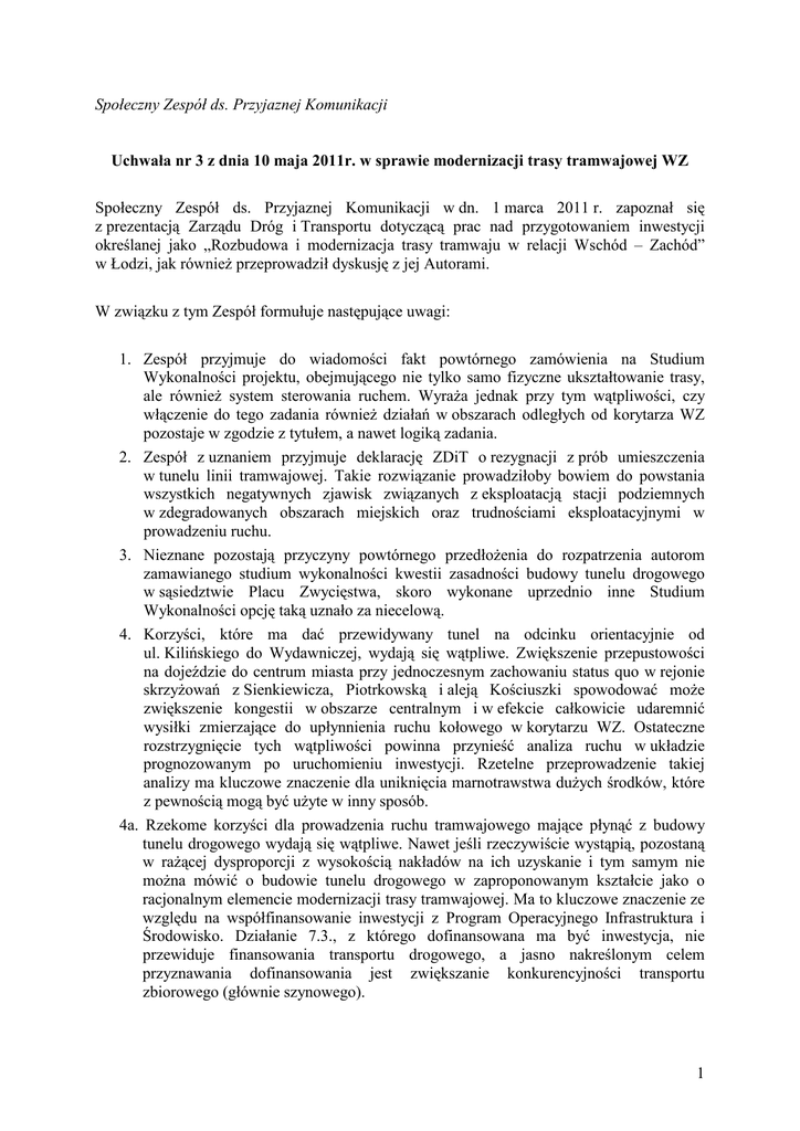 Społeczny Zespół ds. Przyjaznej Komunikacji Uchwała nr 3 z dnia 10 maja 2011r. w sprawie modernizacji trasy tramwajowej WZ Społeczny Zespół ds. Przyjaznej Komunikacji w dn. 1 marca 2011 r. zapoznał się z prezentacją Zarządu Dróg i Transportu dotyczącą prac nad przygotowaniem inwestycji określanej jako „Rozbudowa i modernizacja trasy tramwaju w relacji Wschód – Zachód” w Łodzi, jak równieŜ przeprowadził dyskusję z jej Autorami. W związku z tym Zespół formułuje następujące uwagi: 1. Zespół przyjmuje do wiadomości fakt powtórnego zamówienia na Studium Wykonalności projektu, obejmującego nie tylko samo fizyczne ukształtowanie trasy, ale równieŜ system sterowania ruchem. WyraŜa jednak przy tym wątpliwości, czy włączenie do tego zadania równieŜ działań w obszarach odległych od korytarza WZ pozostaje w zgodzie z tytułem, a nawet logiką zadania. 2. Zespół z uznaniem przyjmuje deklarację ZDiT o rezygnacji z prób umieszczenia w tunelu linii tramwajowej. Takie rozwiązanie prowadziłoby bowiem do powstania wszystkich negatywnych zjawisk związanych z eksploatacją stacji podziemnych w zdegradowanych obszarach miejskich oraz trudnościami eksploatacyjnymi w prowadzeniu ruchu. 3. Nieznane pozostają przyczyny powtórnego przedłoŜenia do rozpatrzenia autorom zamawianego studium wykonalności kwestii zasadności budowy tunelu drogowego w sąsiedztwie Placu Zwycięstwa, skoro wykonane uprzednio inne Studium Wykonalności opcję taką uznało za niecelową. 4. Korzyści, które ma dać przewidywany tunel na odcinku orientacyjnie od ul. Kilińskiego do Wydawniczej, wydają się wątpliwe. Zwiększenie przepustowości na dojeździe do centrum miasta przy jednoczesnym zachowaniu status quo w rejonie skrzyŜowań z Sienkiewicza, Piotrkowską i aleją Kościuszki spowodować moŜe zwiększenie kongestii w obszarze centralnym i w efekcie całkowicie udaremnić wysiłki zmierzające do upłynnienia ruchu kołowego w korytarzu WZ. Ostateczne rozstrzygnięcie tych wątpliwości powinna przynieść analiza ruchu w układzie prognozowanym po uruchomieniu inwestycji. Rzetelne przeprowadzenie takiej analizy ma kluczowe znaczenie dla uniknięcia marnotrawstwa duŜych środków, które z pewnością mogą być uŜyte w inny sposób. 4a. Rzekome korzyści dla prowadzenia ruchu tramwajowego mające płynąć z budowy tunelu drogowego wydają się wątpliwe. Nawet jeśli rzeczywiście wystąpią, pozostaną w raŜącej dysproporcji z wysokością nakładów na ich uzyskanie i tym samym nie moŜna mówić o budowie tunelu drogowego w zaproponowanym kształcie jako o racjonalnym elemencie modernizacji trasy tramwajowej. Ma to kluczowe znaczenie ze względu na współfinansowanie inwestycji z Program Operacyjnego Infrastruktura i Środowisko. Działanie 7.3., z którego dofinansowana ma być inwestycja, nie przewiduje finansowania transportu drogowego, a jasno nakreślonym celem przyznawania dofinansowania jest zwiększanie konkurencyjności transportu zbiorowego (głównie szynowego). 1 5. Tunel drogowy, jeśli miałby być rozpatrywany, powinien, zdaniem Zespołu, znajdować się raczej na odcinku centralnym trasy. Mógłby wówczas pozytywnie wpłynąć na kongestię w newralgicznym obszarze w rejonie Piotrkowskiej i Alei Kościuszki, przywrócić spoistość ulicy Piotrkowskiej rozciętej arterią, jak równieŜ umoŜliwić stworzenie wysokiej jakości przestrzeni publicznej w tym rejonie. Ułatwiłby on równieŜ budowę przystanku przesiadkowego między liniami WZ a liniami na trasie ŁTR. Wizja takiego przystanku została zaprezentowana przez członków Zespołu. Przy okazji dyskusji nad tunelem w centrum pojawiła się istotna róŜnica zdań co do moŜliwości budowy tego tunelu w aspekcie kolizji z sieciami podziemnymi. Zdaniem Zespołu, przeciwnie do opinii przedstawicieli ZDiT, jest to moŜliwe, poniewaŜ sieci podziemne były budowane przy liczeniu się z moŜliwością powstania tunelu w przyszłości. 6. Wbrew opiniom przedstawicieli ZDiT rezygnacja z budowy tunelu nie musi oznaczać rezygnacji z wykorzystania przyznanych środków pomocowych. Zespół jest zdania, Ŝe – szczególnie w przypadku trasy tramwajowej prowadzonej w większości przez nieprzyjazne dla uŜytkowników środowisko (pas rozdzielający ruchliwej arterii kołowej pozbawionej zwartej zabudowy) – modernizacja nakłada szczególne obowiązki w zakresie kształtowania przestrzeni wokółprzystankowych (zadaszeń, „landscapingu”, dojść, oświetlenia), które powinny uzyskać moŜliwie najbardziej zhumanizowany charakter. Do ich ukształtowania naleŜy, wzorem rozwiązań francuskich, wykorzystać najlepsze formy architektury, a moŜe i elementy artystyczne. Nie powinno się dopuszczać, by architektoniczne rozwiązania przystanków powielały „siermięŜny” schemat istniejący w mieście i zastosowany – niestety – na linii ŁTR. 7. Oszacowanie kosztów dokonane dotychczas wydaje się wątpliwe, zwaŜywszy na nieuwzględnienie potrzeb związanych z humanizacją przestrzeni i udostępnieniem dla niepełnosprawnych kluczowych przystanków na linii, z których szczególnie negatywnie wyróŜniają się te przy Szpitalu Wojskowym, Sienkiewicza i przy Dworcu Kaliskim. Dobre rozwiązanie tych miejsc na pewno będzie kosztowne. 8. NaleŜy dąŜyć do redukcji liczby miejsc segregacji pionowej ruchu pieszego i kołowego, w szczególności w kontekście skrzyŜowania z ul. Piotrkowską. Przejścia podziemne lub kładki w niewystarczającym stopniu integrują przestrzeń miasta rozciętą przez arterię kołową, stanowią za to barierę dla osób niepełnosprawnych i ruchu rowerowego. 9. Zespół jest zdania, Ŝe w Specyfikacji do zamawianego Studium Wykonalności powinny się pojawić wyraźnie sprecyzowane oczekiwania odniesione do charakteru poszczególnych miejsc, zawierające być moŜe sugestie rozwiązań przestrzennych. Propozycje takich rozwiązań Zespół zgłosi