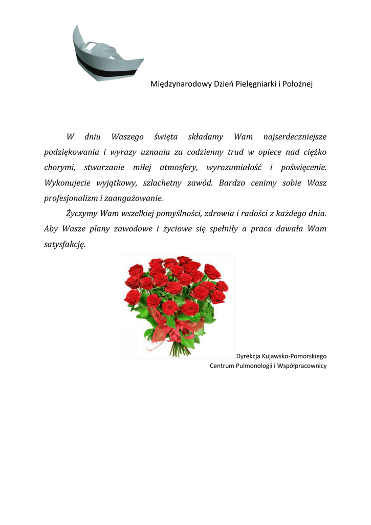 Międzynarodowy Dzień Pielęgniarki i Położnej W dniu Waszego święta składamy Wam najserdeczniejsze podziękowania i wyrazy uznania za codzienny trud w opiece nad ciężko chorymi, stwarzanie miłej atmosfery, wyrozumiałość i poświęcenie. Wykonujecie wyjątkowy, szlachetny zawód. Bardzo cenimy sobie Wasz profesjonalizm i zaangażowanie. Życzymy Wam wszelkiej pomyślności, zdrowia i radości z każdego dnia. Aby Wasze plany zawodowe i życiowe się spełniły a praca dawała Wam satysfakcję. Dyrekcja Kujawsko-Pomorskiego Centrum Pulmonologii i Współpracownicy
