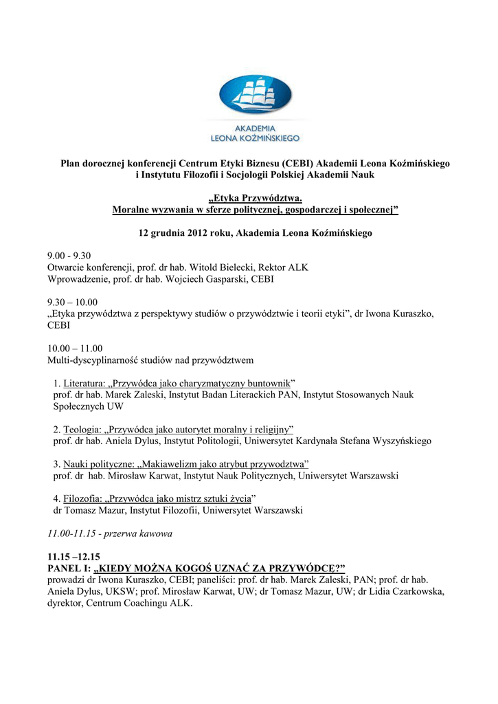 Plan dorocznej konferencji Centrum Etyki Biznesu (CEBI) Akademii Leona Koźmińskiego i Instytutu Filozofii i Socjologii Polskiej Akademii Nauk „Etyka Przywództwa. Moralne wyzwania w sferze politycznej, gospodarczej i społecznej” 12 grudnia 2012 roku, Akademia Leona Koźmińskiego 9.00 - 9.30 Otwarcie konferencji, prof. dr hab. Witold Bielecki, Rektor ALK Wprowadzenie, prof. dr hab. Wojciech Gasparski, CEBI 9.30 – 10.00 „Etyka przywództwa z perspektywy studiów o przywództwie i teorii etyki”, dr Iwona Kuraszko, CEBI 10.00 – 11.00 Multi-dyscyplinarność studiów nad przywództwem 1. Literatura: „Przywódca jako charyzmatyczny buntownik” prof. dr hab. Marek Zaleski, Instytut Badan Literackich PAN, Instytut Stosowanych Nauk Społecznych UW 2. Teologia: „Przywódca jako autorytet moralny i religijny” prof. dr hab. Aniela Dylus, Instytut Politologii, Uniwersytet Kardynała Stefana Wyszyńskiego 3. Nauki polityczne: „Makiawelizm jako atrybut przywodztwa” prof. dr hab. Mirosław Karwat, Instytut Nauk Politycznych, Uniwersytet Warszawski 4. Filozofia: „Przywódca jako mistrz sztuki życia” dr Tomasz Mazur, Instytut Filozofii, Uniwersytet Warszawski 11.00-11.15 - przerwa kawowa 11.15 –12.15 PANEL I: „KIEDY MOŻNA KOGOŚ UZNAĆ ZA PRZYWÓDCĘ?” prowadzi dr Iwona Kuraszko, CEBI; paneliści: prof. dr hab. Marek Zaleski, PAN; prof. dr hab. Aniela Dylus, UKSW; prof. Mirosław Karwat, UW; dr Tomasz Mazur, UW; dr Lidia Czarkowska, dyrektor, Centrum Coachingu ALK. 12.15 – 12.45 „Ostra jazda na kruchym lodzie”, Jacek Santorski, Akademia Psychologii Przywództwa, Szkoła Biznesu, Politechnika Warszawska 12.45 – 13.15 „Przywódca a menedżer”, prof. dr hab. A. K. Koźmiński, Akademia Leona Koźmińskiego 13.15 – 14.00 – lunch 14.0 – 15.30 – 3 sesje równoległe akademickie (nadesłane referaty): Sesja I: Sylwetka przywódcy – modele relacji w przywództwie (prowadzi: prof. dr hab. Wojciech Gasparski, CEBI ALK) 1. Przywództwo rozproszone a współczesne wyzwania cywilizacyjne, Ewa Jastrzębska, Paulina Legutko–Kobus, Szkoła Główna Handlowa 2. Etyczność autentycznych przywódców w przedsiębiorstwach międzynarodowych, Joanna Furmańczyk 3. Etyczne przywództwo w warunkach niepewności, Julita Sokołowska, Uniwersytet Kardynała Stefana Wyszyńskiego 4. Aureole i korony, czyli duchowe i materialne atrybuty przywództwa i władzy, Regina Borowik, Wyższa Szkoła Zarządzania i Bankowości w Krakowie 5. Przywództwo personalistyczne – teoria i praktyka, Bronisław Bombała, Uniwersytet Warmińsko-Mazurski w Olsztynie 6. Wybitny przywódca na zmienne czasy to potrzeba organizacji czy konieczność jej przetrwania?, Marcin Geryk, Wyższa Szkoła Zarządzania w Gdańsku, Wyższa Szkoła Infrastruktury i Zarządzania w Warszawie Sesja II: Zwolennik czy podwładny – refleksje nad obywatelem (prowadzi: prof. dr hab. Anna Lewicka-Strzałecka, CEBI ALK) 1. Niektóre wewnętrzne i zewnętrzne mechanizmy wzajemnych relacji wobec autorytetu przywódcy, Janusz Pilszak, Uniwersytet Papieski Jana Pawła II w Krakowie 2. Przywództwo oparte na coachingu, Dariusz Wylon, Inbound Marketing Agency PRact 3. Koncepcja moralnego przywódcy według Papieskiej Rady Iustitia et Pax, Przemysław Król SCJ, Uniwersytet Papieski Jana Pawła II w Krakowie 4. Przywódca mentorem - nowe wyzwanie nowoczesnego przywództwa, Wioletta Małota, ALK 5. Przywództwo wirtualne na przykładzie rewolucji arabskich i Ruchu Oburzonych, Ryszard Banajski, Towarzystwa Naukowego Prakseologii 6. Donald Tusk – przywódca w kryzysie czy kryzys przywódcy, Nina Olszewska, Instytut Monitorowania Mediów Sesja III: Infrastruktura etyczna przywództwa w różnych sektorach państwa demokratycznego (prowadzi: dr Dariusz Bąk, CEBI ALK) 1. Standardy etyczne wymagane od liderów w korporacji GE, Krzysztof Motylski, Bank BPH SA 2. Przywództwo de jure i de facto, Grzegorz Szulczewski, Szkoła Główna Handlowa 3. Przywództwo, zarządzanie, etyczny klimat a wyzwania we współczesnej organizacji, Ewa Stawicka, Szkoła Główna Gospodarstwa Wiejskiego w Warszawie 4. Polityka podwójnej standaryzacji społecznej odpowiedzialności międzynarodowych korporacji, Katarzyna Kowalska 5. Rola odpowiedzialnego menedżera w tworzeniu wartości przedsiębiorstwa, Agnieszka Żak, Uniwersytet Ekonomiczny w Krakowie 6. Etyka menedżera – przywódcy uczelni w świetle badań empirycznych, Stanisław Kałużny, Uczelnia Vistula; Andrzej Majchrzak, Polski Instytut Kontroli, Audytu i Kontrolingu 15.30 – 15.45 – przerwa kawowa 15.45 - 16.45 Sceneria i wyzwania współczesnego przywództwa 1. „Socjo-polityczna przestrzeń przywództwa”, prof. dr hab. Witold Morawski, Katedra Nauk Społecznych, Akademia Leona Koźmińskiego 2. „Sprawiedliwość a dominacja”, dr Marta Soniewicka, Katedra Filozofii Prawa i Etyki Prawniczej, Uniwersytet Jagielloński 3. „Jakość życia”, prof. dr hab. Tadeusz Borys, Katedra Zarządzania Jakością i Środowiskiem, Uniwersytet Ekonomiczny we Wrocławiu 16.45 -17.45 PANEL II: „JAK BUDOWAĆ SPOŁECZNO – POLITYCZNO - EKONOMICZNĄ INFRASTRUKTURĘ PRZYWÓDZTWA?” prowadzi dr Bolesław Rok, CEBI; paneliści: prof. dr hab. Witold Morawski, ALK; prof. Tadeusz Borys, UE Wrocław; dr Marta Soniewicka, UJ; Alicja Pacewicz, dyrektor, Centrum Edukacji Obywatelskiej. 17.45 Podsumowanie konferencji – dr Iwona Kuraszko, CEBI 18.00 Zakończenie konferencji – prof. dr hab. Wojciech Gasparski, CEBI Organizatorzy zastrzegaja sobie prawo do zmian w programie konferencji