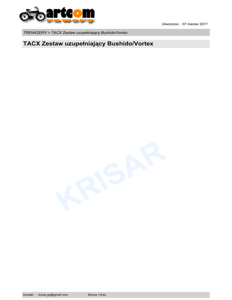 Utworzono : 07 marzec 2017 TRENAZERY > TACX Zestaw uzupełniający Bushido/Vortex TACX Zestaw uzupełniający Bushido/Vortex R A K kontakt : - [email protected] S I R Strona 1/{nb} Utworzono : 07 marzec 2017 TRENAZERY > TACX Zestaw uzupełniający Bushido/Vortex TACX Zestaw uzupełniający Bushido/Vortex Model : TACX Zestaw uzupełniający Bushid TACX Zestaw uzupełniający Bushido/Vortex Producent : TACX Zestaw uzupełniający Bushido/Vortex Zestaw umożliwia dostosowanie trenażerów Bushido oraz Vortex do treningu w rzeczywistości wirtualnej. Zestaw zawiera pamięci USB dzięki której można bezprzewodowo podłączyć trenażer do komputera oraz oprogramowanie Tacx Trainer Software w wersji 3.0 Funkcje programu TTS 3.0 znajdują się w zakładce "oprogramowanie" 849,00 zł * R A S I R K Cena : 849,00 PLN Brutto ( 690,24 PLN Netto) kontakt : - [email protected] Strona 2/{nb} Utworzono : 07 marzec 2017 TRENAZERY > TACX Zestaw uzupełniający Bushido/Vortex TACX Zestaw uzupełniający Bushido/Vortex Dostępność: Produkt dostępny w naszym sklepie od 09 styczeń 2012 R A K kontakt : - [email protected] S I R Strona 3/{nb}