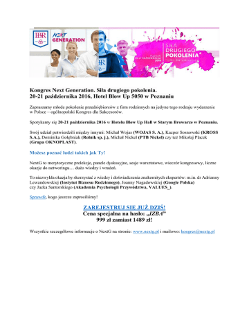 Kongres Next Generation. Siła drugiego pokolenia. 20-21 października 2016, Hotel Blow Up 5050 w Poznaniu Zapraszamy młode pokolenie przedsiębiorców z firm rodzinnych na jedyne tego rodzaju wydarzenie w Polsce – ogólnopolski Kongres dla Sukcesorów. Spotykamy się 20-21 października 2016 w Hotelu Blow Up Hall w Starym Browarze w Poznaniu. Swój udział potwierdzili między innymi: Michał Wojas (WOJAS S. A.), Kacper Sosnowski (KROSS S.A.), Dominika Gołębniak (Rolnik sp. j.), Michał Nickel (PTB Nickel) czy też Mikołaj Placek (Grupa OKNOPLAST). Możesz poznać ludzi takich jak Ty! NextG to merytoryczne prelekcje, panele dyskusyjne, sesje warsztatowe, wieczór kongresowy, liczne okazje do networingu… dużo wiedzy i wrażeń. To niezwykła okazja by skorzystać z wiedzy i doświadczenia znakomitych ekspertów: m.in. dr Adrianny Lewandowskiej (Instytut Biznesu Rodzinnego), Joanny Nagadowskiej (Google Polska) czy Jacka Santorskiego (Akademia Psychologii Przywództwa, VALUES_). Sprawdź, kogo jeszcze zaprosiliśmy! ZAREJESTRUJ SIĘ JUŻ DZIŚ! Cena specjalna na hasło: „IZBA” 999 zł zamiast 1489 zł! Wszystkie szczegółowe informacje o NextG na stronie: www.nextg.pl i mailowo: [email protected]
