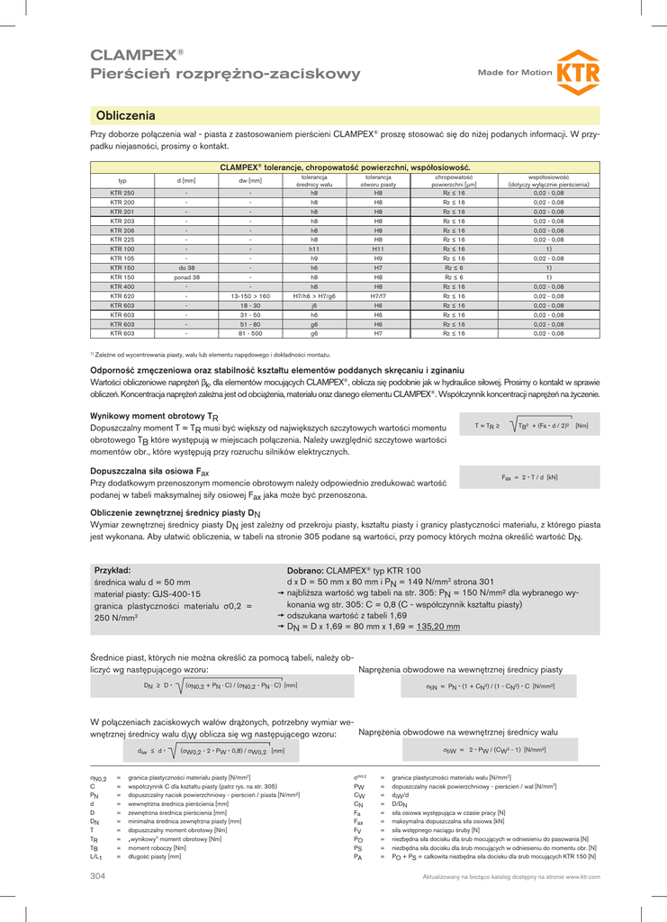 CLAMPEX® Pierścień rozprężno-zaciskowy Obliczenia Przy doborze połączenia wał - piasta z zastosowaniem pierścieni CLAMPEX® proszę stosować się do niżej podanych informacji. W przypadku niejasności, prosimy o kontakt. CLAMPEX® tolerancje, chropowatość powierzchni, współosiowość. - tolerancja średnicy wału h8 tolerancja otworu piasty H8 chropowatość powierzchni [µm] Rz ≤ 16 współosiowość (dotyczy wyłącznie pierścienia) 0,02 - 0,08 - h8 H8 Rz ≤ 16 0,02 - 0,08 - h8 H8 Rz ≤ 16 0,02 - 0,08 - - h8 H8 Rz ≤ 16 0,02 - 0,08 KTR 206 - - h8 H8 Rz ≤ 16 0,02 - 0,08 KTR 225 - - h8 H8 Rz ≤ 16 0,02 - 0,08 KTR 100 - - h11 H11 Rz ≤ 16 1) KTR 105 do 38 - h9 H9 Rz ≤ 16 0,02 - 0,08 - h6 H7 Rz ≤ 6 1) - h8 H8 Rz ≤ 6 1) KTR 400 ponad 38 - - h8 H8 Rz ≤ 16 0,02 - 0,08 KTR 620 - 13-150 > 160 H7/h6 > H7/g6 H7/f7 Rz ≤ 16 0,02 - 0,08 KTR 603 - 18 - 30 j6 H6 Rz ≤ 16 0,02 - 0,08 KTR 603 - 31 - 50 h6 H6 Rz ≤ 16 0,02 - 0,08 KTR 603 - 51 - 80 g6 H6 Rz ≤ 16 0,02 - 0,08 KTR 603 - 81 - 500 g6 H7 Rz ≤ 16 0,02 - 0,08 typ d [mm] dw [mm] KTR 250 - KTR 200 - KTR 201 - KTR 203 KTR 150 KTR 150 1) Zależne od wycentrowania piasty, wału lub elementu napędowego i dokładności montażu. Odporność zmęczeniowa oraz stabilność kształtu elementów poddanych skręcaniu i zginaniu Wartości obliczeniowe naprężeń βk, dla elementów mocujących CLAMPEX®, oblicza się podobnie jak w hydraulice siłowej. Prosimy o kontakt w sprawie obliczeń. Koncentracja naprężeń zależna jest od obciążenia, materiału oraz danego elementu CLAMPEX®. Współczynnik koncentracji naprężeń na życzenie. Wynikowy moment obrotowy TR Dopuszczalny moment T ≈ TR musi być większy od największych szczytowych wartości momentu obrotowego TB które występują w miejscach połączenia. Należy uwzględnić szczytowe wartości momentów obr., które występują przy rozruchu silników elektrycznych. Dopuszczalna siła osiowa Fax Przy dodatkowym przenoszonym momencie obrotowym należy odpowiednio zredukować wartość podanej w tabeli maksymalnej siły osiowej Fax jaka może być przenoszona. T ≈ TR ≥ TB² + (Fa d / 2)² [Nm] Fax = 2 T / d [kN] Obliczenie zewnętrznej średnicy piasty DN Wymiar zewnętrznej średnicy piasty DN jest zależny od przekroju piasty, kształtu piasty i granicy plastyczności materiału, z którego piasta jest wykonana. Aby ułatwić obliczenia, w tabeli na stronie 305 podane są wartości, przy pomocy których można określić wartość DN. Przykład: średnica wału d = 50 mm materiał piasty: GJS-400-15 granica plastyczności materiału σ0,2 = 250 N/mm2 Dobrano: CLAMPEX® typ KTR 100 d x D = 50 mm x 80 mm i PN = 149 N/mm2 strona 301 najbliższa wartość wg tabeli na str. 305: PN = 150 N/mm² dla wybranego wykonania wg str. 305: C = 0,8 (C - współczynnik kształtu piasty) odszukana wartość z tabeli 1,69 DN = D x 1,69 = 80 mm x 1,69 = 135,20 mm Średnice piast, których nie można określić za pomocą tabeli, należy obliczyć wg następującego wzoru: Naprężenia obwodowe na wewnętrznej średnicy piasty DN ≥ D (σN0,2 + PN · C) / (σN0,2 - PN · C) [mm] σtiN ≈ PN (1 + CN²) / (1 - CN²) C [N/mm²] W połączeniach zaciskowych wałów drążonych, potrzebny wymiar weNaprężenia obwodowe na wewnętrznej średnicy wału wnętrznej średnicy wału diW oblicza się wg następującego wzoru: diw ≤ d σN0,2 C PN d D DN T TR TB L/L1 304 = = = = = = = = = = σtiW ≈ 2 PW / (CW² - 1) [N/mm²] (σW0,2 - 2 PW 0,8) / σW0,2 [mm] granica plastyczności materiału piasty [N/mm2] współczynnik C dla kształtu piasty (patrz rys. na str. 305) dopuszczalny nacisk powierzchniowy - pierścień / piasta [N/mm²] wewnętrzna średnica pierścienia [mm] zewnętrzna średnica pierścienia [mm] minimalna średnica zewnętrzna piasty [mm] dopuszczalny moment obrotowy [Nm] „wynikowy” moment obrotowy [Nm] moment roboczy [Nm] długość piasty [mm] σW0,2 PW CW CN Fa Fax FV PO PS PA = = = = = = = = = = granica plastyczności materiału wału [N/mm2] dopuszczalny nacisk powierzchniowy - pierścień / wał [N/mm2] diW/d D/DN siła osiowa występująca w czasie pracy [N] maksymalna dopuszczalna siła osiowa [kN] siła wstępnego naciągu śruby [N] niezbędna siła docisku dla śrub mocujących w odniesieniu do pasowania [N] niezbędna siła docisku dla śrub mocujących w odniesieniu do momentu obr. [N] PO + PS = całkowita niezbędna siła docisku dla śrub mocujących KTR 150 [N] Aktualizowany na bieżąco katalog dostępny na stronie www.ktr.com