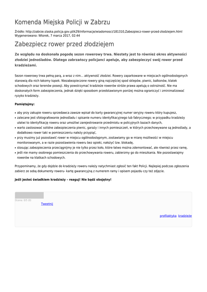 Komenda Miejska Policji w Zabrzu Źródło: http://zabrze.slaska.policja.gov.pl/k29/informacje/wiadomosci/181310,Zabezpiecz-rower-przed-zlodziejem.html Wygenerowano: Wtorek, 7 marca 2017, 02:44 Zabezpiecz rower przed złodziejem Ze względu na doskonała pogodę sezon rowerowy trwa. Niestety jest to również okres aktywności złodziei jednośladów. Dlatego zabrzańscy policjanci apeluje, aby zabezpieczyć swój rower przed kradzieżami. Sezon rowerowy trwa pełną parą, a wraz z nim... aktywność złodziei. Rowery zaparkowane w miejscach ogólnodostępnych stanowią dla nich łakomy kąsek. Niezabezpieczone rowery giną najczęściej spod sklepów, piwnic, balkonów, klatek schodowych oraz terenów posesji. Aby powstrzymać kradzieże rowerów stróże prawa apelują o ostrożność. Nie ma doskonałych form zabezpieczenia, jednak dzięki sposobom przedstawionym poniżej można ograniczyć i zminimalizować ryzyko kradzieży. Pamiętajmy: ● aby przy zakupie roweru sprzedawca zawsze wpisał do karty gwarancyjnej numer seryjny roweru który kupujesz, ● zalecane jest sfotografowanie jednośladu i spisanie numeru identyfikacyjnego lub fabrycznego; w przypadku kradzieży ułatwi to identyfikację roweru oraz umożliwi zarejestrowanie przedmiotu w policyjnych bazach danych, ● warto zastosować solidne zabezpieczenia piwnic, garaży i innych pomieszczeń, w których przechowywane są jednoślady, a dodatkowo rower taki w pomieszczeniu należy przypiąć, ● przy musimy już pozostawić rower w miejscu ogólnodostępnym, zostawiamy go w miarę możliwości w miejscu monitorowanym, a w razie pozostawienia roweru bez opieki, nałożyć tzw. blokadę, ● stosując zabezpieczenia przeciągnijmy je nie tylko przez koło, które łatwo można zdemontować, ale również przez ramę, ● jeśli nie mamy osobnego pomieszczenia do przechowywania roweru, zabierzmy go do mieszkania. Nie pozostawiajmy rowerów na klatkach schodowych. Przypominamy, że gdy dojdzie do kradzieży roweru należy natychmiast zgłosić ten fakt Policji. Najlepiej podczas zgłoszenia zabierz ze sobą dokumenty roweru- kartę gwarancyjną z numerem ramy i opisem pojazdu czy też zdjęcie. Jeśli jesteś świadkiem kradzieży – reaguj! Nie bądź obojętny! Ocena: 0/5 (0) Tweetnij profilaktyka, kradzieże
