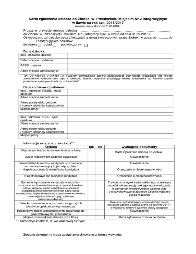 Karta zgłoszenia dziecka do Żłobka w Przedszkolu Miejskim Nr 2 Integracyjnym w Iławie na rok szk. 2016/2017 Wniosek należy złożyć do 31.03.2016 r. Proszę o przyjęcie mojego dziecka ……………………………………………………………………..…… do Żłobka w Przedszkolu Miejskim Nr 2 Integracyjnym w Iławie od dnia 01.09.2016 r. Oświadczam, że dziecko będzie korzystać z usług świadczonych przez Żłobek w godz. od …….... do ……….. i następujących posiłków: śniadanie obiad podwieczorek Dane dziecka: Imię i nazwisko dziecka Data i miejsce urodzenia PESEL dziecka Adres miejsca zamieszkania* *art. 26 Kodeksu Cywilnego „§1 Miejscem zamieszkania dziecka pozostającego pod władzą rodzicielską jest miejsce zamieszkania rodziców albo tego z rodziców, któremu wyłącznie przysługuje władza rodzicielska lub któremu zostało powierzone wykonywanie władzy rodzicielskiej” Dane rodziców/opiekunów: Imię , nazwisko, PESEL matki/ opiekuna Adres miejsca zamieszkania Adres poczty elektronicznej i numery telefonów kontaktowych Miejsce pracy Imię, nazwisko PESEL ojca/ opiekuna Adres miejsca zamieszkania Adres poczty elektronicznej i numery telefonów kontaktowych Miejsce pracy Informacje związane z rekrutacją**: Kryteria Miejsce zamieszkania na terenie miasta Iławy tak nie wymagane dokumenty Karta zgłoszenia dziecka do Żłobka Dwoje rodziców pracujących zawodowo Oświadczenie Wielodzietność rodziny kandydata – oznacza to rodzinę wychowującą troje i więcej dzieci Niepełnosprawność rodzeństwa kandydata Oświadczenie Orzeczenie o niepełnosprawności Niepełnosprawność rodziców kandydata Orzeczenie o niepełnosprawności Samotne wychowanie kandydata w rodzinie - Prawomocny wyrok sądu rodzinnego orzekający rozwód lub separację, akt zgonu, oświadczenie o samotnym wychowywaniu dziecka oraz o niewychowywaniu żadnego dziecka wspólnie z jego rodzicem oznacza to wychowanie dziecka przez pannę, kawalera, wdowę, wdowca, osobę pozostającą w separacji orzeczonej prawomocnym wyrokiem sądu, osobę rozwiedzioną, chyba że osoba taka wychowuje wspólnie co najmniej jedno dziecko z jego rodzicem (właściwe podkreślić) Dziecko umieszczone w rodzinie zastępczej lub placówce opiekuńczo-wychowawczej Dokument poświadczający objęcie dziecka pieczą zastępczą zgodnie z ustawą z dnia 09 czerwca 2011 r. o wspieraniu rodziny i systemie pieczy zastępczej Rodzeństwo dzieci uczęszczających dotychczas do grup żłobkowych i przedszkola Miejsce zamieszkania dziecka poza Iławą Oświadczenie Karta zgłoszenia dziecka do Żłobka ** zaznaczyć znakiem „x” we właściwej rubryce Złożone dokumenty mogą zostać zweryfikowane w formie wywiadu. Dodatkowe dołączone do wniosku informacje o dziecku …............................................................................................................................................................... ................................................................................................................................................................... (np. stan zdrowia – przebyte urazy, choroby przewlekłe, wady rozwojowe, orzeczenie lub opinia poradni psychologiczno-pedagogicznej, potrzeba szczególnej opieki, stosowana dieta, zalecenia lekarskie itp.) Zobowiązanie W przypadku przyjęcia dziecka do Żłobka, zobowiązuję się do: - współpracy z personelem Żłobka, w trosce o dobro dziecka; - przestrzegania postanowień Statutu Żłobka; - regularnego uiszczania opłat za Żłobek w wyznaczonym terminie; - przyprowadzania i odbierania dziecka osobiście lub przez upoważniona osobę dorosłą; - przyprowadzanie do Żłobka zdrowego dziecka; - uczestniczenia w zebraniach rodziców. Oświadczenie 1. Oświadczam, że: a) wszystkie dane zawarte we wniosku są prawdziwe; b) niezwłocznie powiadomię dyrektora Żłobka o zmianie danych zawartych we wniosku; c) wyrażam zgodę na przetwarzanie danych osobowych zawartych w karcie zgłoszenia zgodnie z ustawą z dnia 29 sierpnia 1997 roku o ochronie danych osobowych (Dz. U. z 2014 r. poz. 1182 z późn. zm.) ……………..……………………… czytelny podpis rodzica/opiekuna Data wpływu wniosku ………………….... …............................... podpis dyrektora Wypełnia Żłobek w Przedszkolu Miejskim nr 2 Integracyjnym w Iławie Kandydat do Żłobka uzyskał …….. punktów i decyzją Komisji Rekrutacyjnej (dyrektora) został przyjęty/ nie został przyjęty*** na rok szkol. 2016/2017 do Żłobka w Przedszkolu Miejskim Nr 2 Integracyjnym w Iławie. ***niepotrzebne skreślić ………………………………… czytelny podpis dyrektora