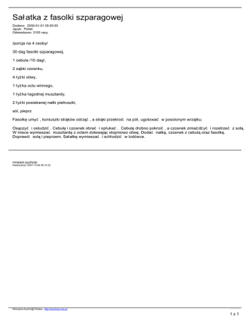 Sałatka z fasolki szparagowej Dodano: 2000-01-01 00:00:00 Język: Polski Odwiedzono: 3193 razy. /porcja na 4 osoby/ 30 dag fasolki szparagowej, 1 cebula /10 dag/, 2 ząbki czosnku, 4 łyżki oliwy, 1 łyżka octu winnego, 1 łyżka łagodnej musztardy, 2 łyżki posiekanej natki pietruszki, sól, pieprz Fasolkę umyć, koniuszki strąków odciąć, a strąki przekroić na pół, ugotować w posolonym wrzątku. Osączyć i ostudzić. Cebulę i czosnek obrać i opłukać. Cebulę drobno pokroić, a czosnek zmiażdżyć i rozetrzeć z solą. W misce wymieszać musztardę z octem dolewając stopniowo oliwę. Dodać natkę, czosnek z cebulą oraz fasolkę. Doprawić solą i pieprzem. Sałatkę wymieszać i schłodzić w lodówce. mnaiam pychota Nadesłał(a): 2007-10-06 09:10:22 Wirtualna Kuchni@ Polska - http://kuchnia.now.pl przepis nr 564, plik wygenerowano 2017.03.07 02:53 1z1