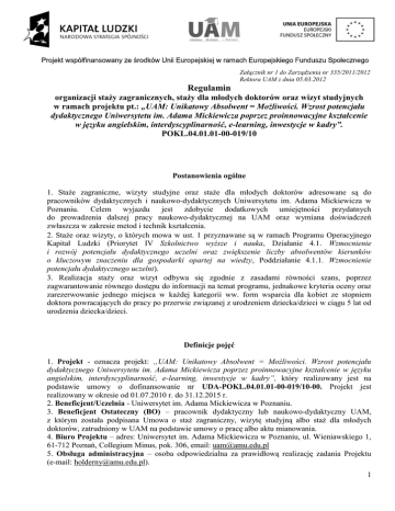 Załącznik nr 1 do Zarządzenia nr 335/2011/2012 Rektora UAM z dnia 05.03.2012 Regulamin organizacji staży zagranicznych, staży dla młodych doktorów oraz wizyt studyjnych w ramach projektu pt.: „UAM: Unikatowy Absolwent = Możliwości. Wzrost potencjału dydaktycznego Uniwersytetu im. Adama Mickiewicza poprzez proinnowacyjne kształcenie w języku angielskim, interdyscyplinarność, e-learning, inwestycje w kadry”. POKL.04.01.01-00-019/10 Postanowienia ogólne 1. Staże zagraniczne, wizyty studyjne oraz staże dla młodych doktorów adresowane są do pracowników dydaktycznych i naukowo-dydaktycznych Uniwersytetu im. Adama Mickiewicza w Poznaniu. Celem wyjazdu jest zdobycie dodatkowych umiejętności przydatnych do prowadzenia dalszej pracy naukowo-dydaktycznej na UAM oraz wymiana doświadczeń zwłaszcza w zakresie metod i technik kształcenia. 2. Staże oraz wizyty, o których mowa w ust. 1 przyznawane są w ramach Programu Operacyjnego Kapitał Ludzki (Priorytet IV Szkolnictwo wyższe i nauka, Działanie 4.1. Wzmocnienie i rozwój potencjału dydaktycznego uczelni oraz zwiększenie liczby absolwentów kierunków o kluczowym znaczeniu dla gospodarki opartej na wiedzy, Poddziałanie 4.1.1. Wzmocnienie potencjału dydaktycznego uczelni). 3. Realizacja staży oraz wizyt odbywa się zgodnie z zasadami równości szans, poprzez zagwarantowanie równego dostępu do informacji na temat programu, jednakowe kryteria oceny oraz zarezerwowanie jednego miejsca w każdej kategorii ww. form wsparcia dla kobiet ze stopniem doktora powracających do pracy po przerwie związanej z urodzeniem dziecka/dzieci w ciągu 5 lat od urodzenia dziecka/dzieci. Definicje pojęć 1. Projekt - oznacza projekt: „UAM: Unikatowy Absolwent = Możliwości. Wzrost potencjału dydaktycznego Uniwersytetu im. Adama Mickiewicza poprzez proinnowacyjne kształcenie w języku angielskim, interdyscyplinarność, e-learning, inwestycje w kadry”, który realizowany jest na podstawie umowy o dofinansowanie nr UDA-POKL.04.01.01-00-019/10-00. Projekt jest realizowany w okresie od 01.07.2010 r. do 31.12.2015 r. 2. Beneficjent/Uczelnia - Uniwersytet im. Adama Mickiewicza w Poznaniu. 3. Beneficjent Ostateczny (BO) – pracownik dydaktyczny lub naukowo-dydaktyczny UAM, z którym została podpisana Umowa o staż zagraniczny, wizytę studyjną albo staż dla młodych doktorów, zatrudniony w UAM na podstawie umowy o pracę albo aktu mianowania. 4. Biuro Projektu – adres: Uniwersytet im. Adama Mickiewicza w Poznaniu, ul. Wieniawskiego 1, 61-712 Poznań, Collegium Minus, pok. 306, email: [email protected] 5. Obsługa administracyjna – osoba odpowiedzialna za prawidłową realizację zadania Projektu (e-mail: [email protected]). 1 6. Kierownik projektu – osoba zarządzająca Projektem. 7. Aplikacja – zestaw dokumentów wraz z załącznikami wymagany od kandydatów ubiegających się o wyjazd zagraniczny, o którym mowa w niniejszym Regulaminie. 8. Uczelnia Przyjmująca – zagraniczne ośrodki akademickie lub zagraniczne ośrodki naukowobadawcze przyjmujące BO. 9. Staż zagraniczny (SZ) – forma pobytu realizowanego zgodnie z planem wyjazdu, trwającego 1 miesiąc w wiodących zagranicznych ośrodkach akademickich lub naukowo-badawczych dla kadry dydaktycznej i naukowo-dydaktycznej ze stopniem dr hab. lub tytułem profesora, przydatnego do prowadzenia pracy dydaktycznej. 10. Wizyta studyjna (WS) - forma pobytu realizowanego zgodnie z planem wyjazdu, trwającego 5 dni roboczych w wiodących zagranicznych ośrodkach akademickich lub naukowo-badawczych dla kadry dydaktycznej w celu poznania nowoczesnych metod kształcenia, poszerzenia wiedzy teoretycznej i praktycznej o najnowsze osiągnięcia z danej dziedziny. 11. Staż dla młodych doktorów (Postdoc) – forma pobytu realizowanego zgodnie z planem wyjazdu, trwającego 2 miesiące w wiodących zagranicznych ośrodkach akademickich lub naukowobadawczych dla kadry dydaktycznej i naukowo-dydaktycznej ze stopniem doktora, przydatnego do prowadzenia pracy dydaktycznej. 12. Umowa o wyjazd zagraniczny na SZ/ Postdoc/ WS – umowa zawarta pomiędzy UAM a BO określająca prawa i obowiązki stron umowy w związku z organizacją wyjazdu zagranicznego. 13. Plan stażu/wyjazdu – działania z zakresu dydaktyki (w przypadku SZ/WS) oraz z zakresu badań naukowych (w przypadku Postdoc), które BO zamierza podjąć podczas realizacji wyjazdu. 14. Komisja Kwalifikacyjna – komisja powołana w celu wyłonienia i zatwierdzenia BO na SZ/ Postdoc/ WS. 15. Młody doktor – osoba posiadająca stopień doktora nie dłużej niż 5 lat i która nie ukończyła 35 roku życia. 16. Strona Projektu – strona internetowa projektu www.unikat.amu.edu.pl Zasady organizacji SZ/ Postdoc/ WS 1. Zadanie dotyczące organizacji staży w zagranicznych ośrodkach akademickich i naukowobadawczych realizowane jest w okresie od 01.07.2011 roku do 31.12.2015 roku z zastrzeżeniem, że niniejszy regulamin dotyczy roku kalendarzowego 2012. 2. Wyjazdy zagraniczne SZ/ Postdoc/ WS adresowane są do BO, zainteresowanych możliwością wymiany doświadczeń na Uczelni Przyjmującej. 3. Bieżącą koordynacją nad właściwą organizacją SZ/ Postdoc/ WS zajmuje się Obsługa administracyjna. Uczestnicy SZ/Postdoc/WS O organizację SZ/ Postdoc/ WS mogą ubiegać się osoby spełniające następujące kryteria formalne: 1. Są pracownikami naukowo-dydaktycznymi lub dydaktycznymi zatrudnionymi na podstawie umowy o pracę lub aktu mianowania na UAM (nieprzebywającymi na urlopie: zdrowotnym, wychowawczym lub macierzyńskim). 2 2. Złożą aplikację o SZ/ Postdoc/ WS do Rady dej kategorii u w terminie wyznaczonym przez Komisję Kwalifikacyjną. 3. Posługują się językiem angielskim lub językiem kraju, w którym odbędzie się staż SZ/ Postdoc/ WS w stopniu, co najmniej komunikatywnym. 4. Uprawdopodobnią, że w wyniku realizacji SZ/ Postdoc/ WS podniosą swoje kompetencje oraz wzrośnie ich doświadczenie zwłaszcza 