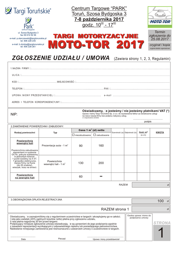 Centrum Targowe “PARK” Toruń, Szosa Bydgoska 3 7-8 października 2017 godz. 1000 - 1700 ul. Szosa Bydgoska 3 fax 56 612 02 56 e-mail: [email protected] tel. 606 228 235 e-mail: [email protected] tel. 606 228 261 TARGI MOTORYZACYJNE MOTO-TOR 2017 ZGŁOSZENIE UDZIAŁU / UMOWA Termin zgłoszenia do 25.08.2017 oryginał / kopia oryginał odesłać organizatorowi (Zawiera strony 1, 2, 3, Regulamin) 1 . N A Z WA F I R M Y: . . . . . . . . . . . . . . . . . . . . . . . . . . . . . . . . . . . . . . . . . . . . . . . . . . . . . . . . . . . . . . . . . . . . . . . . . . . . . . . . . . . . . . . . . . . . . . . . . . . . . . . . . . . . . . . . . . . . . . . . . . . . . . . . . . . . . . . . . . . . . . . . . . . . . . . . . . . . . . . . . . . . . . . . . . . . . . . . . . . ULICA: .......................................................................................................................................................................... KOD: ................................................... MIEJSCOWOŚĆ: .............................................................................................................................. TELEFON: ......................................................................................................... FAX: ............................................................................... U P O W A Ż N I O N Y P R Z E D S TA W I C I E L : . . . . . . . . . . . . . . . . . . . . . . . . . . . . . . . . . . . . . . . . . . . . . . . . . . . . e-mail ................................................................ ADRES I TELEFON KORESPONDENCYJNY: ................................................................................................................................................ Oświadczamy, że jesteśmy / nie jesteśmy płatnikami VAT (*) NIP: Upoważniamy Targi Toruńskie Sp. z o.o. do wystawiania faktur za świadczone usługi na rzecz naszej firmy bez podpisu nabywcy usług. (*) niepotrzebne skreślić ............................................ podpis 2.ZAMÓWIENIE POWIERZCHNI I ZABUDOWY: Cena 1 m2 (zł) netto Rodzaj powierzchni Powierzchnia wewnątrz hali Powierzchnia zabudowana elementami w systemie OCTA, pokryta wykładziną w jednolitym kolorze, 1 punkt świetlny na 4 m2, 1 gniazdko elektryczne, nazwa firmy na fryzie (do 20 znaków), wieszak, kosz na śmieci. Typ Szerokość (a) Głębokość (b) ¨ niezabudowana ¨ zabudowana Prezentacja auta - 1 m2 90 160 Powierzchnia wewnątrz hali - 1 m2 130 200 60 - Powierzchnia na zewnątrz hali Ilość m2 KWOTA (a x b) RAZEM 3.OBOWIĄZKOWA OPŁATA REJESTRACYJNA zł 100 RAZEM strona 1 Oświadczamy, że zaznajomiliśmy się z regulaminem uczestnictwa w targach i akceptujemy go w całości. I rata jako zadatek (45% ogólnych kosztów netto) płatna przy zgłoszeniu udziału, II rata płatna najpóźniej 30 dni przed targami. Podpisujący niniejsze zgłoszenie-umowę oświadczają, że są uprawnieni do jego podpisania zgodnie z zasadami reprezentacji wynikającymi z odpowiedniego rejestru lub posiadającego pełnomocnictwa. Nadesłanie niniejszego zamówienia jest równoznaczne z zawarciem umowy o uczestnictwie w targach. ..................................... Data ...................................................... Pieczęć Upoważniony przedstawiciel zł zł Osoba upoważniona do podpisania umowy STRONA 1 4. WYPOŻYCZENIE WYPOSAŻENIA DODATKOWEGO: Cena netto zł Nazwa L.P. Ilość Wartość zł 1. Podest ......................................................................................55 ...... ................. 2. Wykładzina 1m2........................................................................60 ...... ................. 3. Wykładzina 1m2 (zmiana koloru w zamowionej pow. zab.)........20 ...... ................. 4. Gablota szklana.......................................................................100 ...... ................. oryginał / kopia 5. Lada .........................................................................................85 ...... ................. oryginał odesłać organizatorowi 6. Lada łukowa.............................................................................115 ...... ................. 7. Witryna szklana........................................................................170 ...... ................. 8. Półka ........................................................................................50 ...... ................. 9. Regał z trzema półkami............................................................130 ...... ................. 10. Szafka kuchenna.......................................................................95 ...... ................. 11. Szafka biurowa..........................................................................95 ...... ................. 12. Stolik drewniany........................................................................65 ...... ................. 13. Krzesło ....................................................................................35 ...... ................. 14. Krzesło tapicerowane................................................................55 ...... ................. 15. Taboret barowy..........................................................................80 ...... ................. 16. Drzwi harmonijkowe z zamkiem...............................................165 ...... ................. 17. Zasłonka...................................................................................50 ...... ................. 18. Dodatkowa ścianka działowa 1mb.............................................70 ...... ................. 19. Ścianka ażurowa (szyba+żaluzja)............................................125 ...... ................. 20. Lodówka..................................................................................220 ...... ................. 21. Podlaczenie dodatkowego gniazda elektr. do 2 kW (10A)........110 ...... ................. 22. Moc od 2 kW do 15 kW (