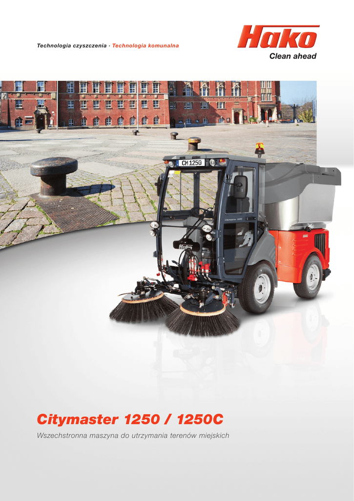 Technologia czyszczenia · Technologia komunalna Citymaster 1250 / 1250C Wszechstronna maszyna do utrzymania terenów miejskich Citymaster 1250 / 1250C - maszyna do całorocznego użytku Tak wszechstronna jak życie w mieście Wielofunkcyjność działania Citymaster 1250 jest zawsze wyposażony zgodnie z indywidualnym zamówieniem, aby jak najlepiej odpowiadać na potrzeby użytkowników. Łatwe w montażu akcesoria redukują czas potrzebny na obsługę techniczną maszyny, co jeszcze bardziej zwiększa efektywność jej pracy. Konserwacja silnika i chłodnicy, to proste czynności, dzięki łatwemu dostępowi przez szeroko otwieraną platformę załadunkową, zbiorniki, a także tylne drzwi. Citymaster 1250 wyróżnia się długim okresem użytkowania, co zawdzięcza wyjątkowo solidnej konstrukcji. W połączeniu z regularną obsługą serwisową Hako, daje gwarancję wielu lat niezawodnej pracy. Citymaster 1250 odpowie na wszystkie potrzeby Twojego miasta Dla najlepszych wyników Dla dokładnego Do skutecznej pracy Dla doskonałego w zamiataniu: czyszczenia na mokro: zimą: Citymaster 1250C utrzymania trawników: Citymaster 1250 Citymaster 1250 • Bogata oferta przedniego Citymaster 1250C • Duże szczotki obrotowe CityCleaner osprzętu obejmuje akcesoria • Połączone systemy koszenia Wydajność użycia Jakość w cenie zamiatają śmieci do central- • Trzy obrotowe szczotki do zamiatania i odśnieżania, i zasysania zapewniają Citymaster 1250 nie tylko pozostawi Solidna i łatwa u utrzymaniu konstrukcja nej dyszy zasysającej, skąd zapewniają dokładne aby jak najlepiej dopasować najlepsze efekty pracy. poczucie czystości na terenach miejskich, maszyny pozwala na znaczne obniżenie następnie przenoszone są czyszczenie nawet najbar- się do panujących • Centralna ssawa umożliwia ale także zadba o jak najlepsze kosztów użytkowania i serwisowania. do głównego zbiornika przez dziej uporczywego brudu. warunków. pracę blisko krawędzi oraz wykorzystanie Twoich zasobów. Szeroki wybór dodatkowego osprzętu mocną i cicho pracującą Brudna woda zasysana jest • Tylne posypywarki wysoki zrzut, aż do 1,90 m. W połączeniu z idealnie dopasowanymi gwarantuje indywidualne dopasowanie dmuchawę. do zbiornika przez wysoko przystosowane są do użycia • Kosiarka (szerokość robocza akcesoriami dodatkowymi, maszyna funkcji maszyny do potrzeb klienta, • Dysze natryskujące, wydajną ssawę. soli, piasku, czy specjalnego do 1,80 m z tylnym i bocznym skutecznie poradzi sobie z każdym a firma Hako zapewnia również atrakcyjne system obiegu wody i filtr • System recyklingu wody, granulatu. opróżnianiem) oraz tylna zadaniem, zapewniając komfort pracy sposoby finansowania. wodny zapewniają a także szeroki wybór • System natryskiwania kosiarka do użycia na dużych i jednocześnie dbając o środowisko. minimalną emisję pyłu. szczotek pozwalają osiągać solanką połączony z 500 l obszarach (szerokość robocza Prosta obsługa oznacza krótki i łatwy • Skuteczny system redukcji najlepsze rezultaty zbiornikiem, pozwala na do 2,50 m). proces nauki jej działania, pozwalając hałasu oaz efektywna sprzątania na każdej użycie tego środka w miej- • Kosiarka wysięgnikowa tym samym skupić się na realizacji pracy emisja wydechu spalin, powierzchni. scu, gdzie inne z regulacją do rzadziej bez zbędnych problemów. zmniejszają zanieczyszcze- • Prosty system dozowania detergenty nie mogą używanych obszarów i ścieżek nie środowiska. środków chemicznych. być użyte. (szerokość robocza 1,40 m). • Maszyna przeznaczona także do czyszczenia śladów po oleju, zgodnie z DWA-M-715. 2 3 Citymaster 1250/1250C - wysokowydajna zamiatarka Wydajność pracy połączona z ochroną środowiska Uniwersalne rozwiązanie dla czystego miasta Wszechstronność Citymaster 1250 to maszyna przeznaczona do najbardziej wszechstronnego użytku na terenach zewnętrznych. Podwozie z przegubowym połączeniem oraz zintegrowaną płynną się na wykonywanej pracy. Skuteczny system ogrzewania, jak i dodatkowa opcja klimatyzacji, wraz z wygodnym fotelem kierowcy i systemem redukcji hałasu, zapewniają komfortową pracę przez cały rok. kompensację ruchu, ułatwiają utrzymanie Użytkowanie pojazdu i zapewniają bezpieczną jazdę Sercem maszyny Citymaster 1250 w każdych warunkach. Doskonała jest przyjazny dla środowiska silnik diesel zwrotność i łatwość prowadzenia zarówno o wysokiej mocy. Niskie zużycie paliwa na terenach płaskich, jak i wyboistych. i redukcja emisji spalin (97/68/EU Stage Mocny, hydrostatyczny, połączony z opcją llla), a także system wyciszania przepływu na 4 koła napęd, który może być powietrza sprawiają, że jest to idealna dodatkowo wyposażony w blokadę maszyna do centrum miasta obszarów mechanizmu różnicowego. turystycznych. Łatwy w obsłudze i wydajny Skuteczność i komfort pracy Obsługa Citymaster 1250 jest 1 2 4 5 3 Wybór 1) Komfortowe 3) Wygodna kabina Citymaster 1250 dostępny jest w dwóch wersjach: miejsce pracy Kabina z obudowanymi Citymaster 1250 - podstawowy model, idealny do Przestronna kabina drzwiami, otwieranymi zamiatania i sprzątania na mokro (z dostępnymi opcjami z doskonałą widocznością szybami oraz system dodatkowymi); oraz Citymaster 1250C - wielofunkcyjny obszaru pracy oraz niskim ogrzewania i klimatyzacji. pojazd przystosowany do różnych zadań. poziomem hałasu Citymaster 1250C to model opierający się na w środku. podstawowym wyposażeniu i funkcjach, które można dowolnie poszerzać zgodnie z indywidualnym zapotrzebowaniem. 4) Silnik diesel Oszczędny i mocny 2) Wygoda użytkowania z łatwym dostępem Fotel kierowcy do konserwacji. na poduszce powietrznej oraz dobrze zaprojektowany panel obsługi pojazdu. 5) Uniwersalny system Wydajny system hydrauliczny, z łatwymi w obsłudze połączeniami. system hydrauliczny usprawnia pracę dodatkowego osprzętu. wyjątkowo prosta. Dzię