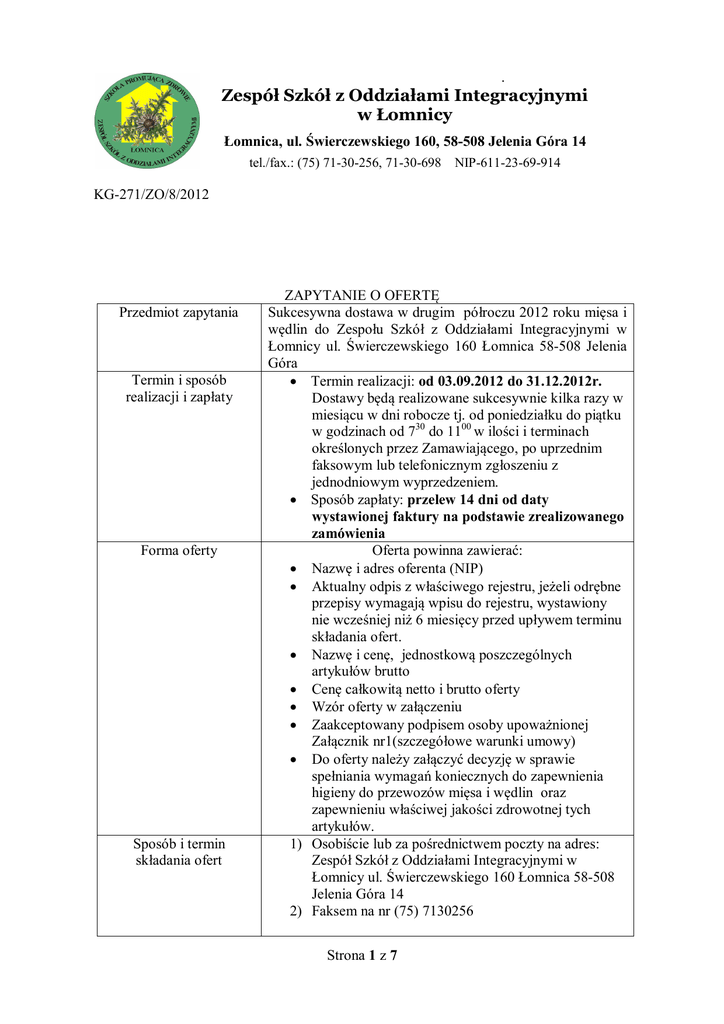 . Zespół Szkół z Oddziałami Integracyjnymi w Łomnicy Łomnica, ul. Świerczewskiego 160, 58-508 Jelenia Góra 14 tel./fax.: (75) 71-30-256, 71-30-698 NIP-611-23-69-914 KG-271/ZO/8/2012 Przedmiot zapytania Termin i sposób realizacji i zapłaty Forma oferty Sposób i termin składania ofert ZAPYTANIE O OFERTĘ Sukcesywna dostawa w drugim półroczu 2012 roku mięsa i wędlin do Zespołu Szkół z Oddziałami Integracyjnymi w Łomnicy ul. Świerczewskiego 160 Łomnica 58-508 Jelenia Góra Termin realizacji: od 03.09.2012 do 31.12.2012r. Dostawy będą realizowane sukcesywnie kilka razy w miesiącu w dni robocze tj. od poniedziałku do piątku w godzinach od 730 do 1100 w ilości i terminach określonych przez Zamawiającego, po uprzednim faksowym lub telefonicznym zgłoszeniu z jednodniowym wyprzedzeniem. Sposób zapłaty: przelew 14 dni od daty wystawionej faktury na podstawie zrealizowanego zamówienia Oferta powinna zawierać: Nazwę i adres oferenta (NIP) Aktualny odpis z właściwego rejestru, jeżeli odrębne przepisy wymagają wpisu do rejestru, wystawiony nie wcześniej niż 6 miesięcy przed upływem terminu składania ofert. Nazwę i cenę, jednostkową poszczególnych artykułów brutto Cenę całkowitą netto i brutto oferty Wzór oferty w załączeniu Zaakceptowany podpisem osoby upoważnionej Załącznik nr1(szczegółowe warunki umowy) Do oferty należy załączyć decyzję w sprawie spełniania wymagań koniecznych do zapewnienia higieny do przewozów mięsa i wędlin oraz zapewnieniu właściwej jakości zdrowotnej tych artykułów. 1) Osobiście lub za pośrednictwem poczty na adres: Zespół Szkół z Oddziałami Integracyjnymi w Łomnicy ul. Świerczewskiego 160 Łomnica 58-508 Jelenia Góra 14 2) Faksem na nr (75) 7130256 Strona 1 z 7 Termin składania ofert upływa w dniu 09 sierpnia 2012 r. Najniższa cena Daniel Cisek- tel./fax (75) 7130256 [email protected] Zgodnie z art. 4 pkt 8 Ustawy z dn. 29.01.2004 r. Prawo Zamówień Publicznych (t.j. Dz. U. z 2010 r. Nr 113, poz. 759 ) wobec zamówienia nie stosuje się ustawy Prawo Zamówień Publicznych. W związku z powyższym niniejsze zaproszenie do składania ofert nie jest zamówieniem i otrzymane od Państwa ofert nie powoduje żadnych zobowiązań wobec stron. O ewentualnym wybraniu Państwa oferty zostaniecie Państwo poinformowani poprzez zaproszenie do podpisania umowy. Kryteria oceny ofert Szczegółowe informacje Strona 2 z 7 ………………………….. ……………………………….. Miejscowość , data ………………………….. ………………………….. … Nazwa oferenta (adres, dane kontaktowe, ) Zespół Szkół z Oddziałami Integracyjnymi w Łomnicy ul. Świerczewskiego 160 Łomnica 58-508 Jelenia Góra 14 Odpowiadając na zapytanie ofertowe dotyczące Sukcesywnej dostawy w drugim półroczu 2011 roku mięsa i wędlin do Zespołu Szkół z Oddziałami Integracyjnymi w Łomnicy, Łomnica ul Świerczewskiego 160 58-508 Jelenia Góra 14, składam ofertę następującej treści: Tabela nr 1 L.p. Przedmiot dostawy Jednostka ilość miary 1 2 3 4 1 Wątroba drobiowa kg 31 2 Schab (bez kości) kg 87 3 Podgardle wędzone kg 67 4 Porcje rosołowe drobiowe kg 460 5 Łopatka (bez kości) kg 549 6 Karkówka (bez kości) kg 69 7 Kiełbasa Zwyczajna kg 140 8 Filet z piersi kurczaka kg 144 9 Kurczak świeży kg 273 Cena jednostkowa brutto za 1 szt./kg/litr Wartość Brutto (kol.4 x kol.5) 5 8 Strona 3 z 7 10 11 Mortadela kg 42 Udko z kurczaka kg 283 Zamawiający zastrzega sobie możliwość zmiany ilości asortymentu o +/- 20% wartości zamówienia. Proponujemy realizację całości zamówienia wartość brutto ( z VAT)......................................................................... (słownie:.............................................................................................................................złotych) Przyjmuję do realizacji warunki postawione przez zamawiającego w zapytaniu i oświadczam, że jestem płatnikiem VAT o numerze identyfikacyjnym NIP …………………………….. ………………… …………………………… Podpis osoby upoważnionej Załączniki: 1. decyzja w sprawie spełniania wymagań koniecznych do zapewnienia higieny do przewozów mięsa i wędlin oraz zapewnieniu właściwej jakości zdrowotnej tych artykułów. 2. Aktualny odpis z właściwego rejestru, jeżeli odrębne przepisy wymagają wpisu do rejestru, wystawiony nie wcześniej niż 6 miesięcy przed upływem terminu składania ofert. 3. Zaakceptowany podpisem osoby upoważnionej Załącznik nr1(szczegółowe warunki umowy) Strona 4 z 7 Załącznik nr 1- Szczegółowe warunki umowy § 1 Zamawiający zleca, a dostawca przyjmuje do realizacji dostarczenie mięsa i wędlin do Zespołu Szkół z Oddziałami Integracyjnymi w Łomnicy. §2 1. Dostawca zobowiązuje się do dostarczenia w/w asortymentu, który to odpowiada normom jakościowym obowiązującym w Rzeczpospolitej Polskiej. 2. Warunki transportu muszą odpowiadać wymogom sanitarnym i przepisom HACCP. 3. Dostawca zobowiązuje się do dostarczenia towaru zgodnie z wymaganiami i procedurami niezbędnymi dla zapewnienia bezpieczeństwa żywności i żywienia określonymi w ustawie z dnia 25.08.2006r. “o bezpieczeństwie żywności i żywienia”(Dz.U. Nr 171 poz.1225 z późn. zmianami), własnym środkiem transportu posiadającym odpowiednie wymogi sanitarne. 4. Dostarczane artykuły będą spełniały Polskie Normy przenoszące europejskie normy zharmonizowane. §3 1. Dostawy będą realizowane sukcesywnie kilka razy w miesiącu w dni robocze tj. od poniedziałku do piątku w godzinach od 730 do 1100 w ilości i terminach określonych przez Zamawiającego, po uprzednim faksowym lub telefonicznym zgłoszeniu z co najmniej jednodniowym wyprzedzeniem. 2. Zamawiający zastrzega sobie prawo wprowadzenia na dzień przed dostawą korekty ilości dostarczonych asortymentów. 3. Dostawca dostarcza zamówiony towar