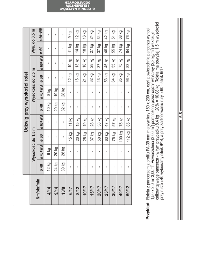 - 6/17 8/12 10/17 15/17 20/17 25/17 30/17 40/17 50/12 112 kg 100 kg 75 kg 63 kg 50 kg 37 kg 25 kg 20 kg 15 kg 85 kg 75 kg 57 kg 47 kg 38 kg 28 kg 19 kg 15 kg 11 kg 27 kg 37 kg 46 kg 28 kg 37 kg 45 kg 32 kg 43 kg 53 kg - - - - - - - - - - - - - 96 kg 85 kg 83 kg 75 kg 84 kg 74 kg 55 kg 18 kg 18 kg 21 kg - - 55 kg 12 kg 14 kg 13 kg 16 kg - - 64 kg 9 kg 11 kg 10 kg 12 kg - 76 kg 68 kg 51 kg 42 kg 34 kg 24 kg 16 kg - - - 28 kg - - - 19 kg 20 kg 32 kg - - - - ø 60+WB 8 kg ø 60+WB ø 60 Wys. do 3,5 m 10 kg ø 40+WB ø 60 Wysokość do 2,5 m 6.8 Przykład: Roleta z pancerzem z profilu PA-39 mm ma wymiary 150 x 200 cm, czyli powierzchnia pancerza wynosi 2 2 2 1,50 x 2,0 m=3,00m . Powierzchnia (3,00 m ) pomnożona przez ciężar właściwy (2,8 kg/m ) wskazuje całkowitą wagę pancerza - w tym przypadku 8,4 kg + 20% = 10,08 kg. Roleta ma powyżej 1,5 m wysokości przy rurze ø 40 wybieramy silnik 9/14, a przy zastosowaniu rury ø 60 - silnik 6/17 - - - - - - - - - - 39 kg 13/8 - - - 20 kg 24 kg 9/14 28 kg - - ø 60+WB ø 40 9 kg ø 40+WB ø 60 12 kg ø 40 Wysokość do 1,5 m 4/14 Nm/obr/min Udźwig przy wysokości rolet * - nie stosować z silnikami przewodowymi SOMFY na rurę ø40 oraz silnikami SOLUS, LT NHK. Do podanych cen należy doliczyć podatek VAT 6. CENNIK NAPĘDÓW I ELEMENTÓW DODATKOWYCH