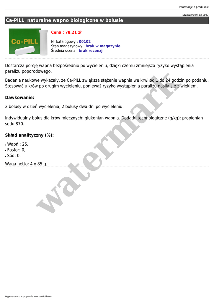 Informacje o produkcie Utworzono 07-03-2017 Ca-PILL naturalne wapno biologiczne w bolusie Cena : 78,21 zł Nr katalogowy : 00102 Stan magazynowy : brak w magazynie Średnia ocena : brak recenzji Dostarcza porcję wapna bezpośrednio po wycieleniu, dzięki czemu zmniejsza ryzyko wystąpienia paraliżu poporodowego. Dawkowanie: er m ar k Badania naukowe wykazały, że Ca-PILL zwiększa stężenie wapnia we krwi od 1 do 24 godzin po podaniu. Stosować u krów po drugim wycieleniu, ponieważ ryzyko wystąpienia paraliżu nasila się z wiekiem. 2 bolusy w dzień wycielenia, 2 bolusy dwa dni po wycieleniu. Indywidualny bolus dla krów mlecznych: glukonian wapnia. Dodatki technologiczne (g/kg): propionian sodu 870. Skład analityczny (%): ● ● ● Wapń : 25, Fosfor: 0, Sód: 0. w at Waga netto: 4 x 85 g. Wygenerowano w programie www.oscGold.com