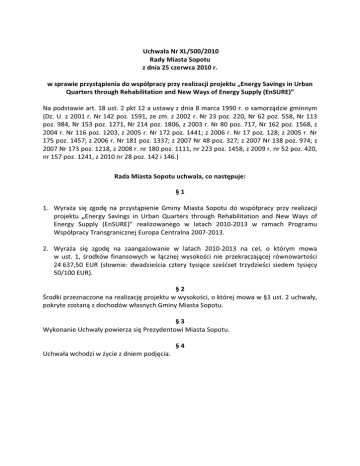 Uchwała Nr XL/500/2010 Rady Miasta Sopotu z dnia 25 czerwca 2010 r. w sprawie przystąpienia do współpracy przy realizacji projektu „Energy Savings in Urban Quarters through Rehabilitation and New Ways of Energy Supply (EnSURE)” Na podstawie art. 18 ust. 2 pkt 12 a ustawy z dnia 8 marca 1990 r. o samorządzie gminnym (Dz. U. z 2001 r. Nr 142 poz. 1591, ze zm. z 2002 r. Nr 23 poz. 220, Nr 62 poz. 558, Nr 113 poz. 984, Nr 153 poz. 1271, Nr 214 poz. 1806, z 2003 r. Nr 80 poz. 717, Nr 162 poz. 1568, z 2004 r. Nr 116 poz. 1203, z 2005 r. Nr 172 poz. 1441; z 2006 r. Nr 17 poz. 128; z 2005 r. Nr 175 poz. 1457; z 2006 r. Nr 181 poz. 1337; z 2007 Nr 48 poz. 327; z 2007 Nr 138 poz. 974; z 2007 Nr 173 poz. 1218, z 2008 r. nr 180 poz. 1111, nr 223 poz. 1458, z 2009 r. nr 52 poz. 420, nr 157 poz. 1241, z 2010 nr 28 poz. 142 i 146.) Rada Miasta Sopotu uchwala, co następuje: §1 1. Wyraża się zgodę na przystąpienie Gminy Miasta Sopotu do współpracy przy realizacji projektu „Energy Savings in Urban Quarters through Rehabilitation and New Ways of Energy Supply (EnSURE)” realizowanego w latach 2010-2013 w ramach Programu Współpracy Transgranicznej Europa Centralna 2007-2013. 2. Wyraża się zgodę na zaangażowanie w latach 2010-2013 na cel, o którym mowa w ust. 1, środków finansowych w łącznej wysokości nie przekraczającej równowartości 24 637,50 EUR (słownie: dwadzieścia cztery tysiące sześćset trzydzieści siedem tysięcy 50/100 EUR). §2 Środki przeznaczone na realizację projektu w wysokości, o której mowa w §1 ust. 2 uchwały, pokryte zostaną z dochodów własnych Gminy Miasta Sopotu. §3 Wykonanie Uchwały powierza się Prezydentowi Miasta Sopotu. Uchwała wchodzi w życie z dniem podjęcia. §4 UZASADNIENIE Projekt pn. „Energy Savings in Urban Quarters through Rehabilitation and New Ways of Energy Supply (EnSURE)” ma na celu podjęcie działań Projekt uzyskał dofinansowanie w ramach Programu Współpracy Transgranicznej Europa Centralna 2007-2013, Priorytetu 3: Wspieranie wykorzystywania źródeł energii odnawialnej i zwiększania efektywności energetycznej. Wniosek aplikacyjny został złożony przez Lidera we Wspólnym Sekretariacie Technicznym w marcu 2009 r. w ramach II naboru wniosków. W 11.2009 r. Komitet Monitorujący dla Programu Europa Środkowa podjął decyzję o zatwierdzeniu i przyznaniu dotacji dla projektu. Liderem Projektu jest Miasto Ludwigsburg, Niemcy Projekt realizowany jest w partnerstwie z : § Development Agency GAL Genovese (Agencja Rozwoju GAL w Genui), Włochy § SIPRO County Board for Development (SIPRO Regionalna Rada Rozwoju), Włochy § Miasto Faenza, Włochy § Eastern-Hungarian Initiations Foundation, Węgry § BSC, Bussiness support Centre Itd. Kranj (Centrum Wsparcia Biznesu), Słowenja § REsidentail Building Cooperative „Praga”of the City of Warsaw (Robotnicza Spółdzielnia Mieszkaniowa Praga, Polska § Budapest University of Technology and Economics ( Politechnika w Budapeszcie), Węgry § Hungarian Urban Knowledge Centre, Węgry § Federal Foundation for Baukultur represented by Foderverein Bundesstiftung Baukultur e.V., Niemcy § Agenda 21 Consulting Ltd., Włochy § Finolombarda, Włochy W ramach projektu Gmina Miasta Sopotu zamierza przygotować dokumentację techniczną (audyt energetyczny, projekt budowlany, projekt prac konserwatorskich) oraz przeprowadzić modelową rewitalizację wybranego budynku wpisanego do rejestru zabytków. Ponadto zostanie wykonane siedem certyfikatów energetycznych dla budynków oświatowych, które zostały termomodernizowane w latach 2009-2010. W czasie realizacji projektu Partnerzy dzielić się będą dotychczas zdobytym doświadczeniem oraz wypracowywanymi nowymi rozwiązaniami w zakresie wprowadzania rozwiązań prowadzących do oszczędności energii w budynkach mieszkalnych oraz budynkach użyteczności publicznej. Budżet Gminy Miasta Sopotu w ramach projektu to: 164 250,00 EUR, w tym 24 637,00 EUR (15%) wkładu własnego. Okres realizacji: maj 2010 – kwiecień 2013.