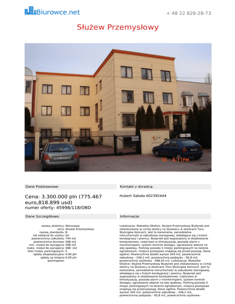 + 48 22 828-28-73 Służew Przemysłowy Dane Podstawowe: Kontakt z doradcą: Cena: 3.300.000 pln (775.467 euro,818.899 usd) Hubert Sabała 602392444 numer oferty: 45998/118/OBD Dane Szczegółowe: nazwa_dzielnicy: Warszawa ulica: Służew Przemysłowy nazwa_standardu: B rok oddania do użytku: bd powierzchnia całkowita: 744 m2 powierzchnia biurowa: 588 m2 min. moduł do wynajęcia: 588 m2 maks. moduł do wynajęcia: 588 m2 ilość miejsc parkingowych: 5 opłaty eksploatacyjne: 0.00 pln opłaty za miejsce 0.00 pln parkingowe: Informacje: Lokalizacja: Mokotów Okolice: Służew Przemysłowy Budynek jest zlokalizowany w cichej okolicy na Służewcu w okolicach Toru Wyścigów Konnych. Jest to kameralna, samodzielna nieruchomość w zabudowie szeregowej, składająca się z trzech kondygnacji i piwnicy. Budynek jest wyposażony w okablowanie komputerowe, częściowo w klimatyzację, posiada alarm z monitoringiem, system kontroli dostępu, ogrzewanie własne na olej opałowy. Parking posiada 5 miejsc parkingowych na terenie ogrodzonym, miejsca postojowe znajdują się przed posesją. Dane ogólne: Powierzchnia działki wynosi 344 m2, powierzchnia zabudowy - 248,2 m2, powierzchnia podjazdu - 95,8 m2, powierzchnia użytkowa - 588,50 m2. Lokalizacja: Mokotów Okolice: Służew Przemysłowy Budynek jest zlokalizowany w cichej okolicy na Służewcu w okolicach Toru Wyścigów Konnych. Jest to kameralna, samodzielna nieruchomość w zabudowie szeregowej, składająca się z trzech kondygnacji i piwnicy. Budynek jest wyposażony w okablowanie komputerowe, częściowo w klimatyzację, posiada alarm z monitoringiem, system kontroli dostępu, ogrzewanie własne na olej opałowy. Parking posiada 5 miejsc parkingowych na terenie ogrodzonym, miejsca postojowe znajdują się przed posesją. Dane ogólne: Powierzchnia działki wynosi 344 m2, powierzchnia zabudowy - 248,2 m2, powierzchnia podjazdu - 95,8 m2, powierzchnia użytkowa - 588,50 m2. Lokalizacja: Mokotów Okolice: Służew Przemysłowy Budynek jest zlokalizowany w cichej okolicy na Służewcu w okolicach Toru Wyścigów Konnych. Jest to kameralna, samodzielna nieruchomość w zabudowie szeregowej, składająca się z trzech kondygnacji i piwnicy. Budynek jest wyposażony w okablowanie komputerowe, częściowo w klimatyzację, posiada alarm z monitoringiem, system kontroli dostępu, ogrzewanie własne na olej opałowy. Parking posiada 5 miejsc parkingowych na terenie ogrodzonym, miejsca postojowe znajdują się przed posesją. Dane ogólne: Powierzchnia działki wynosi 344 m2, powierzchnia zabudowy - 248,2 m2, powierzchnia podjazdu - 95,8 m2, powierzchnia użytkowa - 588,50 m2. Cena sprzedaży wynosi 4435 zł/m2. Dostępność: od zaraz biurowce.net Adres:ul. Konduktorska 4 lok. 30, Warszawa, [email protected]