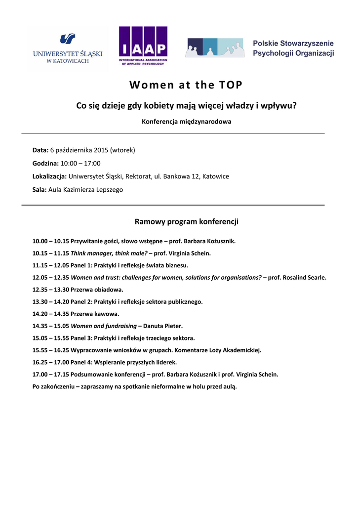 Wom en at th e T OP Co się dzieje gdy kobiety mają więcej władzy i wpływu? Konferencja międzynarodowa Data: 6 października 2015 (wtorek) Godzina: 10:00 – 17:00 Lokalizacja: Uniwersytet Śląski, Rektorat, ul. Bankowa 12, Katowice Sala: Aula Kazimierza Lepszego Ramowy program konferencji 10.00 – 10.15 Przywitanie gości, słowo wstępne – prof. Barbara Kożusznik. 10.15 – 11.15 Think manager, think male? – prof. Virginia Schein. 11.15 – 12.05 Panel 1: Praktyki i refleksje świata biznesu. 12.05 – 12.35 Women and trust: challenges for women, solutions for organisations? – prof. Rosalind Searle. 12.35 – 13.30 Przerwa obiadowa. 13.30 – 14.20 Panel 2: Praktyki i refleksje sektora publicznego. 14.20 – 14.35 Przerwa kawowa. 14.35 – 15.05 Women and fundraising – Danuta Pieter. 15.05 – 15.55 Panel 3: Praktyki i refleksje trzeciego sektora. 15.55 – 16.25 Wypracowanie wniosków w grupach. Komentarze Loży Akademickiej. 16.25 – 17.00 Panel 4: Wspieranie przyszłych liderek. 17.00 – 17.15 Podsumowanie konferencji – prof. Barbara Kożusznik i prof. Virginia Schein. Po zakończeniu – zapraszamy na spotkanie nieformalne w holu przed aulą.