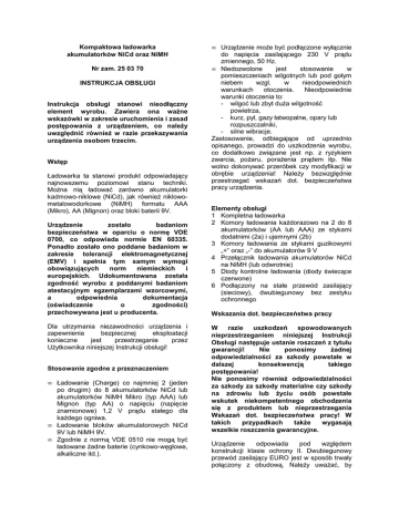 Kompaktowa ładowarka akumulatorków NiCd oraz NiMH Nr zam. 25 03 70 INSTRUKCJA OBSŁUGI Instrukcja obsługi stanowi nieodłączny element wyrobu. Zawiera ona ważne wskazówki w zakresie uruchomienia i zasad postępowania z urządzeniem, co należy uwzględnić również w razie przekazywania urządzenia osobom trzecim. Wstęp Ładowarka ta stanowi produkt odpowiadający najnowszemu poziomowi stanu techniki. Można nią ładować zarówno akumulatorki kadmowo-niklowe (NiCd), jak również niklowometalowodorkowe (NiMH) formatu AAA (Mikro), AA (Mignon) oraz bloki baterii 9V. Urządzenie zostało badaniom bezpieczeństwa w oparciu o normę VDE 0700, co odpowiada normie EN 60335. Ponadto zostało ono poddane badaniom w zakresie tolerancji elektromagnetycznej (EMV) i spełnia tym samym wymogi obowiązujących norm niemieckich i europejskich. Udokumentowana została zgodność wyrobu z poddanymi badaniom atestacyjnym egzemplarzami wzorcowymi, a odpowiednia dokumentacja (oświadczenie o zgodności) przechowywana jest u producenta. Dla utrzymania niezawodności urządzenia i zapewnienia bezpiecznej eksploatacji konieczne jest przestrzeganie przez Użytkownika niniejszej Instrukcji obsługi! Stosowanie zgodne z przeznaczeniem • Ładowanie (Charge) co najmniej 2 (jeden po drugim) do 8 akumulatorków NiCd lub akumulatorków NiMH Mikro (typ AAA) lub Mignon (typ AA) o napięciu (napięcie znamionowe) 1,2 V prądu stałego dla każdego ogniwa. • Ładowanie bloków akumulatorowych NiCd 9V lub NiMH 9V. • Zgodnie z normą VDE 0510 nie mogą być ładowane żadne baterie (cynkowo-węglowe, alkaliczne itd.). • Urządzenie może być podłączone wyłącznie do napięcia zasilającego 230 V prądu zmiennego, 50 Hz. • Niedozwolone jest stosowanie w pomieszczeniach wilgotnych lub pod gołym niebem wzgl. w nieodpowiednich warunkach otoczenia. Nieodpowiednie warunki otoczenia to: - wilgoć lub zbyt duża wilgotność powietrza, - kurz, pył, gazy łatwopalne, opary lub rozpuszczalniki, - silne wibracje. Zastosowanie, odbiegające od uprzednio opisanego, prowadzi do uszkodzenia wyrobu, co dodatkowo związane jest np. z ryzykiem zwarcia, pożaru, porażenia prądem itp. Nie wolno dokonywać przeróbek czy modyfikacji w obrębie urządzenia! Należy bezwzględnie przestrzegać wskazań dot. bezpieczeństwa pracy urządzenia. Elementy obsługi 1 Kompletna ładowarka 2 Komory ładowania każdorazowo na 2 do 8 akumulatorków (AA lub AAA) ze stykami dodatnimi (2a) i ujemnymi (2b) 3 Komory ładowania ze stykami guzikowymi „+” oraz „-” do akumulatorów 9 V 4 Przełącznik ładowania akumulatorów NiCd na NiMH (lub odwrotnie) 5 Diody kontrolne ładowania (diody świecące czerwone) 6 Podłączony na stałe przewód zasilający (sieciowy), dwubiegunowy bez zestyku ochronnego Wskazania dot. bezpieczeństwa pracy W razie uszkodzeń spowodowanych nieprzestrzeganiem niniejszej Instrukcji Obsługi następuje ustanie roszczeń z tytułu gwarancji! Nie ponosimy żadnej odpowiedzialności za szkody powstałe w dalszej konsekwencją takiego postępowania! Nie ponosimy również odpowiedzialności za szkody za szkody materialne czy szkody na zdrowiu lub życiu osób powstałe wskutek niekompetentnego obchodzenia się z produktem lub nieprzestrzegania Wskazań dot. bezpieczeństwa pracy! W takich przypadkach także wygasają wszelkie roszczenia gwarancyjne. Urządzenie odpowiada pod względem konstrukcji klasie ochrony II. Dwubiegunowy przewód zasilający EURO jest w sposób trwały połączony z obudową. Należy uważać, by izolacja (obudowy wzgl. przewodu sieciowego) nie uległa uszkodzeniu ani zniszczeniu. Urządzenia do ładowania akumulatorów i akcesoria muszą być przechowywane w miejscach niedostępnych dla dzieci. Urządzenie należy uruchamiać jedynie po dokładnym zamknięciu i przykręceniu obudowy. Ładowarki nie mogą być pozostawiane podczas eksploatacji bez nadzoru. W przypadku uszkodzenia zasilacze sieciowe i ładowarki mogą wytwarzać stanowiące zagrożenie napięcie stałe powyżej 50 V, również wtedy, gdy podane napięcie wyjściowe tych urządzeń jest niższe. Podczas prac prowadzonych pod napięciem wolno używać wyłącznie narzędzi wyraźnie dopuszczonych do stosowania w tym celu. Należy unikać eksploatacji w nieodpowiednich warunkach otoczenia. Prowadzi to do uszkodzenia wrażliwej części elektronicznej wewnątrz urządzenia, a tym samym do ewentualnego narażenia życia Użytkownika. Nieodpowiednie warunki otoczenia to: - zbyt duża wilgotność powietrza (wilgotność wzgl. > 75 %, tworzenie się skroplin), - wilgoć, - kurz, pył, gazy łatwopalne, opary lub rozpuszczalniki, benzyna, - zbyt wysoka temperatura otoczenia (> ok. +40°C), - silne pola elektromagnetyczne (silniki lub transformatory) wzgl. elektrostatyczne (doładowanie). Podczas ładowania akumulatorów prosimy koniecznie przestrzegać przepisów producenta w zakresie ładowania odnośnych akumulatorów. W razie niekompetentnego obchodzenia się z urządzeniem (zbyt duży prąd ładowania lub odwrócenie biegunów) może dojść do przeładowania wzgl. zniszczenia akumulatora. W najgorszym wypadku możliwe jest eksplodowanie akumulatora i spowodowanie przez to znacznych szkód. W posługiwaniu się zasilaczami sieciowymi i ładowarkami wzbronione jest noszenie biżuterii metalowej oraz przedmiotów mogących przewodzić prąd, jak łańcuszki, bransoletki, pierścionki itp. Zasilacze sieciowe i ładowarki nie są dopuszczone do stosowania na ludziach czy zwierzętach. Urządzenia nadawcze (radiotelefony, nadajniki modelarskie itp.) należy trzymać z dala od ładowarki, gdyż emitowane sygnały nadawcze mogą prowadzić do zakłóceń w ładowaniu wzgl. zniszczenia urządzenia, a tym samym akumulatorów. Akumulatory uszkodzone/niezdatne już do ładowania należy dostarczać do składnicy odpadów specjalnych (punkty gromadzenia). Nie mogą one być usuwane do zsypów czy śmietników domowych. Jeżeli nale