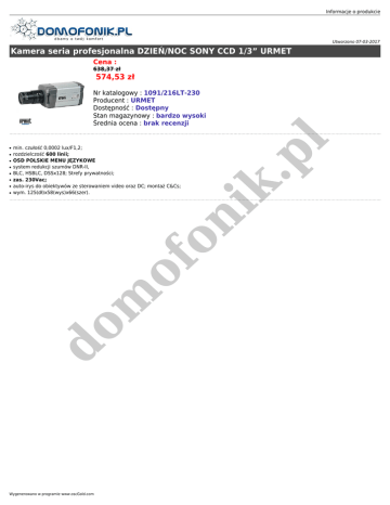 Informacje o produkcie Utworzono 07-03-2017 Kamera seria profesjonalna DZIEŃ/NOC SONY CCD 1/3” URMET Cena : 638,37 zł 574,53 zł ● ● ● ● ● ● do m of on ● min. czułość 0,0002 lux/F1,2; rozdzielczość 600 linii; OSD POLSKIE MENU JĘZYKOWE system redukcji szumów DNR-II, BLC, HSBLC, DSSx128; Strefy prywatności; zas. 230Vac; auto-irys do obiektywów ze sterowaniem video oraz DC; montaż C&Cs; wym. 125(dł)x58(wys)x66(szer). ik . ● pl Nr katalogowy : 1091/216LT-230 Producent : URMET Dostępność : Dostępny Stan magazynowy : bardzo wysoki Średnia ocena : brak recenzji Wygenerowano w programie www.oscGold.com