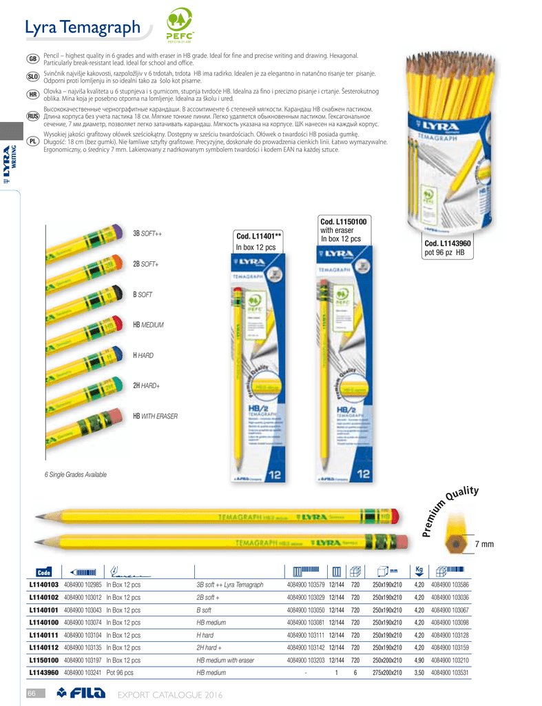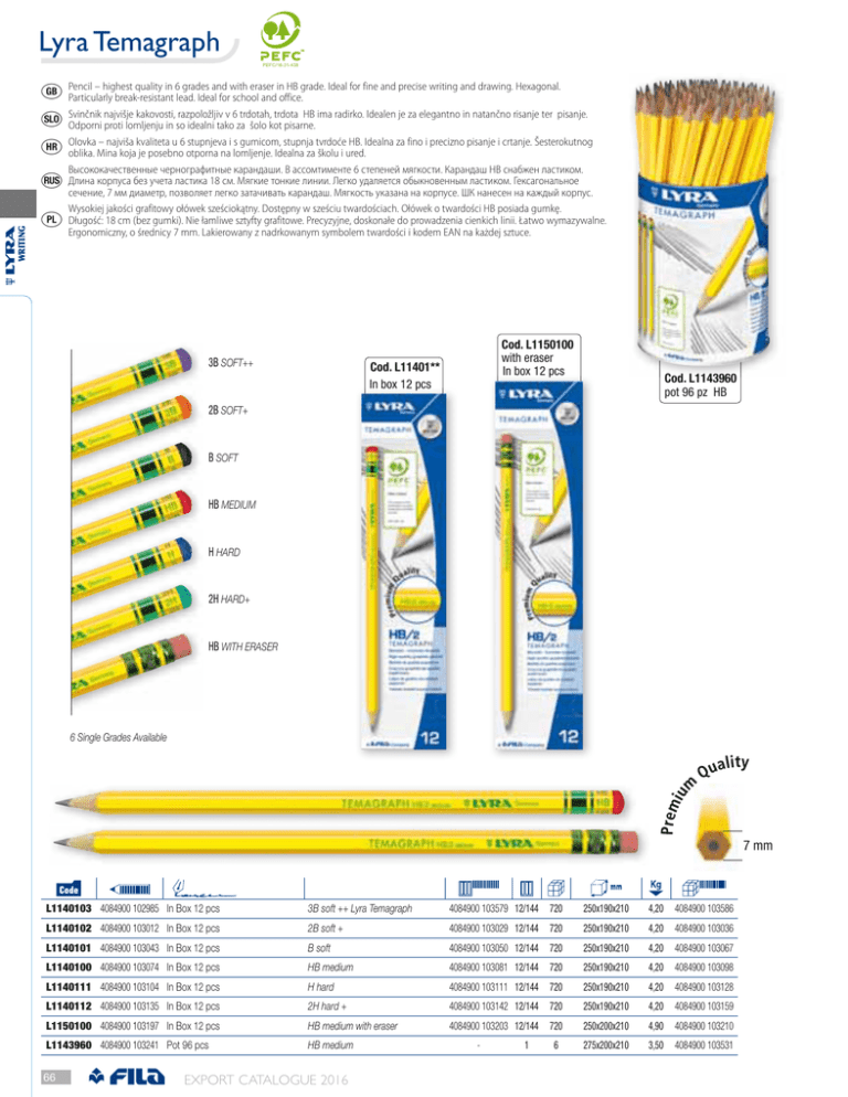 Lyra Temagraph 3()& – highest quality in 6 grades and with eraser in HB grade. Ideal for fine and precise writing and drawing. Hexagonal. a Pencil Particularly break-resistant lead. Ideal for school and office. Svinčnik najvišje kakovosti, razpoložljiv v 6 trdotah, trdota HB ima radirko. Idealen je za elegantno in natančno risanje ter pisanje. k Odporni proti lomljenju in so idealni tako za šolo kot pisarne. Olovka – najviša kvaliteta u 6 stupnjeva i s gumicom, stupnja tvrdoće HB. Idealna za fino i precizno pisanje i crtanje. Šesterokutnog t oblika. Mina koja je posebno otporna na lomljenje. Idealna za školu i ured. Высококачественные чернографитные карандаши. В ассомтименте 6 степеней мягкости. Карандаш HB снабжен ластиком. WRITING l Длина корпуса без учета ластика 18 см. Мягкие тонкие линии. Легко удаляется обыкновенным ластиком. Гексагональное d сечение, 7 мм диаметр, позволяет легко затачивать карандаш. Мягкость указана на корпусе. ШК нанесен на каждый корпус. Wysokiej jakości grafitowy ołówek sześciokątny. Dostępny w sześciu twardościach. Ołówek o twardości HB posiada gumkę. Długość: 18 cm (bez gumki). Nie łamliwe sztyfty grafitowe. Precyzyjne, doskonałe do prowadzenia cienkich linii. Łatwo wymazywalne. Ergonomiczny, o średnicy 7 mm. Lakierowany z nadrkowanym symbolem twardości i kodem EAN na każdej sztuce. 3B SOFT++ Cod. L1150100 with eraser In box 12 pcs Cod. L11401** In box 12 pcs Cod. L1143960 pot 96 pz HB 2B SOFT+ B SOFT HB MEDIUM H HARD 2H HARD+ HB WITH ERASER 6 Single Grades Available 7 mm L1140103 4084900 102985 In Box 12 pcs 3B soft ++ Lyra Temagraph 4084900 103579 12/144 720 250x190x210 4,20 4084900 103586 L1140102 4084900 103012 In Box 12 pcs 2B soft + 4084900 103029 12/144 720 250x190x210 4,20 4084900 103036 L1140101 4084900 103043 In Box 12 pcs B soft 4084900 103050 12/144 720 250x190x210 4,20 4084900 103067 L1140100 4084900 103074 In Box 12 pcs HB medium 4084900 103081 12/144 720 250x190x210 4,20 4084900 103098 L1140111 4084900 103104 In Box 12 pcs H hard 4084900 103111 12/144 720 250x190x210 4,20 4084900 103128 L1140112 4084900 103135 In Box 12 pcs 2H hard + 4084900 103142 12/144 720 250x190x210 4,20 4084900 103159 L1150100 4084900 103197 In Box 12 pcs HB medium with eraser 4084900 103203 12/144 720 250x200x210 4,90 4084900 103210 L1143960 4084900 103241 Pot 96 pcs HB medium 6 275x200x210 3,50 4084900 103531 66 EXPORT CATALOGUE 2016 - 1