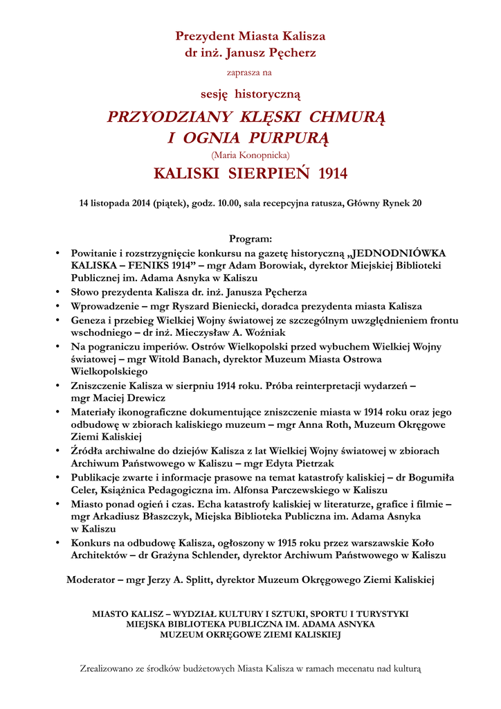 Prezydent Miasta Kalisza dr inż. Janusz Pęcherz zaprasza na sesję historyczną PRZYODZIANY KLĘSKI CHMURĄ I OGNIA PURPURĄ (Maria Konopnicka) KALISKI SIERPIEŃ 1914 14 listopada 2014 (piątek), godz. 10.00, sala recepcyjna ratusza, Główny Rynek 20 • • • • • • • • • • • Program: Powitanie i rozstrzygnięcie konkursu na gazetę historyczną „JEDNODNIÓWKA KALISKA – FENIKS 1914” – mgr Adam Borowiak, dyrektor Miejskiej Biblioteki Publicznej im. Adama Asnyka w Kaliszu Słowo prezydenta Kalisza dr. inż. Janusza Pęcherza Wprowadzenie – mgr Ryszard Bieniecki, doradca prezydenta miasta Kalisza Geneza i przebieg Wielkiej Wojny światowej ze szczególnym uwzględnieniem frontu wschodniego – dr inż. Mieczysław A. Woźniak Na pograniczu imperiów. Ostrów Wielkopolski przed wybuchem Wielkiej Wojny światowej – mgr Witold Banach, dyrektor Muzeum Miasta Ostrowa Wielkopolskiego Zniszczenie Kalisza w sierpniu 1914 roku. Próba reinterpretacji wydarzeń – mgr Maciej Drewicz Materiały ikonograficzne dokumentujące zniszczenie miasta w 1914 roku oraz jego odbudowę w zbiorach kaliskiego muzeum – mgr Anna Roth, Muzeum Okręgowe Ziemi Kaliskiej Źródła archiwalne do dziejów Kalisza z lat Wielkiej Wojny światowej w zbiorach Archiwum Państwowego w Kaliszu – mgr Edyta Pietrzak Publikacje zwarte i informacje prasowe na temat katastrofy kaliskiej – dr Bogumiła Celer, Książnica Pedagogiczna im. Alfonsa Parczewskiego w Kaliszu Miasto ponad ogień i czas. Echa katastrofy kaliskiej w literaturze, grafice i filmie – mgr Arkadiusz Błaszczyk, Miejska Biblioteka Publiczna im. Adama Asnyka w Kaliszu Konkurs na odbudowę Kalisza, ogłoszony w 1915 roku przez warszawskie Koło Architektów – dr Grażyna Schlender, dyrektor Archiwum Państwowego w Kaliszu Moderator – mgr Jerzy A. Splitt, dyrektor Muzeum Okręgowego Ziemi Kaliskiej MIASTO KALISZ – WYDZIAŁ KULTURY I SZTUKI, SPORTU I TURYSTYKI MIEJSKA BIBLIOTEKA PUBLICZNA IM. ADAMA ASNYKA MUZEUM OKRĘGOWE ZIEMI KALISKIEJ Zrealizowano ze środków budżetowych Miasta Kalisza w ramach mecenatu nad kulturą ZAPROSZENIE