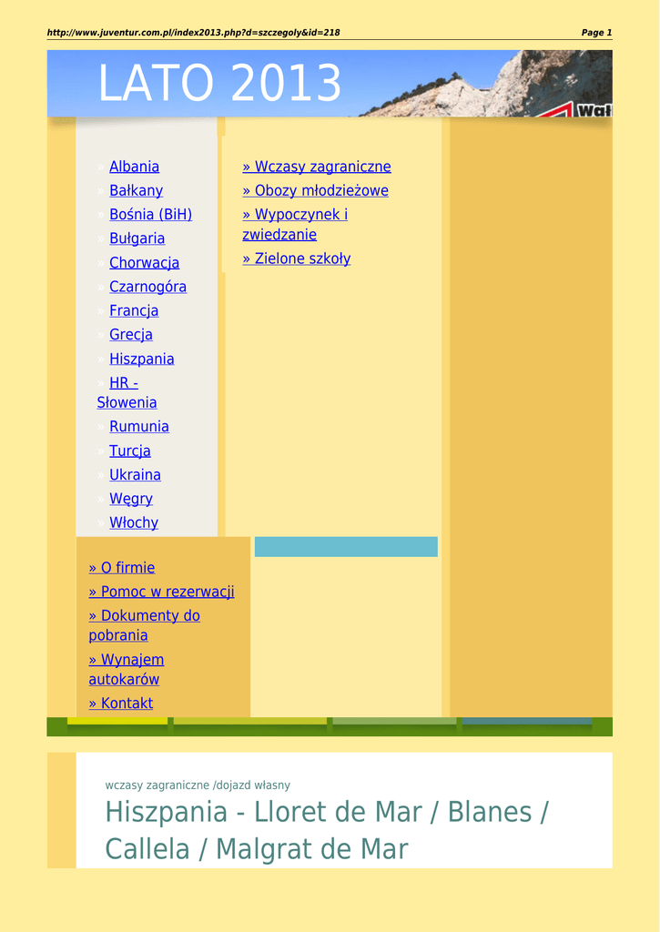 http://www.juventur.com.pl/index2013.php?d=szczegoly&id=218 LATO 2013 » Albania » Wczasy zagraniczne » Bałkany » Obozy młodzieżowe » Bośnia (BiH) » Bułgaria » Wypoczynek i zwiedzanie » Chorwacja » Zielone szkoły » Czarnogóra » Francja » Grecja » Hiszpania » HR Słowenia » Rumunia » Turcja » Ukraina » Węgry » Włochy » O firmie » Pomoc w rezerwacji » Dokumenty do pobrania » Wynajem autokarów » Kontakt wczasy zagraniczne /dojazd własny Hiszpania - Lloret de Mar / Blanes / Callela / Malgrat de Mar Page 1 http://www.juventur.com.pl/index2013.php?d=szczegoly&id=218 Costa Brava - Costa Maresme Najbardziej znany obszar wypoczynkowy w Hiszpanii, położony pomiędzy granicą francuską a Barceloną, piaszczyste plaże, czyste morze, tajemnicze skałki, doskonale przygotowane miejscowości na przybycie turystów. Świadczenia - 7 noclegów (pobyty tygodniowe sobota - sobota) - opieka polskiego pilota-rezydenta Zakwaterowanie - apartamenty na Costa Brava Apartamenty FORTUNA - Blanes/Lloret de Mar: Apartamenty 2/4 - sypialnia 2-osobowa, salon z rozkładaną dwuosobową sofą do spania, wnęka kuchenna, łazienka , balkon Apartamenty 4/6 - dwie sypialnie 2-osobowe, salon z rozkładaną dwuosobową sofą do spania, wnęka kuchenna, łazienka , balkon. Apartamenty QUINTASOL - Malgrat de Mar - 2/4, połozone bezpośrednio nad morzem, basen, sypialnia 2-osobowa, salon z rozkładana dwuosobową sofą do spania, anex kuchenny, łazienka, balkon Uwaga: należy zabrać ze sobą środki higieny i czystości. Transport - dojazd własny DOJAZD WŁASNY - klient ubezpieczony jest od KL - do 10.000 Euro i NW - do 7.000 PLN na czas wykupionego pobytu plus dwa dni przed rozpoczęciem i dwa dni po zakończeniu imprezy dodatkowa zapłata - 40 zł/os./turnus. Page 2 http://www.juventur.com.pl/index2013.php?d=szczegoly&id=218 Page 3 Wycieczki fakultatywne Na życzenie i koszt klienta, organizowane w trakcie pobytu: - wycieczka do Barcelony z Camp Nou (ok. 50 Euro) - bez - ok. 40 Euro - wycieczka do Montserrat (ok. 44 Euro) - Flamenco Show (34-44 Euro) - Water World (ok. 27 Euro) - Marineland (ok. 25 Euro) - rejs statkiem ze zwiedzaniem Lloret de Mar i Tossy de Mar (ok. 21 Euro) nr grupy termin MALGRAT, QUINTASOL 2/4 H-01/13 27.04-04.05.13 690,- ZAREZERWUJ H-02/13 04.05-11.05.13 690,- ZAREZERWUJ H-03/13 11.05-18.05.13 690,- ZAREZERWUJ H-04/13 18.05-25.05.13 690,- ZAREZERWUJ H-05/13 25.05-01.06.13 950,- ZAREZERWUJ H-06/13 01.06-08.06.13 950,- ZAREZERWUJ H-07/13 08.06-15.06.13 950,- ZAREZERWUJ H-08/13 15.06-22.06.13 1 150,- ZAREZERWUJ H-09/13 22.06-29.06.13 2 190,- ZAREZERWUJ H-10/13 29.06-06.07.13 2 190,- ZAREZERWUJ H-11/13 06.07-13.07.13 2 190,- ZAREZERWUJ H-12/13 13.07-20.07.13 2 850,- ZAREZERWUJ H-13/13 20.07-27.07.13 2 850,- ZAREZERWUJ H-14/13 27.07-03.08.13 3 290,- ZAREZERWUJ H-15/13 03.08-10.08.13 3 290,- ZAREZERWUJ H-16/13 10.08-17.08.13 3 290,- ZAREZERWUJ H-17/13 17.08-24.08.13 2 390,- ZAREZERWUJ H-18/13 24.08-31.08.13 1 490,- ZAREZERWUJ H-19/13 31.08-07.09.13 1 490,- ZAREZERWUJ H-20/13 07.09-14.09.13 990,- ZAREZERWUJ H-21/13 14.09-21.09.13 990,- ZAREZERWUJ H-22/13 21.09-28.09.13 990,- ZAREZERWUJ UWAGA: Opłata katalońska - 0,50 Euro/dzień - dopłata na miejscu w hotelu. © Juventur Sp. z o.o. 2013