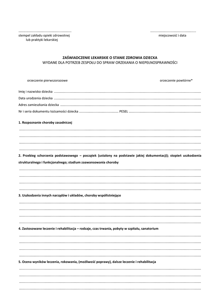 …………............................................... stempel zakładu opieki zdrowotnej lub praktyki lekarskiej .................................................. miejscowość i data ZAŚWIADCZENIE LEKARSKIE O STANIE ZDROWIA DZIECKA WYDANE DLA POTRZEB ZESPOŁU DO SPRAW ORZEKANIA O NIEPEŁNOSPRAWNOŚCI orzeczenie pierwszorazowe orzeczenie powtórne* Imię i nazwisko dziecka ................................................................................................................................................................. Data urodzenia dziecka ................................................................................................................................................................. Adres zamieszkania dziecka .......................................................................................................................................................... Nr i seria dokumentu tożsamości dziecka ........................................... PESEL ............................................................................... 1. Rozpoznanie choroby zasadniczej ....................................................................................................................................................................................................... ....................................................................................................................................................................................................... ....................................................................................................................................................................................................... ....................................................................................................................................................................................................... 2. Przebieg schorzenia podstawowego – początek (ustalony na podstawie jakiej dokumentacji); stopień uszkodzenia strukturalnego i funkcjonalnego; stadium zaawansowania choroby ....................................................................................................................................................................................................... ....................................................................................................................................................................................................... ....................................................................................................................................................................................................... ....................................................................................................................................................................................................... 3. Uszkodzenia innych narządów i układów, choroby współistniejące ....................................................................................................................................................................................................... ....................................................................................................................................................................................................... ....................................................................................................................................................................................................... ....................................................................................................................................................................................................... 4. Zastosowane leczenie i rehabilitacja – rodzaje, czas trwania, pobyty w szpitalu, sanatorium ....................................................................................................................................................................................................... ....................................................................................................................................................................................................... ....................................................................................................................................................................................................... ....................................................................................................................................................................................................... 5. Ocena wyników leczenia, rokowania, (możliwość poprawy), dalsze leczenie i rehabilitacja ....................................................................................................................................................................................................... ....................................................................................................................................................................................................... ....................................................................................................................................................................................................... ....................................................................................................................................................................................................... 6. Używane zaopatrzenie ortopedyczne i sprzęt rehabilitacyjny; ewentualne potrzeby w tym zakresie ....................................................................................................................................................................................................... ........................................................................................................................................