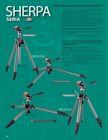 SHERPA SERIA Wielofunkcyjny statyw z wieloma funkcjami W Seria Sherpa została sklasyfikowana pod względem 3 aspektów, w zależności od czasu ich wprowadzenia. Podstawowe modele są dla fotografów amatorów, którzy zaczynają swoją przygodę z lustrzankami. Możemy zapytać, czy używasz niskiej pozycji statywu do robienia zdjęć, albo jaka musi być wysokość, jakie są kluczowe aspekty, brane przez Ciebie podczas wyboru statywu. 3-sekcje mają normalną długość po złożeniu, natomiast 4-sekcyjne statywy są o wiele bardziej kompaktowe po złożeniu. Modele podstawowe Sherpa SHERPA 250R, 450R, 600R, 750R tradycyjna Sherpa Druga generacja statywów Sherpa wyposażona jest w głowicę kulową lub olejową. Jeden z nich ma mniejszą średnicę nóg, co czyni go lekkim i małym. Sherpa 200R, 800R (dźwignia), 555R, 603R, 803R (głowica kulowa), 538 (głowica olejowa), 435 (compact slim), 550R ( dźwignia oraz niski kąt) niska pozycja statywu Sherpa 600R 803R posiada mocowanie w kolumnie centralnej 603R ma głowicę kulową z pozycją o niskim kącie 555R posiada 4-sekcyjne nogi, z małą głowicą oraz pozycje niskiego kąta 538 posiada 2-kierunkową głowicę olejową, prowadnicę połączoną z nogami. Idealny dla miłośników ptaków 435 jest smukły i polecany dla niskiego kąta fotografowania, lekki, posiada 2 uchwyty przy głowicy 550R posiada ukierunkowaną dźwignię i niską pozycję, 3-sekcje nóg tradycyjna Sherpa niska pozycja statywu Sherpa 750R 11 6(5,$6+(53$ tradycyjna Sherpa tradycyjna Sherpa Nowa Linia Sherpa Sherpa 450R Sherpa 250R Sherpa 200R Nowa Linia Sherpa niska pozycja statywu Sherpa 550R OPTYMALNE OBCIĄŻENIE cm cm cm kg mm kg ZAPASOWA SZYBKOZŁĄCZKA Sherpa 200R E AN 4907990 200877 UPC 017915412002 167.5 59 62 1.95 26 3 3.5 QB-157 Sherpa 250R E AN 4907990 206503 162 59 62.5 2.0 26 3 4 QB-157 Sherpa 450R E AN 4907990 206527 173 64.5 67.5 2.25 26 3 4 QB-157 Sherpa 550R E AN 4907990 200938 155 27.5 63 2.12 26 3 4 QB-157 Sherpa 600R E AN 4907990 206541 UPC 017915416000 E AN 4907990 206565 UPC 017915417502 170 29 63 2.0 26 3 4 QB-157 31.5 55 2.2 26 4 4 QB-157 Sherpa 750R 155 UWAGI OPTYMALNE OBCIĄŻENIE Velbon sugeruje optymalne obciążenie sprzętu, które jest bezpieczne poniżej maksymalnego obciążenia. 12 TYLKO GŁOWICA magnezowa Nowa linia Sherpa SERIA aluminiowa Nowa linia Sherpa Sherpa 803R photo by f. hobo Zacisk HC-25/28 Nowa linia Sherpa Sherpa 800R zastosowany do niezależnego użytku wraz z kolumną centralną PATRZ S.26 niska pozycja statywu Sherpa 603R NOWOŚĆ Wyspecjalizowany projekt niska pozycja statywu Sherpa 555R NOWOŚĆ 13 6(5,$6+(53$ LEGENDARNY VELBON Mark-7B Wyspecjalizowany projekt Specific Designs Specific Designs Wyspecjalizowany projekt Mark-7B ● 3-kierunkowa głowica PH-270B, z możliwością ustawienia 2 pozycji w szybkozłączce ● konstrukcja kolumny centralnej zapobiega schowaniu się, w przypadku gdy nie jest do końca zablokowana ● trzy ustawienia kątów nóg ● zamknięcie oparte na 3 ślizgaczach ● niska pozycja ● 3 sekcje nóg, zakończone kolcem lub gumowe ● Maksymalne obciążenie 7kg ● Opcjonalny futerał 840L Sherpa 538 Sherpa 435 Wyspecjalizowany projekt Specific Designs magnezowa P Począwszy od d 2010 roku, k wprowadzamy prowadzamy sserię Sherpa plus aby sklasyfikować wysokość i jakość Średnica nóg jest większa niż w obecnej serii Sherpa i posiada większą wytrzymałość korpusu statywu, który jest wykonany z magnezu. Ze względu na to, możemy dostarczyć bardzo mocny statyw, o lekkiej konstrukcji w najwyższej klasie statywów aluminiowych. Sherpa plus jest niczym innym jak pomostem pomiędzy serią Geo i Sherpa. NOWOŚĆ Sherpa+ 530 Specific Designs Wyspecjalizowany projekt Sherpa+ 630 NOWOŚĆ OPTYMALNE OBCIĄŻENIE cm cm cm kg mm kg ZAPASOWA SZYBKOZŁĄCZKA Sherpa 435 E AN 4907990 404442 161 23.8 58 1.49 23 3 3 QB-145 Sherpa 538 E AN 4907990 404503 UPC 017915415386 E AN 4907990 433602 UPC 017915415553 E AN 4907990 210661 UPC 017915416000 159.5 59 64.5 2.14 26 3 4 QB-F51 147 16.8 53.5 1.22 23 4 3 QB-3B 170 29 63 2.00 26 3 2.5 QB-157 Sherpa 800R E AN 4907990 204585 169.5 60 62.5 1.95 26 3 4 QB-157 Sherpa 803R E AN 4907990 245106 169 58.5 61.5 1.96 26 3 4 QB-635L Mark-7B SET E AN 4907990 111944 179.7 59.7 81.7 5.15 32 3 7 E AN 4907990 433909 UPC 017915419537 E AN 4907990 433862 UPC 017915519636 152.5 16 53 1.37 26 3 3.5 163 12 56 1.67 29 3 4 Sherpa 555R NOWOŚĆ Sherpa 603R NOWOŚĆ Sherpa+ 530 NOWOŚĆ Sherpa+ 630 NOWOŚĆ UWAGI OPTYMALNE OBCIĄŻENIE rekomendowane głowice PH-275, PH-270B, QHD-71Q rekomendowane głowice PHD-(51Q),52Q,54Q,QHD-61Q,62Q,FHD-51Q rekomendowane głowice PHD-(61Q),62Q,64Q,QHD-61Q,62Q,FHD-61Q Velbon sugeruje optymalne obciążenie sprzętu, które jest bezpieczne poniżej maksymalnego obciążenia. 14