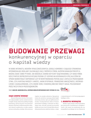 kapitał wiedzy w przedsiębiorstwie >> Akademia Produkcji Budowanie przewagi konkurencyjnej w oparciu o kapitał wiedzy W dobie internetu, mediów społecznościowych, Google AdWords i ciągłego strumienia intermedialnej reklamy zalewającej nas z różnych stron, każdym kanałem percepcji, można zadać sobie pytanie: jak oddzielić ziarno od plew? Skąd wiadomo, czy dana firma rzeczywiście reprezentuje wysoki poziom czy jedynie ma wspaniałych specjalistów do spraw marketingu? Odpowiedź leży w weryfikowaniu potencjału i zaplecza przedsiębiorstwa, czyli kapitału wiedzy i jakości, jakim dysponuje. Prawdziwe umiejętności, doświadczenie i zaangażowanie, czyli know-how, stanowią obecnie święty Graal poszukiwany przez wszystkich przedsiębiorców. TEKST: mgr inż. Agnieszka Hyla, Centrum Szkoleń Inżynierskich EMT-Systems Sp. z o.o. Skąd czerpać wiedzę? Jeszcze kilkanaście lat temu na to pytanie odpowiadało się bez zastanowienia: z książek. Dzisiaj, kiedy ktoś publikuje książkę branżową, zazwyczaj jest ona pewnym zbiorem informacji, podsumowaniem dokonań różnych naukowców, co tylko czasami oznacza aktualną wiedzę, która jeszcze nigdzie nie została wdrożona. Najczęściej mamy do czynienia z sytuacją, kiedy książki stanowią swoisty opis już aplikowanych struktur i funkcjonalności, które w firmach pionierskich działają z sukcesem od dłuższego czasu. Jak więc wysunąć się na przód kolejki po know-how? Istnieje kilka różnych dróg pozyskiwania rzetelnej wiedzy, z czego z najważniejszych z nich korzystają giganci każdego rynku. 1. Rekrutuj wewnątrz Bardzo często, kiedy w firmie potrzebny jest pracownik o konkretnych umiejętnościach, nikt nawet nie zastanawia się, czy przypadkiem już takiego nie ma. Dotyczy to listopad-grudzień 2015 Służby Utrzymania Ruchu 33 AKADEMIA PRODUKCJI >> kapitał wiedzy w przedsiębiorstwie O eksperta niełatwo. Ponieważ ekspert to nie osoba, która zwie się ekspertem, bądź na takiego kreowana, lecz taka, która posiada bagaż różnorodnych doświadczeń, szeroką wiedzę o świecie i dogłębną w danej dziedzinie. z pewnością firm średnich i dużych, jednak okazuje się, że nawet firmy małe, zatrudniające kilkunastu pracowników pozwalają sobie na ignorowanie ich kompetencji. Wynika to z faktu, że po zatrudnieniu pracownika na konkretne stanowisko zazwyczaj nie przykładamy zbyt dużej wagi do jego dodatkowych umiejętności, które po pewnym czasie mogą okazać się przydatne. Dlatego też ważnym zwyczajem powinna się stać okresowa rotacja pracowników, np. dzień wymiany, kiedy to przedstawiciele poszczególnych działów zamienią się obowiązkami na 8 godzin. Poskutkuje to z pewnością lepszym zrozumieniem wewnątrz zespołu, lecz może się także okazać, że w którymś zespole kryje się diament, którego akurat potrzebujemy gdzie indziej. Konieczne jest także analizowanie CV już zatrudnionych pracowników przed rozpoczęciem rekrutacji na nowe stanowisko. Pozwoli to nie tylko na oszczędzenie czasu i pieniędzy, lecz także na budowanie morale zespołu, którego członkowie poczują się docenieni za różnorodne cechy i umiejętności, które posiadają. 2. Zasięgaj opinii ekspertów O eksperta niełatwo. Ponieważ ekspert to nie osoba, która zwie się ekspertem, bądź na takiego kreowana, lecz taka, która posiada bagaż różnorodnych doświadczeń, szeroką wiedzę o świecie i dogłębną w danej dziedzinie. Szczególnie w produkcji i utrzymaniu ruchu o ekspertów jest 34 niezwykle trudno. Zazwyczaj działają oni w charakterze wolnych strzelców, zakładają jednoosobowe przedsiębiorstwa i jeżdżą pomiędzy różnymi zakładami, świadcząc różnorodne usługi, np. w zakresie napraw serwonapędów, wdrożeń systemów PCS, instalacji oprogramowania, napraw układów pneumatycznych, programowania sterowników czy wdrażania metodologii Lean Manufacturing. Żadne z tych zadań nie jest łatwe i żadnego nie da się wykonać bez uprzedniego przygotowania. Zanim więc zasięgniemy rady eksperta, należy sprawdzić jego referencje – zadzwonić do poprzednich klientów, przeczytać opinie w internecie, zapoznać się dokładnie z zakresem usług i treścią ewentualnej umowy. Wybór osoby, na której będziemy przez pewien czas polegać, należy do najtrudniejszych zadań menedżera. Niejeden życiorys zawiera bowiem obecnie doświadczenia widmo czy sfabrykowane miejsca pracy. Wynika to z mocno konkurencyjnego rynku pracy i chęci wybicia się. Nie tędy jednak droga i choć alternatywne drogi nauki pozwalają na osiągnięcie wysokiego poziomu kompetencji w swojej dziedzinie w młodym wieku, niczym nie da się zastąpić przepracowanych przy maszynie godzin czy czasu spędzonego w środowisku programowania. 3. Uczelnie wyższe Choć uczelnie wyższe zbierają obecnie coraz więcej negatywnych komentarzy w związku z pewnym impasem Służby Utrzymania Ruchu listopad-grudzień 2015 technologicznym, który rozpoczął rządy w tym specyficznym środowisku, wciąż stanowią one istne kopalnie wiedzy i doświadczenia. Nie każda branża bowiem wymaga wykorzystania nieprawdopodobnych innowacji, a i o takie na uczelniach, szczególnie technicznych, nietrudno. Jeśli więc szukamy pomocy przy opracowaniu metody produkcji, technologii wytwarzania, optymalizacji procesu, czy osoby, która zjadła zęby na danej dziedzinie – warto poszukać w środowisku akademickim. W naszym kraju jest kilka płodnych ośrodków naukowych w większych i mniejszych miastach. Można pokusić się o stwierdzenie, że uczelnia stanowi wartość dodaną dla miasta. Poprawia poziom wiedzy mieszkańców, zwiększa szanse zatrudnienia, wpływa na powiększenie liczby start-upów i dużych firm w okolicy. Bardzo dobrym przykładem jest Politechnika Śląska, dzięki której Gliwice, w którym to mieście ma swą główną siedzibę, rozwinęły się niezwykle w ciągu ostatnich kilkudziesięc