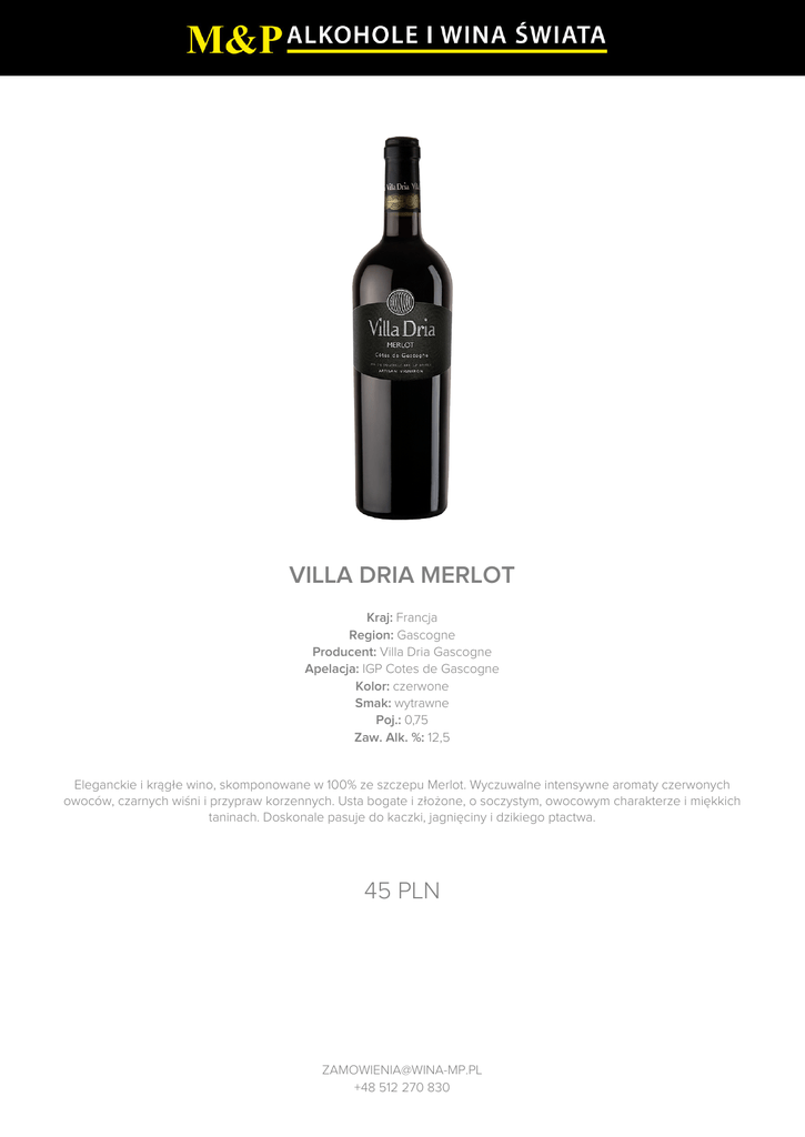 VILLA DRIA MERLOT Kraj: Francja Region: Gascogne Producent: Villa Dria Gascogne Apelacja: IGP Cotes de Gascogne Kolor: czerwone Smak: wytrawne Poj.: 0,75 Zaw. Alk. %: 12,5 Eleganckie i krągłe wino, skomponowane w 100% ze szczepu Merlot. Wyczuwalne intensywne aromaty czerwonych owoców, czarnych wiśni i przypraw korzennych. Usta bogate i złożone, o soczystym, owocowym charakterze i miękkich taninach. Doskonale pasuje do kaczki, jagnięciny i dzikiego ptactwa. 45 PLN [email protected] +48 512 270 830