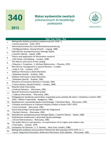 340 Wykaz wydawnictw zwartych przeznaczonych do bezpłatnego przekazania 2013 1. 2. 3. 4. 5. 6. 7. 8. 9. 10. 11. 12. 13. 14. 15. 16. 17. 18. 19. 20. Tytuł. Tom / Autor - Rok Bibliografia łódzkiej produkcji wydawniczej (do 1918 r.). / Janina Jaworska. ‐ Łódź, 1975. Informationsrecherche und Informationsverbreitung. / Wolfgang Hübner, Georg Schmoll. ‐ Leipzig, 1980. Kalendarium powojennej prasy Dolnego Śląska. / Joachim Glensk. ‐ Opole, 1980. Theory and application of information research. / Ole Harbo, Leif Kajberg. ‐ London, 1980. The Nature and future of the catalog. / Maurice J. Freedman, S. Michael Malinconico. ‐ Phoenix, 1979. Microforms management in special libraries : a reader. / Judy H. Fair. ‐ London, 1979. Selekcja informacji w dziennikarstwie. / Bolesław Garlicki. ‐ Kraków, 1981. Selekcja informacji w dziennikarstwie. / Bolesław Garlicki. ‐ Kraków, 1981. Directory of economic libraries in Canada, 1981. / Irene Lackner, Gerald Prodrick. ‐ London, 1980. Słownik sztuki francuskiej. / Andrzej Dulewicz. ‐ Warszawa, 1981. Słownik techniczny hiszpańsko‐polski. / Tadeusz Weroniecki. ‐ Warszawa, 1981. Pedagogiczne tendencje pomorskiej i kujawskiej prasy polskiej dla dzieci i młodzieży w latach 1891‐ 1920. / Wiktor Frąckowiak. ‐ Bydgoszcz, 1981. Repetytorium z gramatyki języka niemieckiego. / Stanisław Bęza. ‐ Warszawa, 1981. Z dziejów wychowania w Ludowym Wojsku Polskim w latach 1957‐1970. / Jerzy Cytowski. ‐ Warszawa, 1981. Deutschsprachige Literaturgeschichte der Gegenwart. / Norbert Honsza. ‐ Warszawa, 1981. Kalendarium powojennej prasy Dolnego Śląska. / Joachim Glensk. ‐ Opole, 1980. Podstawowe wiadomości z gramatyki języka polskiego. / Zenon Klemensiewicz.‐ Warszawa, 1981. The public library in perspective : an examination of its origins and modern role. / Paul Sykes. ‐ London, 1979. Computers for libraries. / J. E. Rowley. ‐ New York; London, 1980. Bibliografia publikacji pracowników Politechniki Warszawskiej 1975‐1978. Cz. 1. / oprac. Bogumiła Kutszyńska, Waleriana Płomińska, Zofia Sybilska. ‐ Warszawa, 1981.