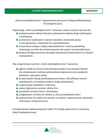 XI DZIEŃ PRZEDSIĘBIORCZOŚCI 2013/2014 „Dzień przedsiębiorczości" organizowany jest przez Fundację Młodzieżowej Przedsiębiorczości. Organizując „Dzień przedsiębiorczości" stwarzasz swoim uczniom warunki do: podejmowania trafnych decyzji w planowaniu dalszej drogi edukacyjnej i zawodowej, porównania wyobrażeń o danym zawodzie, stanowisku pracy z rzeczywistością i możliwości ich zweryfikowania, zrozumienia związku między wykształceniem i karierą zawodową, motywując uczniów do zainteresowania się nauką i samokształceniem, bezpośredniego poznania wymagań stawianych pracownikom na różnych stanowiskach. Aby zorganizować uczniom „Dzień przedsiębiorczości" wystarczy: zgłosić szkołę na stronie internetowej projektu oraz przesłać faksem lub zeskanowane mailowo potwierdzenie zgłoszenia wraz podpisem dyrektora i pieczęcią szkoły, przeprowadzić lekcję wychowawczą na temat „Weryfikacja marzeń zawodowych w kontekście wyboru drogi edukacyjnej", zorganizować spotkanie z rodzicami, zebrać zgłoszenia uczniów i oferty firm, przydzielić uczniom firmy i stanowiska, przygotować uczniów do udziału w „Dniu przedsiębiorczości", podsumować ich udział oraz pomóc w analizie i wykorzystaniu zebranych informacji o miejscach pracy. Przedstawiciele najaktywniejszych szkół i firm będą zaproszeni na uroczystą Galę Przedsiębiorczości. Copyright by Fundacja Młodzieżowej Przedsiębiorczości