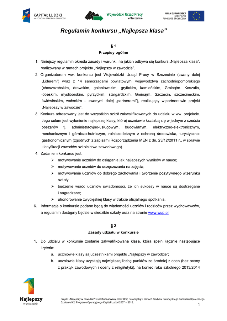 Regulamin konkursu „Najlepsza klasa” §1 Przepisy ogólne 1. Niniejszy regulamin określa zasady i warunki, na jakich odbywa się konkurs „Najlepsza klasa”, realizowany w ramach projektu „Najlepszy w zawodzie”. 2. Organizatorem ww. konkursu jest Wojewódzki Urząd Pracy w Szczecinie (zwany dalej „Liderem”) wraz z 14 samorządami powiatowymi województwa zachodniopomorskiego (choszczeńskim, drawskim, goleniowskim, gryfickim, kamieńskim, Gminą/m. Koszalin, łobeskim, myśliborskim, pyrzyckim, stargardzkim, Gminą/m. Szczecin, szczecineckim, świdwińskim, wałeckim – zwanymi dalej „partnerami”), realizujący w partnerstwie projekt „Najlepszy w zawodzie”. 3. Konkurs adresowany jest do wszystkich szkół zakwalifikowanych do udziału w ww. projekcie. Jego celem jest wyłonienie najlepszej klasy, której uczniowie kształcą się w jednym z sześciu obszarów tj. administracyjno-usługowym, budowlanym, elektryczno-elektronicznym, mechanicznym i górniczo-hutniczym, rolniczo-leśnym z ochroną środowiska, turystycznogastronomicznym (zgodnych z zapisami Rozporządzenia MEN z dn. 23/12/2011 r., w sprawie klasyfikacji zawodów szkolnictwa zawodowego). 4. Zadaniem konkursu jest: motywowanie uczniów do osiągania jak najlepszych wyników w nauce; motywowanie uczniów do uczęszczania na zajęcia; motywowanie uczniów do dobrego zachowania i tworzenie pozytywnego wizerunku szkoły; budzenie wśród uczniów świadomości, Ŝe ich sukcesy w nauce są dostrzegane i nagradzane; uhonorowanie zwycięskiej klasy w trakcie oficjalnego spotkania. 6. Informacje o konkursie podane będą do wiadomości uczniów i rodziców przez wychowawców, a regulamin dostępny będzie w siedzibie szkoły oraz na stronie www.wup.pl. §2 Zasady udziału w konkursie 1. Do udziału w konkursie zostanie zakwalifikowana klasa, która spełni łącznie następujące kryteria: a. uczniowie klasy są uczestnikami projektu „Najlepszy w zawodzie”; b. uczniowie klasy uzyskają największą liczbę punktów ze średniej z ocen (bez oceny z praktyk zawodowych i oceny z religii/etyki), na koniec roku szkolnego 2013/2014 1 wśród wszystkich klas biorących udział w projekcie - gdzie maksymalna liczba punktów dla średniej ocen wynosi 60 pkt. i liczona jest wg poniŜszego wzoru: średnia ocen uczniów klasy (bez oceny z praktyk zawodowych i oceny z religii/etyki) 6,00 (najwyŜsza moŜliwa do osiągnięcia średnia ocen uczniów klasy) c. X 60 pkt. = …. uczniowie klasy uzyskają największą liczbę punktów z frekwencji na zajęciach lekcyjnych w roku szkolnym 2013/2014 wśród wszystkich klas biorących udział w projekcie - gdzie maksymalna liczba punktów dla frekwencji na zajęciach lekcyjnych wynosi 40 pkt. i liczona jest wg poniŜszego wzoru: % frekwencja uczniów klasy na zajęciach 100% (najwyŜsza moŜliwa do osiągnięcia frekwencja uczniów klasy na zajęciach) X 40 pkt. = …. 2. KaŜdy z partnerów projektu sporządzi i przekaŜe Liderowi, we wskazanym przez niego terminie i przygotowaną według określonego wzoru (stanowiącego Załącznik nr 1 do niniejszego dokumentu), informację o jednej klasie, która uzyskała łącznie największą liczbę punktów liczoną z ww. kryteriów. 3. W przypadku, gdy dwie klasy, biorące udział w konkursie, osiągną taką samą sumę punktów, liczoną ze średniej ocen (bez oceny z praktyk zawodowych i oceny z religii/etyki) i frekwencji na zajęciach lekcyjnych, zastosowane zostanie dodatkowe kryterium, tj. średnia ocen uczniów klasy z zachowania, liczona wg poniŜszego przykładu: (5 uczniów z zach. wzorowym x 15 pkt.) + (3 uczniów z zach. dobrym x 5 pkt.) liczba uczniów klasy ogółem 8 = 75+15 8 = 90 = 11,25 pkt 8 4. Wysokość wag punktowych dla „ocen uczniów klasy z zachowania” jest następująca: a. zachowanie wzorowe – 15 pkt. b. zachowanie bardzo dobre – 10 pkt. c. zachowanie dobre – 5 pkt. d. zachowanie poprawne – 3 pkt. e. zachowanie nieodpowiednie – 1 pkt. f. zachowanie naganne – 0 pkt. 5. W sytuacji, gdy zastosowanie dodatkowego kryterium nie pozwoli na jednoznaczne wskazanie zwycięskiej klasy na liście rankingowej, decyzję w tej sprawie podejmie Komisja konkursowa. 6. Laureatem konkursu zostanie ta klasa, która otrzyma najwyŜszą liczbę punktów, liczoną łącznie z ww. kryteriów. 2 7. Uczestnictwo w konkursie jest jednoznaczne z wyraŜeniem zgody na przetwarzanie danych osobowych, niezbędnych do przeprowadzenia konkursu i wydania nagrody, zgodnie z Ustawą z dnia 29.08.1997 r. o Ochronie Danych Osobowych (Dz. U. z 2002 r. nr 101 poz. 926 z późniejszymi zmianami). §3 Komisja konkursowa 1. W celu wyłonienia Laureata konkursu zostanie powołana Komisja konkursowa. 2. W skład Komisji konkursowej wejdą: 3. Wicedyrektor WUP w Szczecinie – Przewodniczący Komisji; 14 członków, reprezentujących kaŜdego z Partnerów – Członkowie Komisji; pracownik zespołu ds. projektu „Najlepszy w zawodzie” – Sekretarz Komisji. Zadaniem Komisji konkursowej będzie wyłonienie, w terminie wyznaczonym przez Lidera projektu, zwycięskiej klasy - Laureata konkursu „Najlepsza klasa”. 4. Komisja konkursowa sporządzi listę rankingową zwycięskiej klasy - Laureata konkursu „Najlepsza klasa” na podstawie list, o których mowa w §2, ust.2 regulaminu. §4 Przebieg konkursu 1. Prace Komisji odbywać się będą w siedzibie Wojewódzkiego Urzędu Pracy w Szczecinie. 2. Lista rankingowa zgłoszonych klas, uszeregowana zostanie przez Komisję konkursową, według liczby otrzymanych punktów od najwyŜszej do najniŜszej. 3. Z prac Komisji konkursowej zostanie sporządzony przez Sekretarza Komisji protokół. 4. Posiedzenie Komisji uznaje się za zakończone w momencie zatwierdzenia przez Przewodniczącego Komisji, protokołu z prac Komisji. 5. Decyzja Komisji w sprawie wyboru zwycięskiej klasy - Laureata konkursu „Najlepsza klasa” jest ostateczna i nie przysługuje od niej odwołanie. 6. Wszelkie kwestie