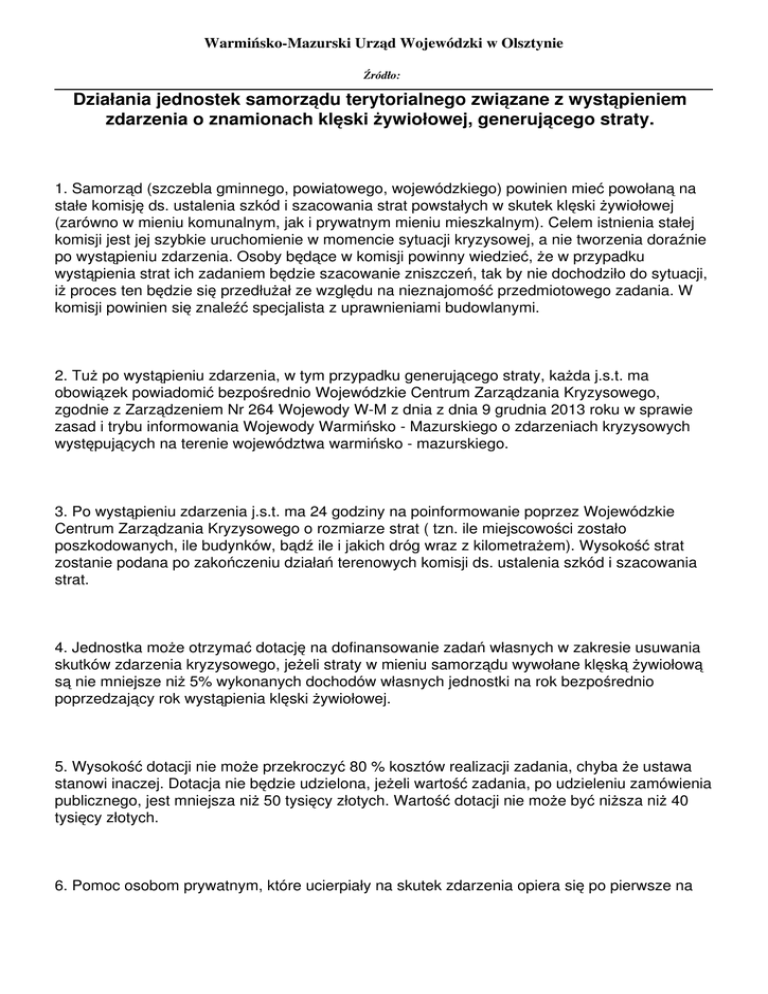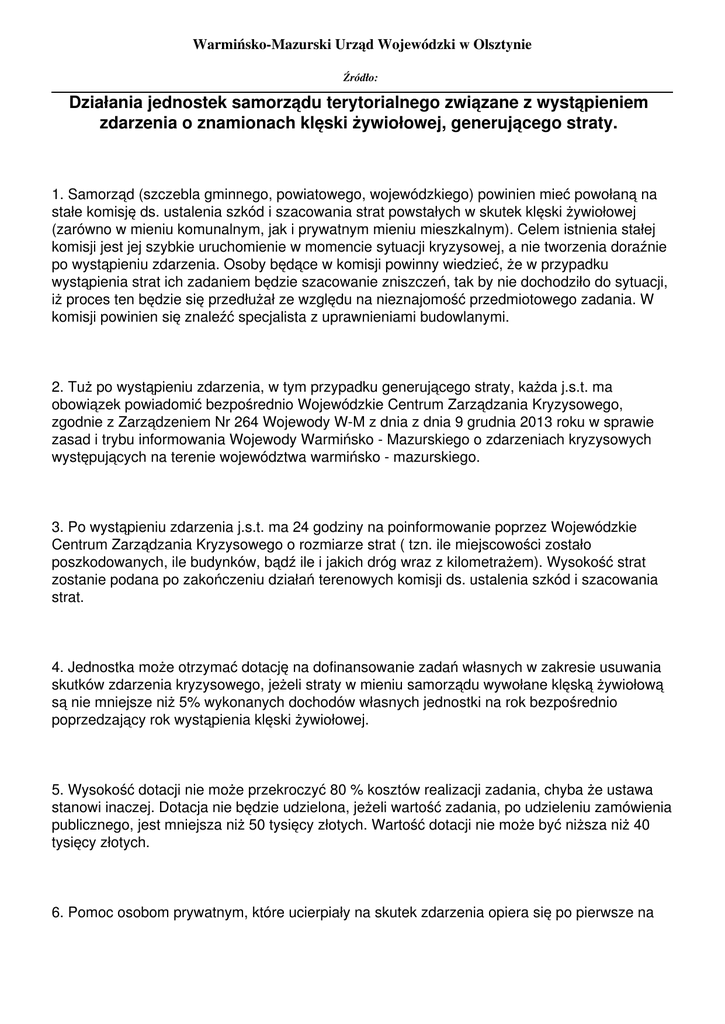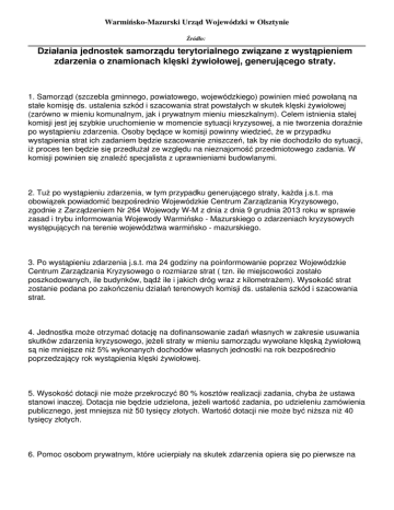 Warmińsko-Mazurski Urząd Wojewódzki w Olsztynie Źródło: Działania jednostek samorządu terytorialnego związane z wystąpieniem zdarzenia o znamionach klęski żywiołowej, generującego straty. 1. Samorząd (szczebla gminnego, powiatowego, wojewódzkiego) powinien mieć powołaną na stałe komisję ds. ustalenia szkód i szacowania strat powstałych w skutek klęski żywiołowej (zarówno w mieniu komunalnym, jak i prywatnym mieniu mieszkalnym). Celem istnienia stałej komisji jest jej szybkie uruchomienie w momencie sytuacji kryzysowej, a nie tworzenia doraźnie po wystąpieniu zdarzenia. Osoby będące w komisji powinny wiedzieć, że w przypadku wystąpienia strat ich zadaniem będzie szacowanie zniszczeń, tak by nie dochodziło do sytuacji, iż proces ten będzie się przedłużał ze względu na nieznajomość przedmiotowego zadania. W komisji powinien się znaleźć specjalista z uprawnieniami budowlanymi. 2. Tuż po wystąpieniu zdarzenia, w tym przypadku generującego straty, każda j.s.t. ma obowiązek powiadomić bezpośrednio Wojewódzkie Centrum Zarządzania Kryzysowego, zgodnie z Zarządzeniem Nr 264 Wojewody W-M z dnia z dnia 9 grudnia 2013 roku w sprawie zasad i trybu informowania Wojewody Warmińsko - Mazurskiego o zdarzeniach kryzysowych występujących na terenie województwa warmińsko - mazurskiego. 3. Po wystąpieniu zdarzenia j.s.t. ma 24 godziny na poinformowanie poprzez Wojewódzkie Centrum Zarządzania Kryzysowego o rozmiarze strat ( tzn. ile miejscowości zostało poszkodowanych, ile budynków, bądź ile i jakich dróg wraz z kilometrażem). Wysokość strat zostanie podana po zakończeniu działań terenowych komisji ds. ustalenia szkód i szacowania strat. 4. Jednostka może otrzymać dotację na dofinansowanie zadań własnych w zakresie usuwania skutków zdarzenia kryzysowego, jeżeli straty w mieniu samorządu wywołane klęską żywiołową są nie mniejsze niż 5% wykonanych dochodów własnych jednostki na rok bezpośrednio poprzedzający rok wystąpienia klęski żywiołowej. 5. Wysokość dotacji nie może przekroczyć 80 % kosztów realizacji zadania, chyba że ustawa stanowi inaczej. Dotacja nie będzie udzielona, jeżeli wartość zadania, po udzieleniu zamówienia publicznego, jest mniejsza niż 50 tysięcy złotych. Wartość dotacji nie może być niższa niż 40 tysięcy złotych. 6. Pomoc osobom prywatnym, które ucierpiały na skutek zdarzenia opiera się po pierwsze na Warmińsko-Mazurski Urząd Wojewódzki w Olsztynie Źródło: przepisach pomocy społecznej, które określają udzielanie pomocy w formie zasiłków na zabezpieczenie podstawowych potrzeb w kwocie do 6 tysięcy złotych. Po wystąpieniu zdarzenia komisje Ośrodków Pomocy Społecznej powinny w pierwszej kolejności trafić do poszkodowanych. Środki z zasiłków, są najszybciej przekazywaną formą pomocy finansowej. 7. Po wystąpieniu zdarzenia komisje j.s.t. przystępują do szacowania strat i sporządzania protokołów strat na każdy zniszczony obiekt oddzielnie, zgodnie z wytycznymi Ministerstwa Administracji i Cyfryzacji dotyczącymi usuwania skutków klęsk żywiołowych. 8. Straty powstałe w prywatnych budynkach mieszkalnych szacowane są przez właściwe komisje szczebla gminnego. Komisje szacują straty w tym przypadku, tylko w budownictwie mieszkaniowym (nie wlicza się w to wszelkich garaży, komórek, budynków gospodarczych). Udzielanie ewentualnej pomocy z rezerwy celowej budżetu państwa osobom prywatnym, na pokrycie kosztów naprawy zniszczonych budynków mieszkalnych jest decyzją należącą do Ministra Administracji i Cyfryzacji i zależną od skali zniszczeń jakie spowodował żywioł. Ministerstwo nie rozpatruje udzielania pomocy w pojedynczych przypadkach. Ewentualne zasiłki przyznawane są w kwotach do 20 tysięcy i do 100 tysięcy złotych. 9. Warunkiem otrzymania dotacji lub/i środków na straty w mieniu prywatnym jest złożenie wniosku do Wojewody zgłaszającego potrzeby finansowe w zakresie usuwania skutków klęsk żywiołowych wraz ze zbiorczym zestawieniem strat i kopiami protokołów szkód. 10. Po weryfikacji strat przez komisję wojewódzką, Wojewodasporządza zbiorcze zestawienie za teren województwa oraz występuje do Ministra Administracji i Cyfryzacji o przyznanie środków. Po wydaniu Promes przez Ministra na poszczególne zadania dotyczące mienia komunalnego, Wojewoda podpisuje umowy o dotacje z jednostkami samorządu terytorialnego. Ewentualne przyznanie środków na pokrycie strat w mieniu prywatnym jest realizowane w formie zasiłków celowych przez Ośrodki Pomocy Społecznej, które na ten cel otrzymują środki z rezerwy celowej budżetu państwa, poprzez budżet Wojewody. Wydział Bezpieczeństwa i Zarządzania Kryzysowego W-M UW w Olsztynie (tel. 89-523-24-94) realizuje kwestie strat powstałych w mieniu komunalnym oraz straty budowlane w mieniu prywatnym. Kwestie zasiłków do 6 tysięcy złotych i ewentualne przyznane zasiłki w wyższych kwotach realizuje Wydział Polityki Społecznej (tel. 89-523-22-59), natomiast wszelkie straty w rolnictwie (w tym w budownictwie rolniczym) Wydział Infrastruktury, Geodezji i Rolnictwa (tel. 89-523-25-61). Warmińsko-Mazurski Urząd Wojewódzki w Olsztynie Źródło: Schemat_2013_-_uproszczona_procedura.pdf