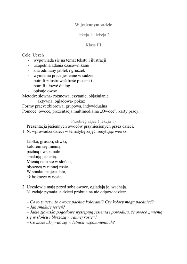 W jesiennym sadzie lekcja 1 i lekcja 2 Klasa III Cele: Uczeń - wypowiada się na temat tekstu i ilustracji - uzupełnia zdania czasownikami - zna odmiany jabłek i gruszek - wymienia prace jesienne w sadzie - potrafi zilustrować treść piosenki - potrafi ułożyć dialog - opisuje owoc Metody: słowna- rozmowa, czytanie, objaśnianie aktywna, oglądowa- pokaz Formy pracy: zbiorowa, grupowa, indywidualna Pomoce: owoce, prezentacja multimedialna „Owoce”, karty pracy. Przebieg zajęć ( lekcja 1) 1. Prezentacja jesiennych owoców przyniesionych przez dzieci. 1. N. wprowadza dzieci w tematykę zajęć, recytując wiersz: Jabłka, gruszki, śliwki, kolorem się mienią, pachną i wspaniale smakują jesienią. Mienią nam się w słońcu, błyszczą w rannej rosie. W smaku czujesz lato, aż łaskocze w nosie. 2. Uczniowie mają przed sobą owoce, oglądają je, wąchają. N. zadaje pytania, a dzieci próbują na nie odpowiedzieć: – Co to znaczy, że owoce pachną kolorami? Czy kolory mogą pachnieć? – Jak smakuje jesień? – Jakie zjawiska pogodowe występują jesienią i powodują, że owoce „mienią się w słońcu i błyszczą w rannej rosie”? – Co może ukrywać się w letnich wspomnieniach? Po udzieleniu odpowiedzi dzieci delikatnie wkładają owoce do koszyka (koszyków), grupując je według gatunku, koloru, kształtu. Koszyki z owocami stawiamy w widocznym miejscu. 3. Czytanie opowiadania Marii Kownackiej „W sadzie”. Dzieci swobodnie wypowiadają się na temat treści opowiadania i ilustracji. Odpowiadają na pytania: – Jakie prace wykonuje się w jesiennym sadzie? – Czym różni się sad jesienny od wiosennego? – Jakie barwy dominują w sadzie? – Dokąd zostaną zabrane jabłka zerwane z drzew, a dokąd te, które same spadły? – Dlaczego w dwa różne miejsca? Porównywanie tekstu z ilustracją. Wyszukiwanie i podkreślanie w tekście tych fragmentów, które pasują do ilustracji. 4. Zabawa ruchowo-słowna „Wycieczka do sadu”. N. tworzy krótkie opowiadanie o wycieczce do sadu. Dzieci wsłuchują się w opowiadanie i ilustrują je ruchowo. Pewnego dnia wybraliśmy się z klasą do sadu. Mieliśmy pomagać przy zrywaniu jabłek. Niestety pogoda nam nie dopisała. Było chłodno i dżdżysto. Kiedy zabraliśmy się do pracy, od razu zrobiło nam się cieplej. Aby dostać się do owoców, trzeba było ostrożnie wejść po drabinie, następnie zerwać owoc i delikatnie włożyć go do koszyka. Po zapełnieniu całego kosza owocami musieliśmy posegregować jabłka i przełożyć je do skrzynek. Pracowaliśmy przez kilka godzin. Nawet nie zauważyliśmy, że wyszło słońce. Po pracy zostaliśmy zaproszeni na degustację owoców. Owoce były przepyszne, tym bardziej że sami je zerwaliśmy. Praca była trochę męcząca, ale byliśmy z niej zadowoleni, ponieważ pracowaliśmy wspólnie i zgodnie. Praca w sadzie była wspaniałą przygodą. 6. 5. Nalepianie nalepek „Prace w jesiennym sadzie”. Omówienie kolejnych etapów pracy. 6. Zabawa ruchowo-naśladowcza „Praca w sadzie”. Przy podkładzie muzycznym do piosenki z klasy 2. „W sadzie” dzieci naśladują czynności wypowiadane przez N.: – maszerujemy do sadu; – ustawiamy podpory pod gałęziami drzew; – wchodzimy po drabinie, zrywamy owoce, wkładamy je do koszyka; – segregujemy i delikatnie układamy owoce w skrzynkach; – przenosimy skrzynie do samochodu; – przycinamy gałęzie; – sadzimy młode drzewka owocowe. W drugiej części zabawy N. włącza piosenkę z klasy 2. „W sadzie” i dzieci improwizują ruchowo treść piosenki. 7. Tworzenie i pisanie czasowników od rzeczowników. 8. Uzupełnianie tekstu czasownikami w odpowiedniej formie i przepisywanie go do zeszytu. 9. Układanie dialogu „W sadzie” z wykorzystaniem zgromadzonych informacji– praca parami. 10. Prezentacja dialogów 11. Podsumowanie i samoocena pierwszej lekcji Lekcja druga 1. Oglądanie prezentacji multimedialnej „Owoce”. N. zwraca uwagę na różne odmiany jabłek, gruszek i śliwek. Dzieci podają inne nazwy odmian tych owoców. N. uzupełnia informacje. Jabłka zaczęto hodować w Polsce dopiero w XII wieku. Najbardziej popularne odmiany jabłek to: – ligol – odmiana polska, owoc duży, kulisto-stożkowy, o zielonkawej skórce z czerwonym rumieńcem od strony nasłonecznionej; – szara reneta – odmiana amerykańska, owoc duży, baryłkowaty, o zielonkawożółtej skórce; – spartan – odmiana kanadyjska, owoc drobny lub średniej wielkości, skórka pokryta czerwonym rumieńcem; – cortland – odmiana angielska, duży owoc, baryłkowaty, o zielono-żółtawej skórce z wiśniowym rumieńcem. Gruszki znane są od bardzo dawna. Już 3 tysiące lat temu hodowali je Rzymianie. Początkowo jedzono je gotowane, ponieważ uważano, że surowe są trujące. Dopiero za czasów króla Ludwika XVI zaczęto je jeść na surowo. Do najpopularniejszych u nas odmian należą: – faworytka, zwana klapsą, o kolorze zielonkawym z czerwonym rumieńcem; pojawia się w sierpniu, nie nadaje się do przechowywania; – komisówka – owoc zielonożółty o matowej skórce, odmiana jesienna; – williams – owoc zielonkawy, żółto-złotawy z różowym rumieńcem. Smaczne śliwki też mają swoją historię. W Polsce najstarsze informacje o śliwkach pochodzą z XII wieku. Najbardziej znane odmiany w Polsce: – mirabelka – o małych kulistych owocach w kolorze złocistożółtym; – renkloda – o owocu dużym w różnych kolorach: zielonym, czerwonym, żółtozielonym, 2. Rozpoznawanie różnych odmian w/w owoców- zabawa ( tablica interaktywna). 3. Kolorowanie owoców. 4. Opisywanie wybranego owocu. 5. Przeprowadzenie doświadczenia „Pestki”.- praca w grupach. N. rozdaje dzieciom po 1 jabłku i 1 gruszce. Dzieci kroją owoce na pół. Przeliczają ilość pestek w owocach. Określają ich smak. Porównują wygląd. Swoje doznania zapisują w podręczniku. N. podaje informacje, że grusz