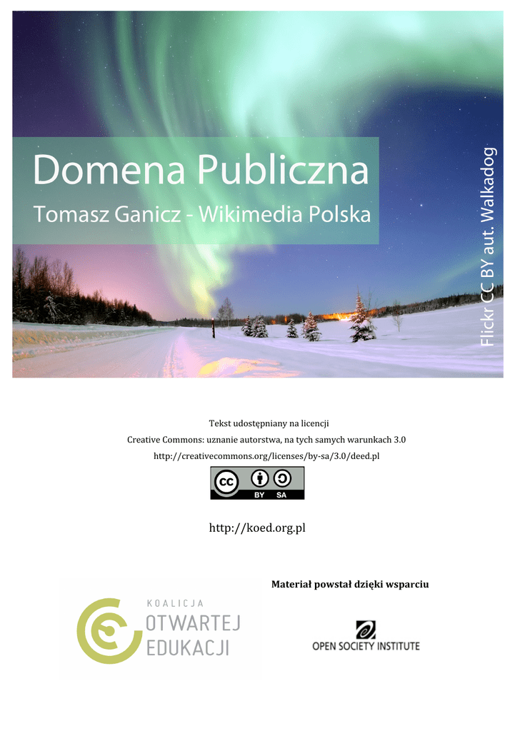 Tekst udostępniany na licencji Creative Commons: uznanie autorstwa, na tych samych warunkach 3.0 http://creativecommons.org/licenses/by‐sa/3.0/deed.pl http://koed.org.pl Materiał powstał dzięki wsparciu Domena Publiczna Domena publiczna to ważna część kultury, która dzięki temu, że nie jest chroniona majątkowym prawem autorskim może być swobodnie wykorzystywana do dalszego jej rozwoju i stanowi nasze wspólne dziedzictwo, bez którego trudno wyobrazić sobie funkcjonowanie społeczeństwa. Domenę publiczną tworzą dzieła, które nigdy nie podlegały tej ochronie oraz dzieła, do których wygasły prawa autorskie. Ustalenie obu tych faktów bywa jednak czasami trudne i wymaga dokładnego zapoznania się ze współczesnymi i dawnymi zapisami ustawowymi w tej materii. Czasami zalicza się też do domeny publicznej utwory udostępniane przez autorów współczesnych na wolnych licencjach. Rozdział zawiera podstawowe informacje o prawnych aspektach wykorzystania utworów z domeny publicznej i uczy, jak je rozpoznawać. Co to jest domena publiczna? Domena publiczna (ang.: public domain) — w najwęższym znaczeniu jest to twórczość, z której można korzystać bez ograniczeń wynikających z uprawnień, jakie mają posiadacze autorskich praw majątkowych, gdyż prawa te wygasły lub twórczość ta nigdy nie była lub aktualnie nie jest przedmiotem prawa autorskiego. Pojęcie to wywodzi się anglosaskiego common law i początkowo oznaczało grunty należące do państwa, które zostały Symbol domeny publicznej — źródło: Wikimedia Commons, domena publiczna udostępnione do bezpłatnego użytku publicznego, co później zostało rozciągnięte na własność intelektualną, która z różnych względów nie jest objęta ochroną prawa autorskiego i może w związku z tym być wykorzystywana bezpłatnie przez każdego. Pojęcie to funkcjonuje też w znaczeniu szerszym i obejmuje także wszelką twórczość dostępną bez ograniczeń dla każdego, również tą wciąż objętą prawami autorskimi, ale udostępnioną na wolnych licencjach, lub przynajmniej udostępnianą bezpłatnie do niekomercyjnego użytku prywatnego. W tym znaczeniu pojęcie 2 to pojawia się np: w dokumentach i dyskusjach Światowej Organizacji Własności Intelektualnej, grup dyskusyjnych działających w ramach UNESCO oraz Manifeście Domeny Publicznej http://www.publicdomainmanifesto.org/ wypracowanym w projekcie UE „Communia” — europejskiej sieci tematycznej poświęconej cyfrowej domenie publicznej. Jak powstaje (i się kurczy) domena publiczna? W bardziej ścisłym, prawniczym znaczeniu do domeny publicznej zaliczamy tylko taką twórczość, która jest całkowicie wolna od ograniczeń wynikających z majątkowych aspektów prawa autorskiego. Dalsza część tego rozdziału będzie dotyczyła tylko takiego wąskiego znaczenia tego pojęcia. Każde z państw ma nieco inne prawo autorskie i również inne zapisy ustalające, co jest w domenie publicznej. Ogólnie jednak, w prawie wszystkich państwach świata na domenę publiczną składają się: • prace do których wygasły majątkowe prawa autorskie; • materiały, które od samego początku ich opublikowania nie są objęte tymi prawami, gdyż tak zdecydowali ustawodawcy. Ciekawostka: Wyjątkiem od tej zasady jest np.: Afganistan, który w ogóle nie posiada prawa autorskiego i nie jest sygnatariuszem żadnych międzynarodowych umów dotyczących wzajemnej ochrony tych praw, a zatem można uznać, że cała twórczość obywateli tego państwa jest w domenie publicznej. Innym wyjątkiem jest też. Wielka Brytania, gdzie zamiast zbioru materiałów, które nie są ustawowo objęte prawami autorskimi istnieje pojęcie wieczystych „praw królewskich” (crown copyright), którymi objęte są wszelkie dzieła tworzone przez rząd i parlament tego kraju, ale do których każdy obywatel ma z zasady wolny i bezpłatny dostęp, ich wtórne użycie wymaga jednak zgody specjalnego urzędu. W wielu krajach ze względu na zmiany w prawie autorskim domena publiczna się kurczy — to znaczy dzieła, które już były w domenie publicznej po wprowadzeniu zmian ustawowych stają się znowu zastrzeżone. Wynika to z faktu, że w kolejnych krajach wydłużony został okres wygasania praw autorskich i prawo to działa również wstecz. W tej chwili w większości krajów zachodu prawa autorskie wygasają w 70 lat po śmierci autora lub pierwszej publikacji dzieła. Wiele z tych niekorzystnych zmian zostało wymuszonych traktatami międzynarodowymi o wzajemnej ochronie praw, które są uzgadniane w ramach Światowej Organizacja Własności Intelektualnej (WIPO) i paru innych podobnych struktur. W ramach WIPO wprowadzono m.in. zapisy traktatowe wymuszające minimalny okres ochrony majątkowych praw autorskich — we wszystkich krajach sygnatariuszach — na 50 3 lat oraz zasadę wzajemnego uznawania dłuższej ochrony, jeśli to wynika z prawa kraju, w którym powstało dzieło. Istnieje też problem dzieł osieroconych, czyli takich, które prawdopodobnie powinny już znaleźć się w domenie publicznej, ale ze względu na brak danych o ich twórcach nie ma co do tego całkowitej pewności. Problem dzieł osieroconych powstał na skutek ciągłego wydłużania okresu wygasania praw majątkowych oraz zasady, że prawa te są przyznawane twórcom automatycznie, bez konieczności ich rejestrowania. W USA i kilku innych krajach istniały systemy rejestracji praw, ale w wyniku przyjęcia traktatów WIPO narzucających zasadę automatycznego ich nabywania straciły one rację bytu. W samym USA szacuje się, że dzieła osierocone powstałe w XX w. stanowią ok. 70% całej twórczości, która powinna znaleźć się już w domenie publicznej. Na koniec warto wspomnieć też o problemach z utworami zależnymi. Utwory zależne, to takie, które powstało w wyniku twórczej modyfikacji dzieła pierwotnego. Są to np: tłumaczenia, kolaże fotograficzne, a