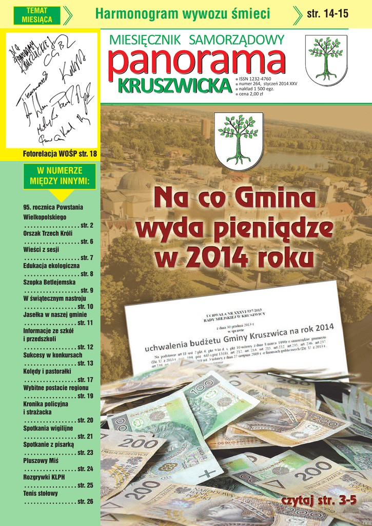 TEMAT MIESIĄCA panorama KRUSZWICKA Harmonogram wywozu śmieci MIESIĘCZNIK SAMORZĄDOWY ISSN 1232-4760 numer 264, styczeń 2014 XXV nakład 1 500 egz. cena 2,00 zł Fotorelacja WOŚP str. 18 W NUMERZE MIĘDZY INNYMI: 95. rocznica Powstania Wielkopolskiego . . . . . . . . . . . . . . . . . . str. 2 Orszak Trzech Króli . . . . . . . . . . . . . . . . . . str. 6 Wieści z sesji . . . . . . . . . . . . . . . . . . str. 7 Edukacja ekologiczna . . . . . . . . . . . . . . . . . . str. 8 Szopka Betlejemska . . . . . . . . . . . . . . . . . . str. 9 W świątecznym nastroju . . . . . . . . . . . . . . . . . str. 10 Jasełka w naszej gminie . . . . . . . . . . . . . . . . . str. 11 Informacje ze szkół i przedszkoli . . . . . . . . . . . . . . . . . str. 12 Sukcesy w konkursach . . . . . . . . . . . . . . . . . str. 13 Kolędy i pastorałki . . . . . . . . . . . . . . . . . str. 17 Wybitne postacie regionu . . . . . . . . . . . . . . . . . str. 19 Kronika policyjna i strażacka . . . . . . . . . . . . . . . . . str. 20 Spotkania wigilijne . . . . . . . . . . . . . . . . . str. 21 Spotkanie z pisarką . . . . . . . . . . . . . . . . . str. 23 Pluszowy Miś . . . . . . . . . . . . . . . . . str. 24 Rozgrywki KLPH . . . . . . . . . . . . . . . . . str. 25 Tenis stołowy . . . . . . . . . . . . . . . . . str. 26 str. 14-15 panorama KRUSZWICKA 2 95. Rocznica Powstania Wielkopolskiego Z okazji 95 rocznicy wybuchu Powstania Wielkopolskiego 1918/1919 w dniu 5 stycznia 2014 r. w Kolegiacie p.w. śś. Ap. Piotra i Pawła w Kruszwicy odbyła się Msza Święta za wolność Ojczyzny w rocznicę wyzwolenia Kruszwicy w Powstaniu Wielkopolskim. Przed Mszą Świętą harcerki z MOW w Kruszwicy rozdawały mieszkańcom pamiątkowe przypinki, a na grobie Powstańców Wielkopolskich delegacje złożyły kwiaty. Przy grobie wartę honorową pełnili uczniowie klas mundurowych z ZSP im. Kazimierza Wielkiego w Kruszwicy oraz harcerki z MOW w Kruszwicy. W tym samym dniu w ambulansie przy Domu Aniołów Stróżów w Kruszwicy można było oddać krew w ramach akcji pn. „Krew za krew”. Akcja cieszyła się dużym zainteresowaniem. Urząd Miejski składa serdeczne podziękowania dla mieszkańców, delegacji, pocztów sztandarowych, harcerek z Młodzieżowego Ośrodka Wychowawczego oraz uczniom klas mundurowych ZSP im. Kazimierza Wielkiego za udział w uroczystościach. Ponadto Urząd Miejski składa podziękowania dla Klubu HDK w Kruszwicy oraz pani Alinie Nowackiej za pomoc w organizacji. Muzyka pod choinkę 6 stycznia 2014 r. w Kolegiacie p.w. śś. Ap. Piotra i Pawła w Kruszwicy odbył się koncert pt. „Muzyka pod choinkę”. Najpiękniejsze kolędy świata wykonała dla przybyłych mieszkańców pani Agnieszka Gertner-Polak, a towarzyszył jej Zespół Muzyczny „Pro Arte” z Inowrocławia w składzie: Jacek Kaczor – skrzypce, Agata Kopycińska-Karbowniczek – skrzypce, Zbigniew Milewski – altówka, Małgorzata Kopycińska – wiolonczela, Jolanta Czerniawska – fortepian. Koncert poprowadzili: Maria Juraszek i Grzegorz Polak. panorama KRUSZWICKA 3 Rusza remont 11 świetlic wiejskich w Gminie Kruszwica Świetlice wiejskie współcześnie pełnią głównie funkcję społeczno-kulturalną. Są miejscem, gdzie znajdują się aktywne grupy społeczności lokalnej - koła gospodyń wiejskich, ochotnicze straże pożarne, rady sołeckie, zespoły ludowe, a ponadto skupia życie kulturalne mieszkańców wsi. Stan obecny świetlic wiejskich na terenie gminy Kruszwica nie jest zadowalający, dlatego też władze postanowiły stworzyć bardziej komfortowe warunki dla ich dalszego funkcjonowania. W dniu 19.12.2013 r. Burmistrz Kruszwicy podpisał umowę o dofinansowanie projektu pn. „Remont świetlic znajdujących się na obszarach wiejskich Gminy Kruszwica”. Zadanie będzie realizowane przy udziale środków zewnętrznych w wysokości 321.566,00 zł w ramach działania 413 Wdrażanie lokalnych strategii rozwoju PROW na lata 2007-2013 dla operacji, które odpowiadają warunkom przyznania pomocy w ramach działania Odnowa i rozwój wsi. Projekt obejmuje remont 11 świetlic na terenie gminy Kruszwica, a mianowicie w miejscowościach: Chełmce, Gocanowo, Ostrowo, Witowice, Rusinowo, Żerniki, Sukowy, Wróble, Tarnowo, Polanowice, Rzepowo. Zakres prac jest zróżnicowany (w zależności od stanu w jakim znajduje się dana świetlica) i będzie obejmował m. in. wymianę okien, drzwi, malowanie i odnowienie pomieszczeń podłóg, a z zewnątrz remont pokrycia dachowego czy elewacji, itp. Projekt zostanie zrealizowany do końca sierpnia 2014 r. Szacunkowa wartość zadania wyniesie 500.000,00 zł. panorama KRUSZWICKA 4 Nowy rok - nowe inwestycje i remonty Rok 2014 podobnie jak poprzedni wiązać się będzie z przeprowadzeniem kolejnych zadań inwestycyjnych. Zaplanowano 31 przedsięwzięć, z których 18 dotyczy terenów wiejskich, a 13 miasta Kruszwica. a ich realizację przeznaczono ponad 7,8 mln zł. Inwestycje drogowe są priorytetem dla Gminy Kruszwica Stan infrastruktury drogowej jest jednym z najważniejszych kryteriów oceny poziomu rozwoju społeczno – gospodarczego gminy, dlatego też budowę i przebudowę infrastruktury drogowej uznano za jeden z priorytetowych zadań, dlatego też najwięcej środków finansowych przeznaczono właśnie na inwestycje drogowe. W ramach tych zadań zakończona zostanie przebudowa kruszwickiego Rynku, na której realizację w listopadzie 2013 r. złożono wniosek o dofinansowanie z Unii Europejskiej w ramach pozostałej alokacji środków przeznaczonych na rewitalizację miasta. Wykonane zostaną również nowe nawierzchnie - ulicy Grodzkiej w Kruszwicy oraz drogi gminnej Piecki – Bachorce. Na realizację tej drugiej inwestycji Gmina Kruszwica stara się o dofinansowanie w ramach dawnego Funduszu Ochrony Gruntów Rolnych. Ważną inwestycją tego roku jest poprawa warunków infrastruktury służącej jako targowisko przy ul. Kujawskiej w Kruszwicy, w związku z czym 