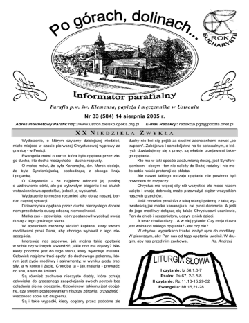 Nr 33 (584)/1 PO GÓRACH, DOLINACH... 14 sierpnia 2005 r. Parafia p.w. św. Klemensa, papieŜa i męczennika w Ustroniu Nr 33 (584) 14 sierpnia 2005 r. Adres internetowy Parafii: http://www.ustron.bielsko.opoka.org.pl E-mail Redakcji: [email protected] XX NIEDZIELA ZWYKŁA Wydarzenie, o którym czytamy dzisiejszej niedzieli, miało miejsce w czasie pierwszej Chrystusowej wyprawy za granicę - w Fenicji. Ewangelia mówi o córce, która była opętana przez złego ducha, i to ducha nieczystości - ducha rozpusty. O matce mówi, Ŝe była Kananejką, św. Marek dodaje, Ŝe była Syrofenicjanką, pochodzącą z obcego kraju i poganką. O Chrystusie - Ŝe najpierw odrzucił jej prośbę o uzdrowienie córki, ale po wytrwałym błaganiu i na skutek wstawiennictwa apostołów, jednak ją wysłuchał. Wydarzenie to moŜna rozumieć jako obraz naszej, bardzo częstej sytuacji. Dziewczynka opętana przez ducha nieczystego dobrze nam przedstawia duszę oddaną niemoralności. Matka zaś - człowieka, który postanowił wydobyć swoją duszę z tego groźnego stanu. W apostołach moŜemy widzieć kapłana, który swoimi modlitwami prosi Pana, aby chorego wybawił z tego nieszczęścia. Interesuje nas zapewne, jak moŜna takie opętanie w sobie czy w innych stwierdzić, jakie ono ma objawy? Niekiedy podobne jest do tego stanu, który wywołuje malaria. Człowiek najpierw traci apetyt do duchowego pokarmu, którym jest Ŝycie modlitwy i sakramenty; w wyniku głodu traci siły, a w końcu i Ŝycie. Choroba ta - jak malaria - prowadzi do snu, a sen do śmierci. Są równieŜ zuchwałe nieczyste diabły, które pchają człowieka do grzesznego zaspokajania swoich potrzeb bez oglądania się na otoczenie. Człowiekowi takiemu jest obojętne, czy swoim postępowaniem niszczy zdrowie, przyszłość i wieczność sobie lub drugiemu. Są i takie wypadki, kiedy opętany przez podobne złe duchy nie boi się pójść za swoimi zachciankami nawet „po trupach". Zabójstwa i samobójstwa na tle seksualnym, o których dowiadujemy się z prasy, są właśnie przejawami takiego opętania. Kto ma w taki sposób zadŜumioną duszę, jest Syrofenicjaninem - obcym - ten nie naleŜy do BoŜej rodziny i nie moŜe sobie rościć pretensji do chleba. Ale nawet takiego rodzaju opętanie nie powinno być powodem do rozpaczy. Chrystus ma więcej siły niŜ wszystkie złe moce razem wzięte i swoją dobrocią moŜe przewaŜyć cięŜar wszystkich naszych grzechów. Jeśli człowiek prosi Go z taką wiarą i pokorą, z taką wytrwałością jak matka kananejska, nie prosi daremnie. A jeśli do jego modlitwy dołączą się takŜe Chrystusowi uczniowie, Pan da chleb i szczeniętom, uczyni z nich dzieci. A teraz chwila ciszy... A w niej pytanie: Czy moja dusza jest wolna od takiego opętania? Jest czy nie? W obydwu wypadkach trzeba złoŜyć ręce do modlitwy. W pierwszym, aby Pan nas od tego opętania uwolnił. W drugim, aby nas przed nim zachował. Ks. Andrzej I czytanie: Iz 56,1.6-7 Psalm: Ps 67, 2-3.5.8 II czytanie: Rz 11,13-15.29-32 Ewangelia: Mt 15,21-28 Nr 33 (584)/2 PO GÓRACH, DOLINACH... Godzina RóŜańcowa W kaŜdy wtorek miesiąca od godz. 1700 do 1800 przed Najświętszym Sakramentem odmawiamy poszczególne części RóŜańca św. Modlą się ci wszyscy, którzy kochają i odmawiają RóŜaniec i stanowią dzięki tej modlitwie - uobecniającej nam Matkę BoŜą - jedną wielką róŜańcową rodzinę Maryi. W naszej Parafii niestety rodzina róŜańcowa nie jest bardzo wielka, jak moŜna wnioskować po uczestniczących w tym naboŜeństwie. Jest nas znacznie mniej niŜ na naboŜeństwach majowych, czerwcowych, drodze krzyŜowej czy na naboŜeństwach róŜańcowych w październiku. Dlaczego? CzyŜbyśmy jeszcze nie doceniali i nie doświadczyli mocy RóŜańca św. odmawianego wspólnotowo, który jest modlitwą doskonałą. Św. Ludwik de Monfort w swej ksiąŜce pt. „Przedziwny sekret RóŜańca św.” pisze: najbardziej chwalebnym dla Pana Jezusa i zbawiennym dla duszy jest odmawianie róŜańca na sposób psalmów, czyli publicznie - wspólnie. Pan Jezus zalecał wyraźnie swoim uczniom modlitwę wspólną, kiedy obiecał im, Ŝe zawsze, gdy dwie lub trzy osoby są zgromadzone w Jego imię, On będzie pośród nich. W sposób szczególny i specjalny jest z nami w RóŜańcu obecna równieŜ Maryja. Z Maryją modlimy się do Boga, naszego wszechmogącego Ojca. Do Niego zanosimy nasze gorące prośby we wszystkich doczesnych i nadprzyrodzonych potrzebach. Dlatego kaŜdą tajemnicę RóŜańca otwiera modlitwa do Ojca, który jest w niebie. Modlitwa nasza jest tym skuteczniejsza z im czystszego i bardziej szczerego płynie serca. PoniewaŜ jesteśmy, niestety, niedoskonali i grzeszni, szukamy w modlitwie pośrednictwa aniołów i świętych. Najdoskonalszą królową aniołów i wszystkich świętych jest nasza Niebieska Matka, najbliŜsza Panu Bogu, wstawia się za nami w modlitwie róŜańcowej. Prosimy Ją o to, zwracając się do Niej słowami - Święta Maryjo Matko BoŜa, módl się za nami, bo my jesteśmy grzeszni, bo jesteś Matką BoŜą, Bogu najbliŜszą! Tobie Bóg nie odmówi. W tej modlitwie najpierw uwielbiamy Maryję - łaski pełna, Pan z Tobą i błogosławiona jesteś między niewiastami i błogosławiony owoc Ŝywota Twego. To uwielbienie i prośby zanosimy aŜ dziesięć razy, więc serce Maryi nie moŜe być obojętne, bierze nasze potrzeby, prośby w swoje dłonie i przedstawia je Synowi. Syn BoŜy Matce nie odmawia, nawet w Kanie Galilejskiej mimo, Ŝe nie nadeszła Jego godzina. W RóŜańcu oddajemy hołd i uwielbiamy z Maryją całą Trójcę Świętą - Ojca, Syna i Ducha Świętego. Odmawiając poszczególne tajemnice RóŜańca rozmyślamy o sytuacjach z Ŝycia Jezusa i Maryi. Król Dawid w jednym z psalmów wyraŜa pragnienie, 14 sierpnia 2005 r. aby w medytacjach jego rozpalał się ogień. Prośmy o ten ogień dla naszych wystudzonych serc, aby wyniszczył w nich samolubstwo,