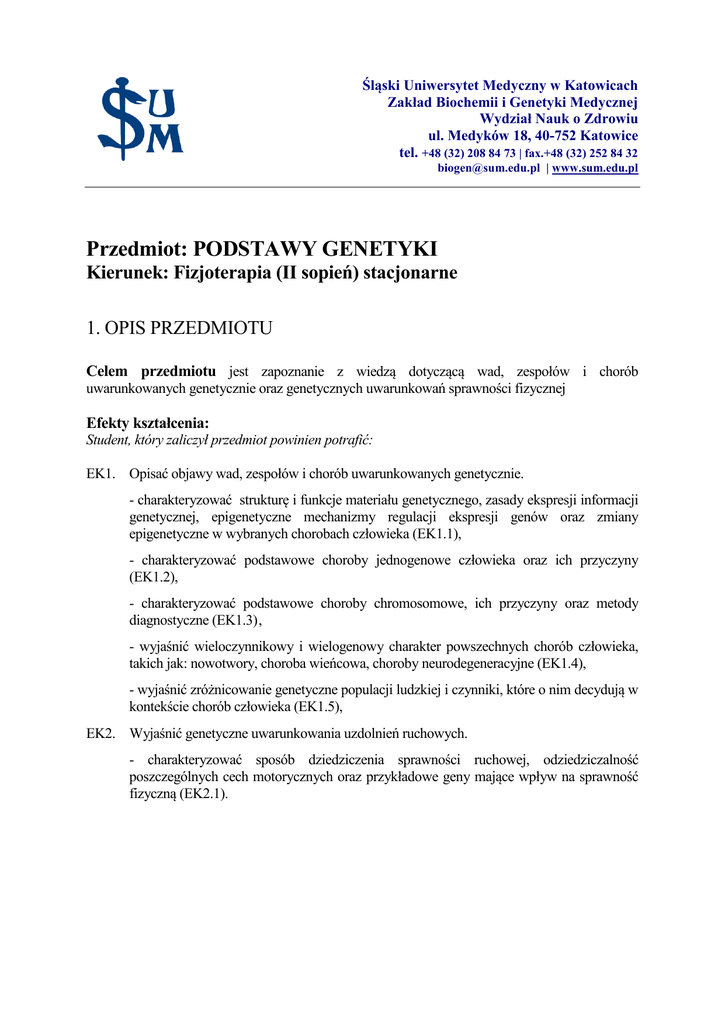 Śląski Uniwersytet Medyczny w Katowicach Zakład Biochemii i Genetyki Medycznej Wydział Nauk o Zdrowiu ul. Medyków 18, 40-752 Katowice tel. +48 (32) 208 84 73 | fax.+48 (32) 252 84 32 [email protected] | www.sum.edu.pl Przedmiot: PODSTAWY GENETYKI Kierunek: Fizjoterapia (II sopień) stacjonarne 1. OPIS PRZEDMIOTU Celem przedmiotu jest zapoznanie z wiedzą dotyczącą wad, zespołów i chorób uwarunkowanych genetycznie oraz genetycznych uwarunkowań sprawności fizycznej Efekty kształcenia: Student, który zaliczył przedmiot powinien potrafić: EK1. Opisać objawy wad, zespołów i chorób uwarunkowanych genetycznie. - charakteryzować strukturę i funkcje materiału genetycznego, zasady ekspresji informacji genetycznej, epigenetyczne mechanizmy regulacji ekspresji genów oraz zmiany epigenetyczne w wybranych chorobach człowieka (EK1.1), - charakteryzować podstawowe choroby jednogenowe człowieka oraz ich przyczyny (EK1.2), - charakteryzować podstawowe choroby chromosomowe, ich przyczyny oraz metody diagnostyczne (EK1.3) , - wyjaśnić wieloczynnikowy i wielogenowy charakter powszechnych chorób człowieka, takich jak: nowotwory, choroba wieńcowa, choroby neurodegeneracyjne (EK1.4), - wyjaśnić zróżnicowanie genetyczne populacji ludzkiej i czynniki, które o nim decydują w kontekście chorób człowieka (EK1.5), EK2. Wyjaśnić genetyczne uwarunkowania uzdolnień ruchowych. - charakteryzować sposób dziedziczenia sprawności ruchowej, odziedziczalność poszczególnych cech motorycznych oraz przykładowe geny mające wpływ na sprawność fizyczną (EK2.1). Śląski Uniwersytet Medyczny w Katowicach Zakład Biochemii i Genetyki Medycznej Wydział Nauk o Zdrowiu ul. Medyków 18, 40-752 Katowice tel. +48 (32) 208 84 73 | fax.+48 (32) 252 84 32 [email protected] | www.sum.edu.pl 2. PROGRAM ZAJĘĆ I ZAGADNIENIA TEORETYCZNE WYKŁADY 1. Struktura i funkcja materiału genetycznego, genu, genomu: Informacja genetyczna – struktura i funkcja DNA. Struktura genów i genomu ludzkiego (geny i obszary międzygenowe). Dziedziczenie mitochondrialne. Kod genetyczny. Zasady ekspresji informacji genetycznej. 2. Podstawy epigenetyki: Epigenetyczne mechanizmy wyciszania ekspresji genów; a) na etapie transkrypcji: modyfikacje chemiczne zasad azotowych i histonów, interferencja RNA (małe interferujące RNA-siRNA), b) na etapie translacji: interferencja RNA (mikro RNA-miRNA). Zmiany epigenetyczne w wybranych chorobach człowieka. Zastosowanie interferencji RNA w terapii chorób człowieka. 3. Choroby wieloczynnikowe 1: Dziedziczenie wielogenowe – współdziałanie genów w kształtowaniu jednej cechy o charakterze kumulatywnym, dopełniającym się i epistaza. Oddziaływania pomiędzy czynnikami genetycznymi i środowiskowymi w kształtowaniu fenotypu. Szansa, iloraz szans, ryzyko, synergia. Wprowadzenie do genetyki choroby niedokrwiennej serca. Jednogenowe postacie chorób sercowo-naczyniowych (na przykładzie hipercholesterolemii rodzinnej). Polimorfizmy genów kodujących białka kluczowe w przebiegu miażdżycy (na przykładzie genów zaangażowanych w regulację gospodarki lipidowej i ciśnienia krwi). 4. Choroby wieloczynnikowe 2: Podstawy genetyki cukrzycy typu I i II, nadciśnienia tętniczego, chorób psychicznych, autoimmunologicznych oraz neurodegeneracyjnych. Jednogenowe postacie chorób. Mutacje w genach kandydatach, polimorfizmy genów kształtujących podatność. 5. Elementy genetyki populacyjnej w kontekście chorób człowieka: Zróżnicowanie genetyczne populacji ludzkiej, różnice w występowaniu chorób genetycznych, polimorfizm genetyczny. Równowaga Hardy’ego-Weinberga. Czynniki wpływające na częstości genotypów i alleli w populacji: selekcja, mutacje, izolacja, migracja, dryf genetyczny. Genetyczne obciążenie populacji. Eugenika. Śląski Uniwersytet Medyczny w Katowicach Zakład Biochemii i Genetyki Medycznej Wydział Nauk o Zdrowiu ul. Medyków 18, 40-752 Katowice tel. +48 (32) 208 84 73 | fax.+48 (32) 252 84 32 [email protected] | www.sum.edu.pl ĆWICZENIA 1. Choroby genowe: Zmienność mutacyjna – mutacje genowe. Mutacje spontaniczne, indukowane, mutageny. Przykłady jednogenowych chorób genetycznych i cechy dziedziczenia autosomalnego dominującego (achondroplazja, dystrofia miotoniczna, zespół Marfana, choroba Huntingtona, osteogenesis imperfecta) i recesywnego (jednogenowe bloki metaboliczne tyrozynemia, fenyloketonuria, alkaptonuria, albinizm) u ludzi. Przykłady chorób i cechy dziedziczenia sprzężonego z płcią, recesywnego (dystrofia mięśniowa Duchenne’a i Beckera) i dominującego (krzywica hipofosfatemiczna typu I i II, zespół łamliwego chromosomu X) u ludzi. Ocena ryzyka chorób o podłożu jednogenowym. Choroby chromosomowe: Mutacje chromosomowe (strukturalne i liczbowe). Zespoły chorobowe spowodowane aberracjami strukturalnymi autosomów, mikrodelecjami, translokacjami. Mutacje chromosomowe liczbowe, aneuploidy. Trisomie autosomalne: chromosomu 13 (zespół Pataua), chromosomu 18 (zespół Edwardsa), chromosomu 21 (zespół Downa), chromosomu 22. Trisomie chromosomów płci: XXY, XXX, XYY. Monosomia chromosomu X (zespół Turnera). Diagnostyka dysmorfologiczna. SEMINARIA 1. Wprowadzenie do genetyki nowotworów. Jedno- i wielouderzeniowy model kancerogenezy. Protoonkogeny, geny supresorowe, czynniki naprawcze i ich udział w kontroli proliferacji oraz śmierci komórkowej. Wybrane choroby nowotworowe: dziedziczny nowotwór sutka typu 1 i 2, dziedziczny nowotwór jelita grubego. 2. Poradnictwo genetyczne. Cele i zasady postępowania. Zastosowanie metod cytogenetycznych w diagnostyce aberracji chromosomowych. Diagnostyka prenatalna. Metody inwazyjne i nieinwazyjne badań prenatalnych oraz ich wykorzystanie w diagnostyce chorób genetycznych i wad wrodzonych. 3. Genetyczne uwarunkowania uzdolnień ruchowych: Odziedziczalność poszczególnych składowych sprawności ruchowej człowieka. Genetyczne uwarunkowania różnicowania si