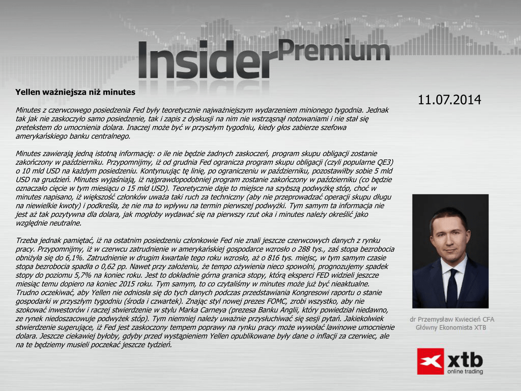 Yellen ważniejsza niż minutes Minutes z czerwcowego posiedzenia Fed były teoretycznie najważniejszym wydarzeniem minionego tygodnia. Jednak tak jak nie zaskoczyło samo posiedzenie, tak i zapis z dyskusji na nim nie wstrząsnął notowaniami i nie stał się pretekstem do umocnienia dolara. Inaczej może być w przyszłym tygodniu, kiedy głos zabierze szefowa amerykańskiego banku centralnego. Minutes zawierają jedną istotną informację: o ile nie będzie żadnych zaskoczeń, program skupu obligacji zostanie zakończony w październiku. Przypomnijmy, iż od grudnia Fed ogranicza program skupu obligacji (czyli popularne QE3) o 10 mld USD na każdym posiedzeniu. Kontynuując tę linię, po ograniczeniu w październiku, pozostawiłby sobie 5 mld USD na grudzień. Minutes wyjaśniają, iż najprawdopodobniej program zostanie zakończony w październiku (co będzie oznaczało cięcie w tym miesiącu o 15 mld USD). Teoretycznie daje to miejsce na szybszą podwyżkę stóp, choć w minutes napisano, iż większość członków uważa taki ruch za techniczny (aby nie przeprowadzać operacji skupu długu na niewielkie kwoty) i podkreśla, że nie ma to wpływu na termin pierwszej podwyżki. Tym samym ta informacja nie jest aż tak pozytywna dla dolara, jak mogłoby wydawać się na pierwszy rzut oka i minutes należy określić jako względnie neutralne. Trzeba jednak pamiętać, iż na ostatnim posiedzeniu członkowie Fed nie znali jeszcze czerwcowych danych z rynku pracy. Przypomnijmy, iż w czerwcu zatrudnienie w amerykańskiej gospodarce wzrosło o 288 tys., zaś stopa bezrobocia obniżyła się do 6,1%. Zatrudnienie w drugim kwartale tego roku wzrosło, aż o 816 tys. miejsc, w tym samym czasie stopa bezrobocia spadła o 0,62 pp. Nawet przy założeniu, że tempo ożywienia nieco spowolni, prognozujemy spadek stopy do poziomu 5,7% na koniec roku. Jest to dokładnie górna granica stopy, którą eksperci FED widzieli jeszcze miesiąc temu dopiero na koniec 2015 roku. Tym samym, to co czytaliśmy w minutes może już być nieaktualne. Trudno oczekiwać, aby Yellen nie odniosła się do tych danych podczas przedstawiania Kongresowi raportu o stanie gospodarki w przyszłym tygodniu (środa i czwartek). Znając styl nowej prezes FOMC, zrobi wszystko, aby nie szokować inwestorów i raczej stwierdzenie w stylu Marka Carneya (prezesa Banku Anglii, który powiedział niedawno, ze rynek niedoszacowuje podwyżek stóp). Tym niemniej należy uważnie przysłuchiwać się sesji pytań. Jakiekolwiek stwierdzenie sugerujące, iż Fed jest zaskoczony tempem poprawy na rynku pracy może wywołać lawinowe umocnienie dolara. Jeszcze ciekawiej byłoby, gdyby przed wystąpieniem Yellen opublikowane były dane o inflacji za czerwiec, ale na te będziemy musieli poczekać jeszcze tydzień. 11.07.2014 Wydarzenia tygodnia • Minutes FED – Rezerwa Federalna ogłosiła iż zakończenie QE3 nastąpi w prawdopodobnie w październiku poprzez cięcie 15; odniesień do podwyżek stóp żadnych nie było; rynek odebrał minutes jako umiarkowanie gołębie Plan raportu Temat tygodnia: • Rekomendacja kupna dolara str.3,4 Rynek akcyjny: • Sezon wyników na Wall Street: koniec hossy, koretka, czy atak historycznych poziomów str.5 • W.20 (WIG20fut.), US.500 (S&P500fut.) str. 6 Rynek walutowy: • EURUSD • USDJPY, GBPUSD • EURPLN, USDCAD minionego: str.7 str.8 str.9 Rynek surowców: • Ropa – 100 USD/b coraz bardziej realne str.10 • Ropa, Złoto str. 11 • Dane z UK – produkcja przemysłowa rozczarowuje, dane o cenach nieruchomości również, podobnie bilans handlowy; stopy bez zmian, funt lekko traci • Dane ze strefy euro – eksport i produkcja w Niemczech w maju wypadają dość słabo; we Francji jeszcze słabiej; odczyt inflacji we Francji 0,2 pp. poniżej oczekiwań • Dane z Chin – inflacja CPI niższa od oczekiwań; eksport również rozczarowuje • Payrollsy w Australii – zatrudnienie rośnie mocniej od oczekiwań, lecz bezrobocie w górę aż o 0,2 pp.; AUD lekko traci kolejnego: • Yellen w Kongresie – we wtorek szefowa FED przedstawi półroczny raport nt. polityki monetarnej przed Komisją Bankową Senatu , a w środę przed Komisją ds. Usług Finansowych Izby Reprezentantów • Dane z USA – we wtorek sprzedaż detaliczna indeksy NY Empire State, w środę produkcja przemysłowa i indeks NAHB, w czwartek claimsy i seria danych z r. nieruchomości, w piątek indeks UoM • Dane ze stefy euro – w poniedziałek przed PE wystąpi sam Mario Draghi, we wtorek indeks instytutu ZEW w Niemczech, w czwartek finalny odczyt czerwcowej inflacji • Dane z UK – we wtorek inflacja, a w środę rządowe dane z rynku pracy • Dane z Chin – w środę poznamy serię danych z Chin, w tym m.in. PKB za II kwartał i czerwcowe dane o produkcji przemysłowej i sprzedaży detalicznej • Dane z Japonii – w poniedziałek dane o inflacji CPI, we wtorek posiedzenie BoJ, a w piątek minutes z tego posiedzenia Temat tygodnia: Rekomendacja kupna dolara Rekomendację wydaliśmy już w środę, ale ze względu na fakt, iż a) ma ona charakter raczej długoterminowy oraz b) w notowaniach niewiele się zmieniło jest ona jak najbardziej obowiązująca. USD kupno, bazująca na poziomie indeksu dolara (USDX), egzekucja na parach walutowych EURUSD, USDJPY, GBPUSD, USDCAD, USDSEK, USDCHF Poziom aktywacji: 80,18 Cel: 85 Zlecenie zabezpieczające stop loss: 77 Kurs referencyjny z chwilą wydania rekomendacji: 80,18 – 9 lipiec, godzina 11:00 Horyzont oczekiwanego osiągnięcia celu przez cenę: 16 tygodni Uzasadnienie Oczekujemy umocnienia się dolara amerykańskiego względem koszyka walut mierzonego indeksem dolara. Nasze przewidywania bazują na analizie fundamentalnej, w szczególności analizie amerykańskiej gospodarki oraz polityki pieniężnej. Horyzont rekomendacji jest mocno orientacyjny ze względu na fakt, iż analizowane procesy mają charakter fundamentalny i ich wpływ na wycenę dolar