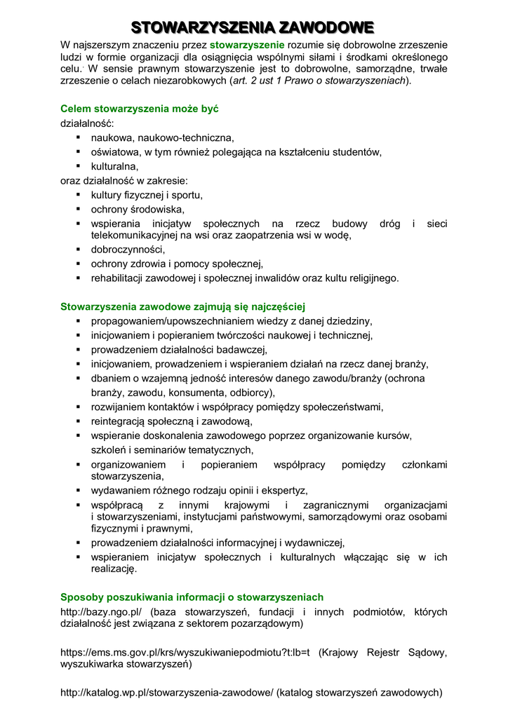 S ST TO OW WA AR RZ ZY YS SZ ZE EN NIIA AZ ZA AW WO OD DO OW WE E W najszerszym znaczeniu przez stowarzyszenie rozumie się dobrowolne zrzeszenie ludzi w formie organizacji dla osiągnięcia wspólnymi siłami i środkami określonego celu.. W sensie prawnym stowarzyszenie jest to dobrowolne, samorządne, trwałe zrzeszenie o celach niezarobkowych (art. 2 ust 1 Prawo o stowarzyszeniach). Celem stowarzyszenia może być działalność:  naukowa, naukowo-techniczna,  oświatowa, w tym również polegająca na kształceniu studentów,  kulturalna, oraz działalność w zakresie:  kultury fizycznej i sportu,  ochrony środowiska,  wspierania inicjatyw społecznych na rzecz budowy dróg telekomunikacyjnej na wsi oraz zaopatrzenia wsi w wodę,  dobroczynności,  ochrony zdrowia i pomocy społecznej,  rehabilitacji zawodowej i społecznej inwalidów oraz kultu religijnego. i sieci Stowarzyszenia zawodowe zajmują się najczęściej  propagowaniem/upowszechnianiem wiedzy z danej dziedziny,  inicjowaniem i popieraniem twórczości naukowej i technicznej,  prowadzeniem działalności badawczej,  inicjowaniem, prowadzeniem i wspieraniem działań na rzecz danej branży,  dbaniem o wzajemną jedność interesów danego zawodu/branży (ochrona branży, zawodu, konsumenta, odbiorcy),  rozwijaniem kontaktów i współpracy pomiędzy społeczeństwami,  reintegracją społeczną i zawodową,  wspieranie doskonalenia zawodowego poprzez organizowanie kursów, szkoleń i seminariów tematycznych,  organizowaniem i popieraniem współpracy pomiędzy członkami stowarzyszenia,  wydawaniem różnego rodzaju opinii i ekspertyz,  współpracą z innymi krajowymi i zagranicznymi organizacjami i stowarzyszeniami, instytucjami państwowymi, samorządowymi oraz osobami fizycznymi i prawnymi,  prowadzeniem działalności informacyjnej i wydawniczej,  wspieraniem inicjatyw społecznych i kulturalnych włączając się w ich realizację. Sposoby poszukiwania informacji o stowarzyszeniach http://bazy.ngo.pl/ (baza stowarzyszeń, fundacji i innych podmiotów, których działalność jest związana z sektorem pozarządowym) https://ems.ms.gov.pl/krs/wyszukiwaniepodmiotu?t:lb=t (Krajowy Rejestr Sądowy, wyszukiwarka stowarzyszeń) http://katalog.wp.pl/stowarzyszenia-zawodowe/ (katalog stowarzyszeń zawodowych)