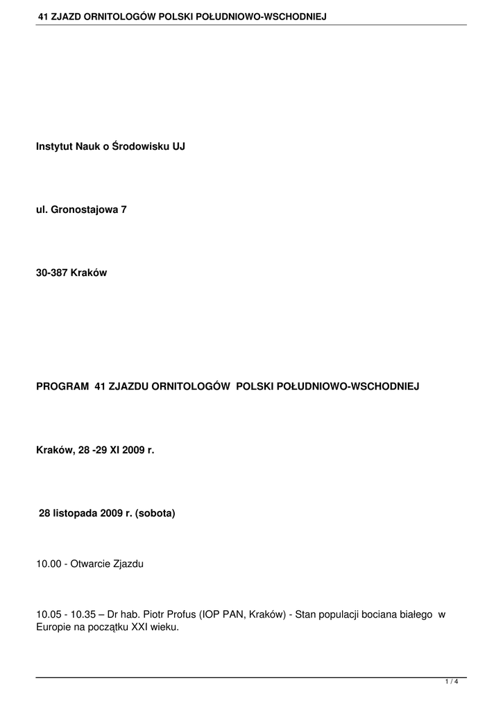 41 ZJAZD ORNITOLOGÓW POLSKI POŁUDNIOWO-WSCHODNIEJ Instytut Nauk o Środowisku UJ ul. Gronostajowa 7 30-387 Kraków PROGRAM 41 ZJAZDU ORNITOLOGÓW POLSKI POŁUDNIOWO-WSCHODNIEJ Kraków, 28 -29 XI 2009 r. 28 listopada 2009 r. (sobota) 10.00 - Otwarcie Zjazdu 10.05 - 10.35 – Dr hab. Piotr Profus (IOP PAN, Kraków) - Stan populacji bociana białego w Europie na początku XXI wieku. 1/4 41 ZJAZD ORNITOLOGÓW POLSKI POŁUDNIOWO-WSCHODNIEJ 10.35 - 10.55 – Sławomir Sielicki, Janusz Sielicki (Stowarzyszenie Na Rzecz Dzikich Zwierząt "Sokół", Włocławek) - Populacja nadrzewna sokoła wędrownego w Europie i restytucja gatunku w Polsce. 10.55 - 11.20 – Dr Beata Czyż (Zakład Ekologii Ptaków, Uniwersytet Wrocławski) - Zostać czy odejść? Strategie rozrodcze w świecie remizów. 11.20 - 11.35 – Przerwa 11.35 - 11.55 – Paweł Malczyk (MTO) - Rzadsze gatunki ptaków stwierdzone w 2009 r. w Małopolsce. 11.55 - 12.20 – Dr Kazimierz Walasz - Ochrona jerzyka i innych gatunków zasiedlających budynki. 12.20 - 12.40 – Barbara Archita, Tomasz Chodkiewicz (OTOP) - Monitoring Pospolitych Ptaków Lęgowych. 12.40 - 12.50 – Marcin Faber (INTERREX, Łódź) - Projekt dzwoniec - kolorowe obrączkowanie. 12.50 - 13.10 – Janusz Sielicki, Matyas Prommer, Anita Gamauf, Mirosław Kata (Stowarzyszenie Na Rzecz Dzikich Zwierząt "Sokół", Włocławek) - Raróg w Polsce 2008-2009. 13.10 - 14.30 – Zebranie wyborcze MTO. 14.30 - 15.00 – Przerwa obiadowa. 2/4 41 ZJAZD ORNITOLOGÓW POLSKI POŁUDNIOWO-WSCHODNIEJ 15.00 - 15.20 – Dr Michał Ciach (Akcja Carpatica) - Wyniki badań migracji ptaków w roku 2009 w ramach Akcji Carpatica. 15.20 - 15.40 – Dr Roma Gula, dr Jörn Theuerkauf (Muzeum i Instytut Zoologii PAN, Ustrzyki Dolne) - Kagu - wilki Melanezji. 15.40 - 16.00 – Dr Jacek Betleja (Muzeum Górnośląskie, Bytom) - Wrażenia ornitologiczne z Maroka. 16.00 - 16.10 – Przerwa. 16.10 - 16.40 – Przemysław Kunysz - (Klub Podróży Horyzonty) - Ptaki Senegambii. 16.40 - Pokazy zdjęć. Prosimy o przywiezienie i zaprezentowanie zdjęć, prezentacji komputerowych o tematyce przyrodniczej. 29 listopada 2009 r. (niedziela) 9.00 - 12.00 – Wycieczka nad Wisłę w Krakowie. Zbiórka nad Wisłą k. Mostu Dębnickiego (na przeciw Domu Handlowego "Jubilat") 3/4 41 ZJAZD ORNITOLOGÓW POLSKI POŁUDNIOWO-WSCHODNIEJ Serdecznie zapraszamy. Prosimy także o powiadomienie innych osób zainteresowanych ! W imieniu organizatorów Zjazdu Dr Kazimierz Walasz Osoby, które chciałyby w czasie Zjazdu przedstawić wyniki swoich obserwacji lub zdjęcia, rysunki na plakacie (poster) prosimy o przysłanie informacji (tytuł posteru i jego wymiary). Obrady w budynku Kampusu UJ - przy ul. Gronostajowej 7. Dojazd z Dworca Głównego PKP autobusem nr 124 - przystanek przy linii tramwajowej (kier. os. Ruczaj - czyli przejazd przez centrum miasta - nie na Nową Hutę - do przystanku końcowego - przejazd ok.20-25 min., przejście od przystanku dalej ok .200 m do budynku Kampusu UJ. MTO, skr. pocz. 22 30-309 Kraków 11, e-mail: [email protected], strona: www.mto-kr.pl 4/4