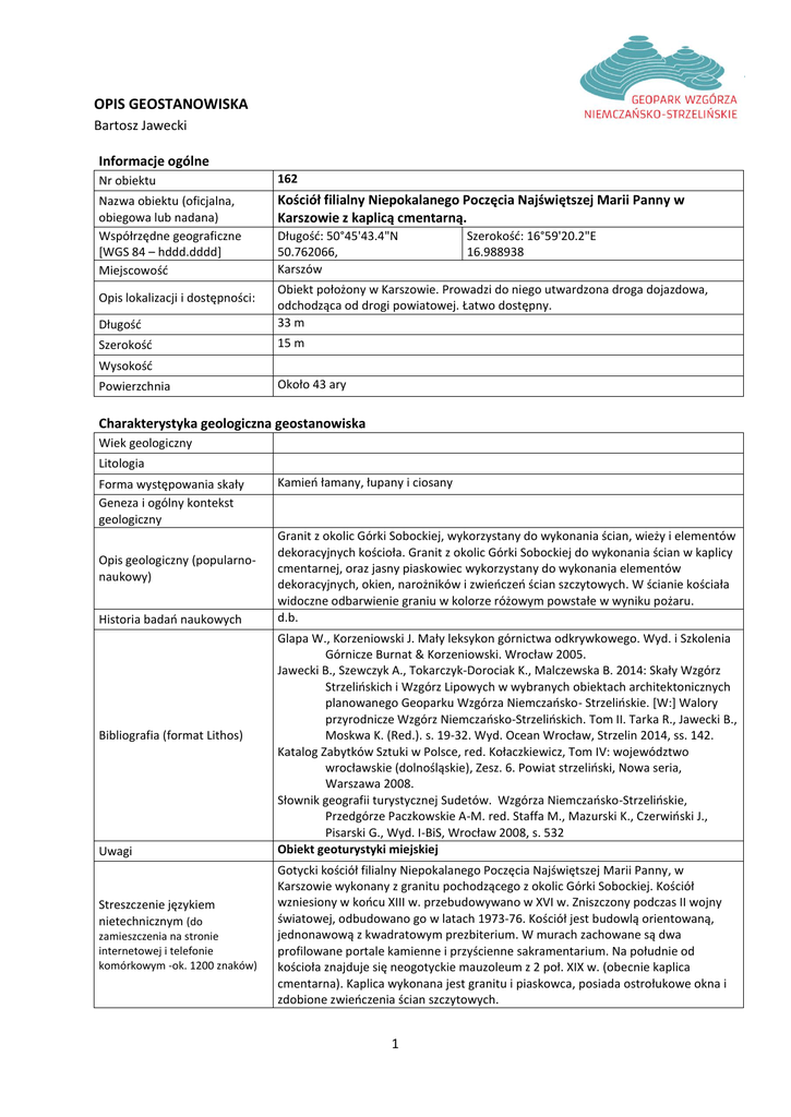 OPIS GEOSTANOWISKA Bartosz Jawecki Informacje ogólne Nr obiektu 162 Nazwa obiektu (oficjalna, obiegowa lub nadana) Współrzędne geograficzne [WGS 84 – hddd.dddd] Miejscowość Kościół filialny Niepokalanego Poczęcia Najświętszej Marii Panny w Karszowie z kaplicą cmentarną. Długość: 50°45'43.4"N 50.762066, Karszów Szerokość: 16°59'20.2"E 16.988938 Długość Obiekt położony w Karszowie. Prowadzi do niego utwardzona droga dojazdowa, odchodząca od drogi powiatowej. Łatwo dostępny. 33 m Szerokość 15 m Opis lokalizacji i dostępności: Wysokość Powierzchnia Około 43 ary Charakterystyka geologiczna geostanowiska Wiek geologiczny Litologia Forma występowania skały Geneza i ogólny kontekst geologiczny Opis geologiczny (popularnonaukowy) Historia badań naukowych Bibliografia (format Lithos) Uwagi Streszczenie językiem nietechnicznym (do zamieszczenia na stronie internetowej i telefonie komórkowym -ok. 1200 znaków) Kamień łamany, łupany i ciosany Granit z okolic Górki Sobockiej, wykorzystany do wykonania ścian, wieży i elementów dekoracyjnych kościoła. Granit z okolic Górki Sobockiej do wykonania ścian w kaplicy cmentarnej, oraz jasny piaskowiec wykorzystany do wykonania elementów dekoracyjnych, okien, narożników i zwieńczeń ścian szczytowych. W ścianie kościała widoczne odbarwienie graniu w kolorze różowym powstałe w wyniku pożaru. d.b. Glapa W., Korzeniowski J. Mały leksykon górnictwa odkrywkowego. Wyd. i Szkolenia Górnicze Burnat & Korzeniowski. Wrocław 2005. Jawecki B., Szewczyk A., Tokarczyk-Dorociak K., Malczewska B. 2014: Skały Wzgórz Strzelińskich i Wzgórz Lipowych w wybranych obiektach architektonicznych planowanego Geoparku Wzgórza Niemczańsko- Strzelińskie. [W:] Walory przyrodnicze Wzgórz Niemczańsko-Strzelińskich. Tom II. Tarka R., Jawecki B., Moskwa K. (Red.). s. 19-32. Wyd. Ocean Wrocław, Strzelin 2014, ss. 142. Katalog Zabytków Sztuki w Polsce, red. Kołaczkiewicz, Tom IV: województwo wrocławskie (dolnośląskie), Zesz. 6. Powiat strzeliński, Nowa seria, Warszawa 2008. Słownik geografii turystycznej Sudetów. Wzgórza Niemczańsko-Strzelińskie, Przedgórze Paczkowskie A-M. red. Staffa M., Mazurski K., Czerwiński J., Pisarski G., Wyd. I-BiS, Wrocław 2008, s. 532 Obiekt geoturystyki miejskiej Gotycki kościół filialny Niepokalanego Poczęcia Najświętszej Marii Panny, w Karszowie wykonany z granitu pochodzącego z okolic Górki Sobockiej. Kościół wzniesiony w końcu XIII w. przebudowywano w XVI w. Zniszczony podczas II wojny światowej, odbudowano go w latach 1973-76. Kościół jest budowlą orientowaną, jednonawową z kwadratowym prezbiterium. W murach zachowane są dwa profilowane portale kamienne i przyścienne sakramentarium. Na południe od kościoła znajduje się neogotyckie mauzoleum z 2 poł. XIX w. (obecnie kaplica cmentarna). Kaplica wykonana jest granitu i piaskowca, posiada ostrołukowe okna i zdobione zwieńczenia ścian szczytowych. 1 Wykorzystanie obiektu Wykorzystanie obiektu do celów edukacyjnych(czego Wykorzystanie skał Wzgórz Niemczańsko-Strzelińskich w obiektach architektonicznych, stanowiących dziedzictwo kulturowe regionu. można nauczyć w geostanowisku, m.in. proces, zjawisko, minerały, skały również zagadnienia z ekologii) Zagrożenia dla bezpieczeństwa osób odwiedzających geostanowisko Infrastruktura turystyczna w okolicy geostanowiska Wykorzystanie i zastosowanie skały oraz związane z nią aspekty kulturowe i historyczne brak brak Kościół filialny Niepokalanego Poczęcia Najświętszej Marii Panny w Karszowie, wykonany jest z granitu pochodzącego z okolic Górki Sobockiej. Kościół wzniesiony w końcu XIII w., wzmiankowany jest w 1335 r. W XVI w. został przebudowany. Podczas II wojny światowej został zniszczony, a odbudowano go w latach 1973-76. Kościół jest budowlą gotycką, orientowaną, murowaną, jednonawową z kwadratowym prezbiterium nakrytym sklepieniem krzyżowo-żebrowym. W murach zachowane są dwa profilowane portale kamienne i przyścienne sakramentarium. Od strony południowej kościoła zachowane jest ciekawe neogotyckie mauzoleum z 2 poł. XIXw. z prezbiterium skierowanym na południe, które służy obecnie za kaplicę cmentarną. Kaplica wykonana jest granitu i piaskowca. W kościele i kaplicy cmentarnej zastosowana granit, o różnym stopniu obróbki mechanicznej. W kościele wykorzystano kamień łamany pochodzący z naturalnie spękałych fragmentów skały granitowej (po prostej obróbce) występujące m.in. w wierzchniej warstwie złoża granitu w Górce Sobockiej, natomiast w mauzoleum (obecnie kaplicy cmentarnej) łamany (kamień któremu nadano kształt prostopadłościanu), granit wydobywany w głębszych częściach kamieniołomu. Waloryzacja geostanowiska Ekspozycja Dobrze wyeksponowany Ocena Atrakcyjności Turystycznej [0-10] Dostępność [0-4] Stopień zachowania [0-4] Wartości poza geologiczne [0-2] Ocena Atrakcyjności 4 Dydaktycznej [0-10] Ocena Atrakcyjności Naukowej 4 [0-10] Dokumentacja graficzna 2 x Wymagający przygotowania 4 4 1 Rysunek 1. Kościół filialny Niepokalanego Poczęcia Najświętszej Marii Panny w Karszowie z kaplicą cmentarną. Rysunek 2. Kościół filialny Niepokalanego Poczęcia Najświętszej Marii Panny w Karszowie - widok ogólny 3 Rysunek 4. Portal w ścianie prezbiterium Rysunek 3. Narożnik ściany kościoła wykonany z ciosanego granitu. Rysunek 5. Ściana kościoła wykonana z kamienia łamanego, z fragmentami granitu odbarwionego na różowo w wyniku pożaru. 4 Rysunek 6. Neogotyckie mauzoleum z 2 poł. XIX w. (obecnie kaplica cmentarna). Rysunek 7. Wykonane z piaskowca, ostrołukowe okna mauzoleum (obecnie kaplicy cmentarnej). Rysunek 8. Ściana Mauzoleum wykonana z kamienia łupanego i ciosanego. Po lewej stronie granit, po prawej piaskowiec. 5