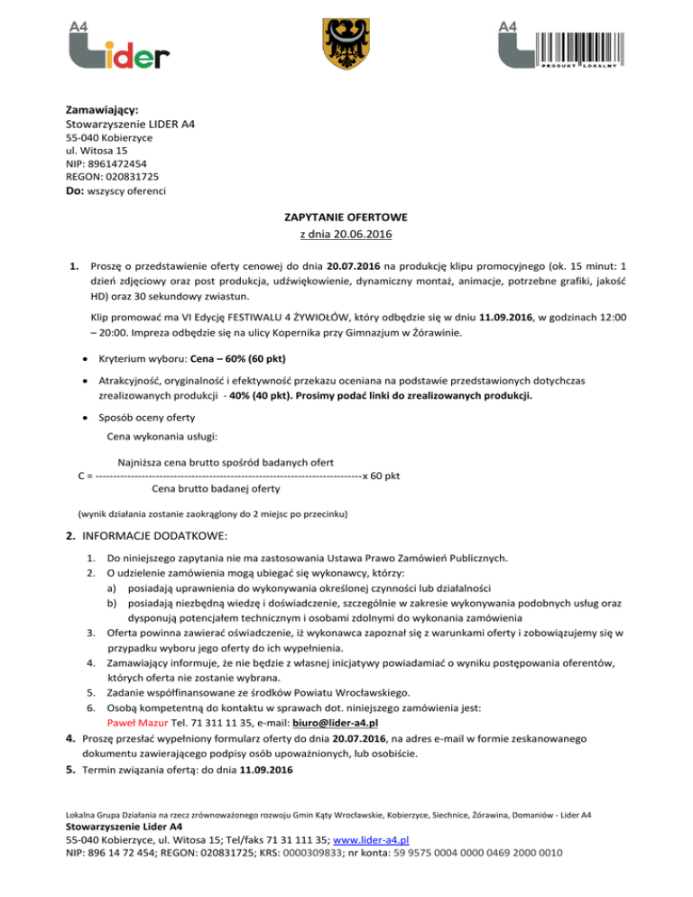 Zamawiający: Stowarzyszenie LIDER A4 55-040 Kobierzyce ul. Witosa 15 NIP: 8961472454 REGON: 020831725 Do: wszyscy oferenci ZAPYTANIE OFERTOWE z dnia 20.06.2016 1. Proszę o przedstawienie oferty cenowej do dnia 20.07.2016 na produkcję klipu promocyjnego (ok. 15 minut: 1 dzień zdjęciowy oraz post produkcja, udźwiękowienie, dynamiczny montaż, animacje, potrzebne grafiki, jakość HD) oraz 30 sekundowy zwiastun. Klip promować ma VI Edycję FESTIWALU 4 ŻYWIOŁÓW, który odbędzie się w dniu 11.09.2016, w godzinach 12:00 – 20:00. Impreza odbędzie się na ulicy Kopernika przy Gimnazjum w Żórawinie. Kryterium wyboru: Cena – 60% (60 pkt) Atrakcyjność, oryginalność i efektywność przekazu oceniana na podstawie przedstawionych dotychczas zrealizowanych produkcji - 40% (40 pkt). Prosimy podać linki do zrealizowanych produkcji. Sposób oceny oferty Cena wykonania usługi: Najniższa cena brutto spośród badanych ofert C = ---------------------------------------------------------------------------x 60 pkt Cena brutto badanej oferty (wynik działania zostanie zaokrąglony do 2 miejsc po przecinku) 2. INFORMACJE DODATKOWE: 1. Do niniejszego zapytania nie ma zastosowania Ustawa Prawo Zamówień Publicznych. 2. O udzielenie zamówienia mogą ubiegać się wykonawcy, którzy: a) posiadają uprawnienia do wykonywania określonej czynności lub działalności b) posiadają niezbędną wiedzę i doświadczenie, szczególnie w zakresie wykonywania podobnych usług oraz dysponują potencjałem technicznym i osobami zdolnymi do wykonania zamówienia 3. Oferta powinna zawierać oświadczenie, iż wykonawca zapoznał się z warunkami oferty i zobowiązujemy się w przypadku wyboru jego oferty do ich wypełnienia. 4. Zamawiający informuje, że nie będzie z własnej inicjatywy powiadamiać o wyniku postępowania oferentów, których oferta nie zostanie wybrana. 5. Zadanie współfinansowane ze środków Powiatu Wrocławskiego. 6. Osobą kompetentną do kontaktu w sprawach dot. niniejszego zamówienia jest: Paweł Mazur Tel. 71 311 11 35, e-mail: [email protected] 4. Proszę przesłać wypełniony formularz oferty do dnia 20.07.2016, na adres e-mail w formie zeskanowanego dokumentu zawierającego podpisy osób upoważnionych, lub osobiście. 5. Termin związania ofertą: do dnia 11.09.2016 Lokalna Grupa Działania na rzecz zrównoważonego rozwoju Gmin Kąty Wrocławskie, Kobierzyce, Siechnice, Żórawina, Domaniów - Lider A4 Stowarzyszenie Lider A4 55-040 Kobierzyce, ul. Witosa 15; Tel/faks 71 31 111 35; www.lider-a4.pl NIP: 896 14 72 454; REGON: 020831725; KRS: 0000309833; nr konta: 59 9575 0004 0000 0469 2000 0010 WZÓR OFERTY _____________________ Miejscowość, data Dane oferenta: …………………………………………………………… …………………………………………………………… W odpowiedzi na zapytanie ofertowe z dnia 20.06.2016 przedstawiam ofertę cenową na: 1. Produkcję filmu promującego V edycję „Festiwalu 4 Żywiołów” w dniu 11.09.2016r. Oferta cenowa:…………………………… PLN brutto, w tym VAT …………………………. ____________________________________________ Podpis/y osoby uprawnionej do reprezentacji oferenta Oświadczenia: Oświadczam, iż posiadam uprawnienia do wykonywania ww. czynności. Oświadczam, że posiadam niezbędną wiedzę i doświadczenie, oraz dysponują potencjałem niezbędnym do wykonania zamówienia. Oświadczam, że zapoznałem się z warunkami oferty i zobowiązujemy się w przypadku wyboru mojej oferty do ich wypełnienia. ______________________________________________ Podpis/y osoby uprawnionej do reprezentacji oferenta Lokalna Grupa Działania na rzecz zrównoważonego rozwoju Gmin Kąty Wrocławskie, Kobierzyce, Siechnice, Żórawina, Domaniów - Lider A4 Stowarzyszenie Lider A4 55-040 Kobierzyce, ul. Witosa 15; Tel/faks 71 31 111 35; www.lider-a4.pl NIP: 896 14 72 454; REGON: 020831725; KRS: 0000309833; nr konta: 59 9575 0004 0000 0469 2000 0010