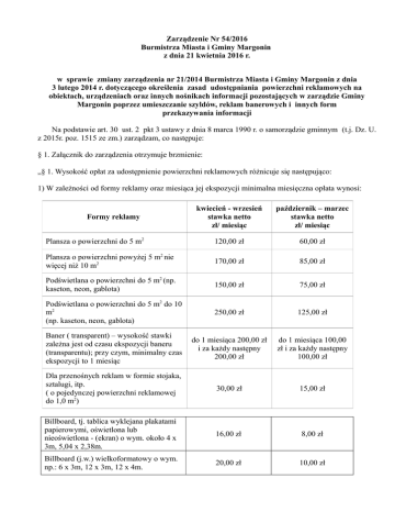 Zarządzenie Nr 54/2016 Burmistrza Miasta i Gminy Margonin z dnia 21 kwietnia 2016 r. w sprawie zmiany zarządzenia nr 21/2014 Burmistrza Miasta i Gminy Margonin z dnia 3 lutego 2014 r. dotyczącego określenia zasad udostępniania powierzchni reklamowych na obiektach, urządzeniach oraz innych nośnikach informacji pozostających w zarządzie Gminy Margonin poprzez umieszczanie szyldów, reklam banerowych i innych form przekazywania informacji Na podstawie art. 30 ust. 2 pkt 3 ustawy z dnia 8 marca 1990 r. o samorządzie gminnym (t.j. Dz. U. z 2015r. poz. 1515 ze zm.) zarządzam, co następuje: § 1. Załącznik do zarządzenia otrzymuje brzmienie: „§ 1. Wysokość opłat za udostępnienie powierzchni reklamowych różnicuje się następująco: 1) W zależności od formy reklamy oraz miesiąca jej ekspozycji minimalna miesięczna opłata wynosi: kwiecień - wrzesień stawka netto zł/ miesiąc październik – marzec stawka netto zł/ miesiąc Plansza o powierzchni do 5 m2 120,00 zł 60,00 zł Plansza o powierzchni powyżej 5 m2 nie więcej niż 10 m2 170,00 zł 85,00 zł Podświetlana o powierzchni do 5 m2 (np. kaseton, neon, gablota) 150,00 zł 75,00 zł Podświetlana o powierzchni do 5 m2 do 10 m2 (np. kaseton, neon, gablota) 250,00 zł 125,00 zł Baner ( transparent) – wysokość stawki zależna jest od czasu ekspozycji baneru (transparentu); przy czym, minimalny czas ekspozycji to 1 miesiąc do 1 miesiąca 200,00 zł i za każdy następny 200,00 zł do 1 miesiąca 100,00 zł i za każdy następny 100,00 zł Dla przenośnych reklam w formie stojaka, sztalugi, itp. ( o pojedynczej powierzchni reklamowej do 1,0 m2) 30,00 zł 15,00 zł Billboard, tj. tablica wyklejana plakatami papierowymi, oświetlona lub nieoświetlona - (ekran) o wym. około 4 x 3m, 5,04 x 2,38m. 16,00 zł 8,00 zł Billboard (j.w.) wielkoformatowy o wym. np.: 6 x 3m, 12 x 3m, 12 x 4m. 20,00 zł 10,00 zł Formy reklamy Słup reklamowy o pow. reklamowej około 10 m2, którego powierzchnia w przeważającej części przeznaczona jest do ekspozycji: a) plakatów komercyjnych, b) plakatów, afiszy promujących wydarzenia o charakterze artystycznym, sportowym, oświatowym. odpowiednio: dla a) 15,00 zł dla b) 10,00 zł odpowiednio: dla a) 15,00 zł dla b) 10,00 zł 2) Za umieszczenie ogłoszenia – reklamy w Margonińskim Informatorze Samorządowym „Czas na Margonin”, w zależności od ilości modułów: - Wielkość modułu wynosi 40 mm/80 mm Format ogłoszenia - reklamy Ogłoszenie wielkości 1 modułu Ogłoszenie wielkości do 9 modułów Stawka netto 12,30 zł ilość modułów x 12,30 zł Ogłoszenie wielkości > 9 modułów, do połowy strony gazety 350,00 zł Ogłoszenie wielkości 1 strony gazety 600,00 zł O miejscu zamieszczenia ogłoszenia – reklamy w „Czasie na Margonin” decyduje wydawca, uwzględniając kolejność przyjmowania zleceń oraz możliwości techniczne określonego numeru gazety. Publikacji nie podlegają ogłoszenia o treści politycznej i o podobnym charakterze”. 3) Za umieszczenie ogłoszenia – reklamy w telewizji kablowej administrowanej przez Gminę Margonin w zależności od czasu emisji, przy czym minimalny czas emisji wynosi 1 tydzień: Czas emisji ogłoszenia – reklamy Stawka netto 1 tydzień 50,00 zł 1 miesiąc 200,00 zł O terminie zamieszczenia ogłoszenia – reklamy w telewizji kablowej decyduje kolejność zleceń oraz możliwości techniczne w określonym terminie. 4) W określonych przypadkach, uzasadnionych w szczególności interesem społecznym, gospodarczym lub prawnym Gminy Margonin, Burmistrz Miasta i Gminy Margonin może odstąpić od warunków określonych w niniejszym zarządzeniu. § 2. Pozostała treść zarządzenia nie ulega zmianie. § 3. Zarządzenie obowiązuje z dniem podjęcia.