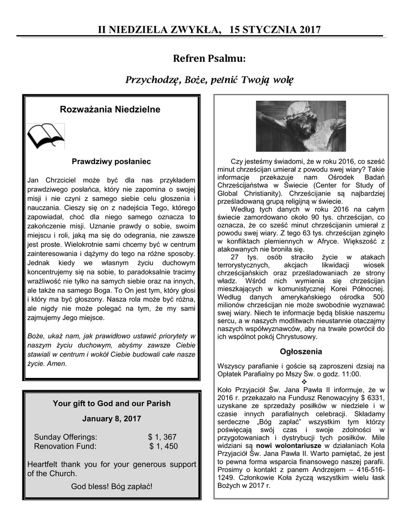 II NIEDZIELA ZWYKŁA, 15 STYCZNIA 2017 Refren Psalmu: Przychodzę, Boże, pełnić Twoją wolę Rozważania Niedzielne Prawdziwy posłaniec Jan Chrzciciel może być dla nas przykładem prawdziwego posłańca, który nie zapomina o swojej misji i nie czyni z samego siebie celu głoszenia i nauczania. Cieszy się on z nadejścia Tego, którego zapowiadał, choć dla niego samego oznacza to zakończenie misji. Uznanie prawdy o sobie, swoim miejscu i roli, jaką ma się do odegrania, nie zawsze jest proste. Wielokrotnie sami chcemy być w centrum zainteresowania i dążymy do tego na różne sposoby. Jednak kiedy we własnym życiu duchowym koncentrujemy się na sobie, to paradoksalnie tracimy wrażliwość nie tylko na samych siebie oraz na innych, ale także na samego Boga. To On jest tym, który głosi i który ma być głoszony. Nasza rola może być różna, ale nigdy nie może polegać na tym, że my sami zajmujemy Jego miejsce. Boże, ukaż nam, jak prawidłowo ustawić priorytety w naszym życiu duchowym, abyśmy zawsze Ciebie stawiali w centrum i wokół Ciebie budowali całe nasze życie. Amen. Your gift to God and our Parish January 8, 2017 Sunday Offerings: Renovation Fund: $ 1, 367 $ 1, 450 Heartfelt thank you for your generous support of the Church. God bless! Bóg zapłać! Czy jesteśmy świadomi, że w roku 2016, co sześć minut chrześcijan umierał z powodu swej wiary? Takie informacje przekazuje nam Ośrodek Badań Chrześcijaństwa w Świecie (Center for Study of Global Christianity). Chrześcijanie są najbardziej prześladowaną grupą religijną w świecie. Według tych danych w roku 2016 na całym świecie zamordowano około 90 tys. chrześcijan, co oznacza, że co sześć minut chrześcijanin umierał z powodu swej wiary. Z tego 63 tys. chrześcijan zginęło w konfliktach plemiennych w Afryce. Większość z atakowanych nie broniła się. 27 tys. osób straciło życie w atakach terrorystycznych, akcjach likwidacji wiosek chrześcijańskich oraz prześladowaniach ze strony władz. Wśród nich wymienia się chrześcijan mieszkających w komunistycznej Korei Północnej. Według danych amerykańskiego ośrodka 500 milionów chrześcijan nie może swobodnie wyznawać swej wiary. Niech te informacje będą bliskie naszemu sercu, a w naszych modlitwach nieustannie otaczajmy naszych współwyznawców, aby na trwałe powrócił do ich wspólnot pokój Chrystusowy. Ogłoszenia Wszyscy parafianie i goście są zaproszeni dzsiaj na Opłatek Parafialny po Mszy Św. o godz. 11:00. Koło Przyjaciół Św. Jana Pawła II informuje, że w 2016 r. przekazało na Fundusz Renowacyjny $ 6331, uzyskane ze sprzedaży posiłków w niedziele i w czasie innych parafialnych celebracji. Składamy serdeczne „Bóg zapłać” wszystkim tym którzy poświęcają swój czas i swoje zdolności w przygotowaniach i dystrybucji tych posiłków. Mile widziani są nowi wolontariusze w działaniach Koła Przyjaciół Św. Jana Pawła II. Warto pamiętać, że jest to pewna forma wsparcia finansowego naszej parafii. Prosimy o kontakt z panem Andrzejem – 416-5161249. Członkowie Koła życzą wszystkim wielu łask Bożych w 2017 r. 2nd SUNDAY IN ORDINARY TIME, JANUARY 15, 2017 Psalm Refrain: Here I am, Lord; I come to do your will Reflection ..... This Sunday we break from our reading of Matthew's Gospel (the primary Gospel for our current liturgical cycle, Cycle A) to read from John's Gospel. We heard Matthew's account of Jesus' baptism last Sunday, on the feast of the Baptism of the Lord. Today, we hear John the Baptist's testimony about Jesus as found in John's Gospel. John's Gospel differs from the other Gospels because John does not describe Jesus' baptism by John the Baptist. Instead, John the Baptist announces that he knows that Jesus is the Son of God. In today's reading, John the Baptist sees Jesus approaching and cries out, giving witness about who Jesus is. In John's testimony he says that he saw the Spirit descend upon Jesus. By this sign, John the Baptist knew that Jesus was the one who is to come after him. John the Baptist uses two titles for Jesus that are familiar to us. John calls Jesus the “Lamb of God” and the “Son of God.” By using these titles, John the Baptist identifies Jesus' ultimate purpose: to redeem sinful humanity. John the Baptist's testimony about Jesus clearly distinguishes John's baptism from the Baptism that Jesus will inaugurate. John baptizes with water; Jesus will baptize with the Holy Spirit. John also puts his practice of baptism in the context of Jesus' ministry. The purpose of John's baptism was to make Jesus known to Israel. John the Baptist's sense of purpose is clearly identified in this reading: he baptized in order to prepare for and make known the ministry of the One who was to follow. John's witness is an excellent example of what it means to be a disciple. By our Baptism, we are called to make Jesus known to all the world by our words and by the witness of our lives. INTENCJE MSZALNE / MASS INTENTIONS Intencja Rodziny Żywego Różańca na miesiąc styczeń: „O pokój na ziemi” Sunday, January 15, 2017 9:00 am For the repose of the soul of † Brian Anthony Machado 11:00 am Za † Bogusławę Taranda – Od rodziny Greber Dziękczynna za łaskę trzeźwości i wyzwolenia z alkoholizmu O szczęśliwą operację dla Czesława – Od siostry Zofii Za † Kazimierę i Bronisława Wszołek – Od syna z rodziną Wednesday, January 18, 2017 7:00 pm Za † Janinę, Czesława i Jana – Od rodzeństwa Friday, January 20, 2017 7:00 pm - Wolna Saturday, January 21, 2017 (Latin) 9:00 am - Wolna Sunday, January 22, 2017 9:00 am For parishioners 11:00 am Za † Bogdana i Eugenię, za † Zbigniewa Bogusławskiego i w intencji syna Adama O Boże błogosławieństwo, zdrowie i pomyślność dla Kaspra Za † rodziców Irenę i Mieczysława Mierzwa – Od córki z rodziną Like every year, we are organizing the annual parish Christmas lunch - “Oplat