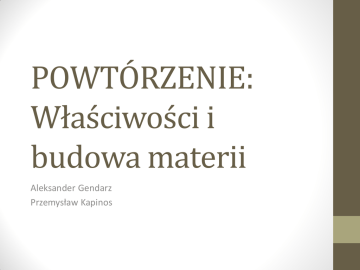 POWTÓRZENIE: Właściwości i budowa materii Aleksander Gendarz Przemysław Kapinos Trzy stany skupienia substancji Właściwości ciał stałych, cieczy i gazów Stan skupienia Zmiana objętości Zmiana kształtu Stały TRUDNO TRUDNO Ciekły TRUDNO ŁATWO Lotny (gazowy) ŁATWO ŁATWO Właściwości ciał stałych • Ciała stałe mają właściwości takie jak: - Kruchość - Sprężystość - Plastyczność Niektóre z nich dobrze przewodzą prąd i ciepło, inne są izolatorami. Właściwości cieczy • Ciecze odznaczają się właściwościami: - Przyjmują kształt naczynia, w którym się znajdują - Są przezroczyste - Pod wpływem temperatury zmieniają objętość - Przewodzą prąd elektryczny - Dobrze przewodzą ciepło Właściwości gazów • Właściwości gazów to: - Gazy przyjmują kształt naczynia, w którym się znajdują - Są ściśliwe i rozprężliwe, więc łatwo zmieniają objętość - Samorzutnie wypełniają całą dostępną im przestrzeń - Są złymi przewodnikami ciepła i prądu - Wywierają nacisk na ciała, które się w nich znajdują Masa i ciężar • Gęstość • Ciśnienie • Ciśnienie hydrostatyczne i atmosferyczne • Porównanie wartości ciśnienia atmosferycznego Ciało niebieskie Ciśnienie atmosferyczne (hPa) Wenus 93000 Ziemia 1013,25 Mars 7–9 Jowisz 70 Saturn 140 Tytan 1467 Uran 120 (poziom chmur) Neptun ~1010 (powierzchnia) Prawo Pascala • Prawo Archimedesa • Dziękujemy za uwagę