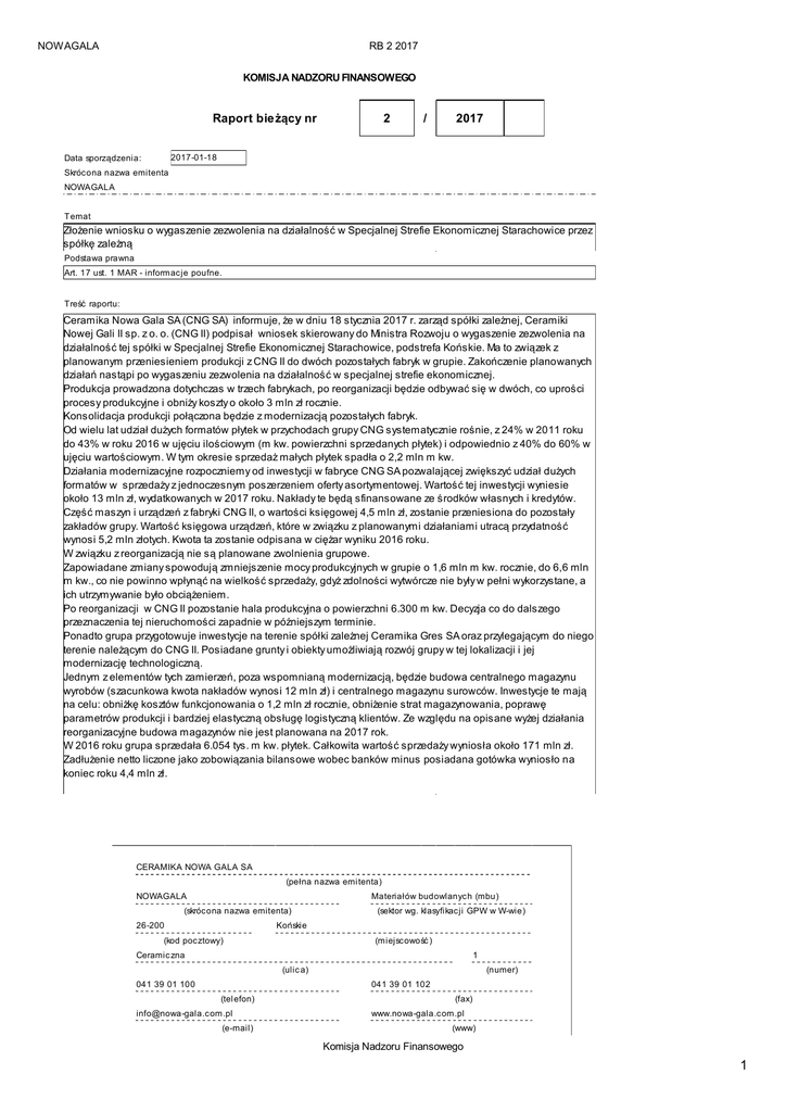 NOWAGALA RB 2 2017 KOMISJA NADZORU FINANSOWEGO Raport bie żący nr 2 / 2017 2017-01-18 Data sporządzenia: Skrócona nazwa emitenta NOWAGALA Temat Złożenie wniosku o wygaszenie zezwolenia na działalność w Specjalnej Strefie Ekonomicznej Starachowice przez spółkę zależną Podstawa prawna Art. 17 ust. 1 MAR - informacje poufne. Treść raportu: Ceramika Nowa Gala SA (CNG SA) informuje, że w dniu 18 stycznia 2017 r. zarząd spółki zależnej, Ceramiki Nowej Gali II sp. z o. o. (CNG II) podpisał wniosek skierowany do Ministra Rozwoju o wygaszenie zezwolenia na działalność tej spółki w Specjalnej Strefie Ekonomicznej Starachowice, podstrefa Końskie. Ma to związek z planowanym przeniesieniem produkcji z CNG II do dwóch pozostałych fabryk w grupie. Zakończenie planowanych działań nastąpi po wygaszeniu zezwolenia na działalność w specjalnej strefie ekonomicznej. Produkcja prowadzona dotychczas w trzech fabrykach, po reorganizacji będzie odbywać się w dwóch, co uprości procesy produkcyjne i obniży koszty o około 3 mln zł rocznie. Konsolidacja produkcji połączona będzie z modernizacją pozostałych fabryk. Od wielu lat udział dużych formatów płytek w przychodach grupy CNG systematycznie rośnie, z 24% w 2011 roku do 43% w roku 2016 w ujęciu ilościowym (m kw. powierzchni sprzedanych płytek) i odpowiednio z 40% do 60% w ujęciu wartościowym. W tym okresie sprzedaż małych płytek spadła o 2,2 mln m kw. Działania modernizacyjne rozpoczniemy od inwestycji w fabryce CNG SA pozwalającej zwiększyć udział dużych formatów w sprzedaży z jednoczesnym poszerzeniem oferty asortymentowej. Wartość tej inwestycji wyniesie około 13 mln zł, wydatkowanych w 2017 roku. Nakłady te będą sfinansowane ze środków własnych i kredytów. Część maszyn i urządzeń z fabryki CNG II, o wartości księgowej 4,5 mln zł, zostanie przeniesiona do pozostały zakładów grupy. Wartość księgowa urządzeń, które w związku z planowanymi działaniami utracą przydatność wynosi 5,2 mln złotych. Kwota ta zostanie odpisana w ciężar wyniku 2016 roku. W związku z reorganizacją nie są planowane zwolnienia grupowe. Zapowiadane zmiany spowodują zmniejszenie mocy produkcyjnych w grupie o 1,6 mln m kw. rocznie, do 6,6 mln m kw., co nie powinno wpłynąć na wielkość sprzedaży, gdyż zdolności wytwórcze nie były w pełni wykorzystane, a ich utrzymywanie było obciążeniem. Po reorganizacji w CNG II pozostanie hala produkcyjna o powierzchni 6.300 m kw. Decyzja co do dalszego przeznaczenia tej nieruchomości zapadnie w późniejszym terminie. Ponadto grupa przygotowuje inwestycje na terenie spółki zależnej Ceramika Gres SA oraz przylegającym do niego terenie należącym do CNG II. Posiadane grunty i obiekty umożliwiają rozwój grupy w tej lokalizacji i jej modernizację technologiczną. Jednym z elementów tych zamierzeń, poza wspomnianą modernizacją, będzie budowa centralnego magazynu wyrobów (szacunkowa kwota nakładów wynosi 12 mln zł) i centralnego magazynu surowców. Inwestycje te mają na celu: obniżkę kosztów funkcjonowania o 1,2 mln zł rocznie, obniżenie strat magazynowania, poprawę parametrów produkcji i bardziej elastyczną obsługę logistyczną klientów. Ze względu na opisane wyżej działania reorganizacyjne budowa magazynów nie jest planowana na 2017 rok. W 2016 roku grupa sprzedała 6.054 tys. m kw. płytek. Całkowita wartość sprzedaży wyniosła około 171 mln zł. Zadłużenie netto liczone jako zobowiązania bilansowe wobec banków minus posiadana gotówka wyniosło na koniec roku 4,4 mln zł. CERAMIKA NOWA GALA SA (pełna nazwa emi tenta) NOWAGALA Materiałów budowlanych (mbu) (skrócona nazwa emitenta) 26-200 (sektor wg. klasyfikacji GPW w W-wie) Końskie (kod pocztowy) (miejscowość ) Ceramic zna 1 (ulic a) 041 39 01 100 (numer) 041 39 01 102 (tel efon) [email protected] (e-mail) (fax) www.nowa-gala.com.pl (www) Komisja Nadzoru Finansowego 1 NOWAGALA RB 2 2017 658-10-02-540 290556362 (NIP) (REGON) PODPISY OSÓB REPREZENTUJĄCYCH SPÓŁKĘ Data Imię i Nazwisko Stanowisko/Funkcja 2017-01-18 Waldemar Piotrowski prezes zarządu 2017-01-18 Paweł Górnicki wiceprezes zarządu Podpis Komisja Nadzoru Finansowego 2