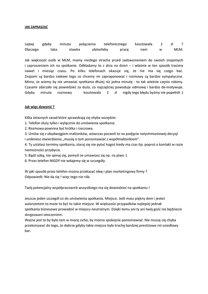 JAK ZAPRASZAĆ Lepiej gdyby minuta połączenia telefonicznego Dlaczego taka stawka ułatwiłaby pracę kosztowała nam 2 w zł ? MLM: Jak większośd osób w MLM, mamy niezłego stracha przed zadzwonieniem do swoich znajomych i zaproszeniem ich na spotkanie. Odkładamy to z dnia na dzieo – i właśnie w ten sposób tracimy nawet i miesiąc czasu. Po kilku telefonach okazuje się, że nie ma się czego bad. Znajomi są bardzo ciekawi tego co chcemy im zaproponowad i rozmowy są bardzo sympatyczne. Mimo, że wiemy by nie umawiad spotkania dłużej niż jedna minutę - to tak właśnie często robimy. Czasami zdarzało się powiedzied za dużo, co najczęściej powoduje odmowę i bardzo de-motywuje. Gdyby minuta rozmowy kosztowała 2 zł nigdy tego błędu byśmy nie popełnili :) Jak więc dzwonid ? Kilka żelaznych zasad które sprawdzają się chyba wszędzie: 1. Telefon służy tylko i wyłącznie do umówienia spotkania. 2. Rozmowa powinna byd krótka i rzeczowa. 3. Umów się z obydwojgiem małżonków, wówczas pozwoli to na podjęcie natychmiastowej decyzji i unikniesz stwierdzenia „muszę o tym porozmawiad z współmałżonkiem”. 4. Ty ustalasz terminy spotkania, staraj się nie pytad kogoś kiedy ma czas itp. poproś o kontakt w razie niemożności przybycia. 5. Bądź sobą, nie spinaj się, pomyśl że umawiasz się np. na piwo :) 6. Przez telefon NIGDY nie wdajemy się w szczegóły. W jaki sposób przez telefon można przekazad ideę i plan marketingowy firmy ? Odpowiedź: Nie da się ! więc tego nie rób. Twój potencjalny współpracownik wszystkiego ma się dowiedzied na spotkaniu ! Jeszcze jeden szczegół co do umówienia spotkania. Miejsce. Jeśli masz piękny dom i jesteś autorytetem to może to byd to takie miejsce. W większości przypadków najlepiej jednak spotkania biznesowe prowadzid w miejscu neutralnym. Dzięki temu ani ty ani twój gośd nie będziecie skrępowani otoczeniem. Ważne jest to by było tam w miarę cicho, by można spokojnie porozmawiad. Nie muszę cię chyba przekonywad do tego, że dobrze gdyby takie miejsce było trochę bardziej prestiżowe niż osiedlowy bar. Wskazówki: - - - Dodatkowa praca – najlepiej sprawdzają się te wyróżnione Właśnie podjąłem dodatkową pracę i pomyślałem również o Tobie. Powiedz czy jesteś zainteresowany. Wiem, że jakiś czas temu byłeś zainteresowany podjęciem dodatkowej pracy, udało Ci się już coś znaleźd?? Nie - to się świetnie składa, bo mój znajomy miałby coś ciekawego dla Ciebie świetną propozycję. Tak – o jaka szkoda, bo mój znajomy miałby dla Ciebie świetną propozycję. Dostałem propozycję nietypowej pracy i chciałbym poznad Twoją opinię na ten temat. (sposób bardzo niebezpieczny, pytanie takie kierujemy do osób o dużym autorytecie) Wiem, że Twoja żona poszukuje pracy, mój znajomy miałby dla niej propozycję, którą byd może będzie zainteresowana. Mój znajomy poszukuję ludzi chętnych do pracy. Nie znasz kogoś kto mógłby byd zainteresowany podjęciem dodatkowego zajęcia. To nie jest rozmowa na telefon. Kiedy możemy się spotkad, może dzisiaj, jutro ? Przykład zaproszenia na spotkanie: 1. Cześd dzwonie krótko ale w ważnej sprawie, powiedz mi czy możesz rozmawiad - Czy masz czas jutro o 17? czy pojutrze (w poniedziałek o 20) ? 2. - Słuchaj co robisz jutro o 17 ? no nie wiem a o co chodzi? - nie no to powiedz mi co robisz? nic ? to musimy się spotkad ! to co jutro 17 ? może zapytad ale o co chodzi ? Ja Ci wszystko wytłumaczę jak sie spotkamy Każdy w mniejszym lub większym stopniu boi się opinii innych, szczególnie jeśli chodzi o naszych znajomych. Jest to całkiem normalne, mimo że bez sensu. Przecież chcemy im dad szansę, pomóc zarobid pieniądze, zmienid życie, zdobyd więcej czasu. Pokazaniem tego robimy im przysługę ! To czy skorzystają z szansy to już ich sprawa. Nie przejmuj się odmowami, one są na porządku dziennym. Pracując jako Key Account Manager w firmie telekomunikacyjnej, co raczej wolałbym nazwad po prostu sprzedawcą, codziennie ponosiłem od kilkunastu do kilkudziesięciu porażek - odmów, by w koocu coś sprzedad. Pocieszę Cie w MLM tak tragicznie nie jest :) Do dzieła więc, dzwoo, umawiaj pierwsze spotkania – pokazuj plan ! I rób to systematycznie.