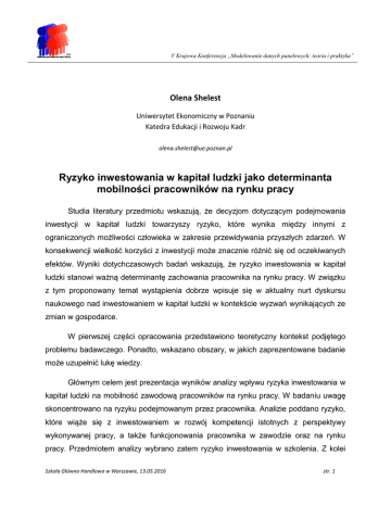 V Krajowa Konferencja „Modelowanie danych panelowych: teoria i praktyka” Olena Shelest Uniwersytet Ekonomiczny w Poznaniu Katedra Edukacji i Rozwoju Kadr [email protected] Ryzyko inwestowania w kapitał ludzki jako determinanta mobilności pracowników na rynku pracy Studia literatury przedmiotu wskazują, że decyzjom dotyczącym podejmowania inwestycji w kapitał ludzki towarzyszy ryzyko, które wynika między innymi z ograniczonych możliwości człowieka w zakresie przewidywania przyszłych zdarzeń. W konsekwencji wielkość korzyści z inwestycji może znacznie różnić się od oczekiwanych efektów. Wyniki dotychczasowych badań wskazują, że ryzyko inwestowania w kapitał ludzki stanowi ważną determinantę zachowania pracownika na rynku pracy. W związku z tym proponowany temat wystąpienia dobrze wpisuje się w aktualny nurt dyskursu naukowego nad inwestowaniem w kapitał ludzki w kontekście wyzwań wynikających ze zmian w gospodarce. W pierwszej części opracowania przedstawiono teoretyczny kontekst podjętego problemu badawczego. Ponadto, wskazano obszary, w jakich zaprezentowane badanie może uzupełnić lukę wiedzy. Głównym celem jest prezentacja wyników analizy wpływu ryzyka inwestowania w kapitał ludzki na mobilność zawodową pracowników na rynku pracy. W badaniu uwagę skoncentrowano na ryzyku podejmowanym przez pracownika. Analizie poddano ryzyko, które wiąże się z inwestowaniem w rozwój kompetencji istotnych z perspektywy wykonywanej pracy, a także funkcjonowania pracownika w zawodzie oraz na rynku pracy. Przedmiotem analizy wybrano zatem ryzyko inwestowania w szkolenia. Z kolei Szkoła Główna Handlowa w Warszawie, 13.05.2016 str. 1 V Krajowa Konferencja „Modelowanie danych panelowych: teoria i praktyka” mobilność zawodowa w badaniu jest rozumiana jako skłonność pracownika do zmiany stanowiska lub miejsca pracy. Druga część opracowania zawiera opis metod i technik badawczych oraz charakterystykę wykorzystanych danych. Analiza empiryczna jest oparta na zbiorze danych pochodzącym z Brytyjskiego Badania Panelowego Gospodarstw Domowych (BHPS). W badaniu uwzględniono respondentów, którzy na moment udziału w poszczególnych edycjach BHPS znajdowali się w przedziale wiekowym 16-60 lat oraz posiadali zatrudnienie. Informacje o tym, czy respondent posiada zatrudnienie uzyskano na podstawie zdefiniowanego przez respondenta statusu bieżącej aktywności zawodowej. Pominięto respondentów, którzy przeszli na emeryturę, znajdowali się na urlopie macierzyńskim lub zajmowali się opieką nad członkiem rodziny, posiadali status studentów studiów dziennych, byli na zwolnieniu lekarskim, a także uczestniczyli w rządowych programach szkoleniowych. Z analizy wykluczono respondentów, którzy prowadzili własną działalność gospodarczą. Ponadto, pod uwagę brano pracowników zatrudnionych tylko w pełnym wymiarze czasu. Dodatkowym przyjętym ograniczeniem było posiadanie zatrudnienia w sektorze prywatnym. Zakres czasowy badania obejmuje lata 1991-2008. W celu oszacowania wartości ryzyka inwestowania w szkolenia wykorzystano model regresji wynagrodzeń w oparciu o równanie Mincera. Wpływ ryzyka inwestowania w szkolenia na mobilność oszacowano za pomocą modelu z efektami stałymi, w którym zmienna objaśniana – mobilność pracownika – ma charakter binarny. Przyjmuje ona wartość 1 w przypadku nastąpienia zdarzenia (zmiana pracy w roku poprzedzającym datę wywiadu) lub 0 w przeciwnym razie. Wyniki badania wykazały, że większe ryzyko inwestowania w szkolenia wiąże się ze wzrostem prawdopodobieństwa zmiany pracy przez pracownika. W ostatniej części opracowania omówiono wybrane ograniczenia występujące w przeprowadzonym badaniu empirycznym. Szkoła Główna Handlowa w Warszawie, 13.05.2016 str. 2